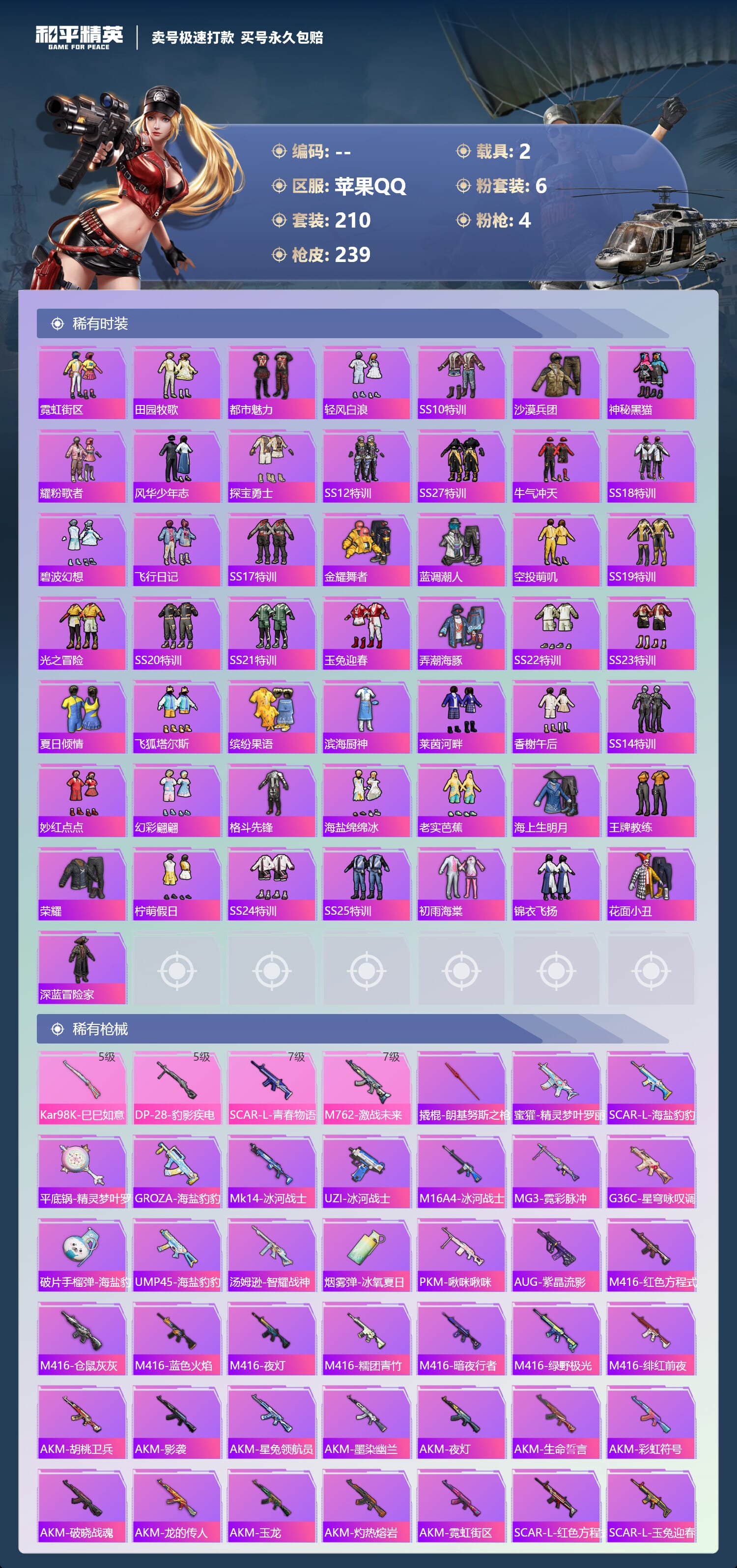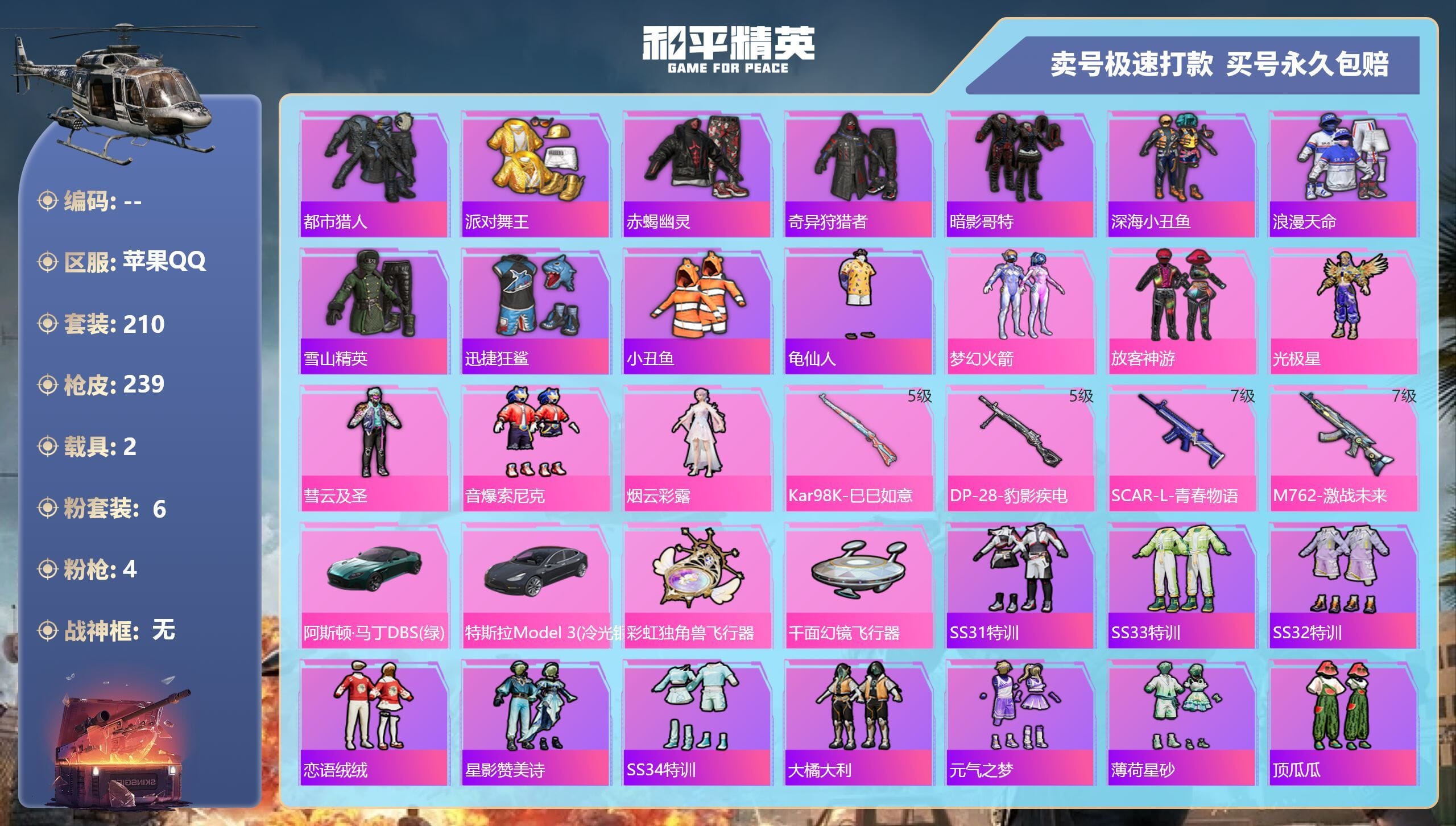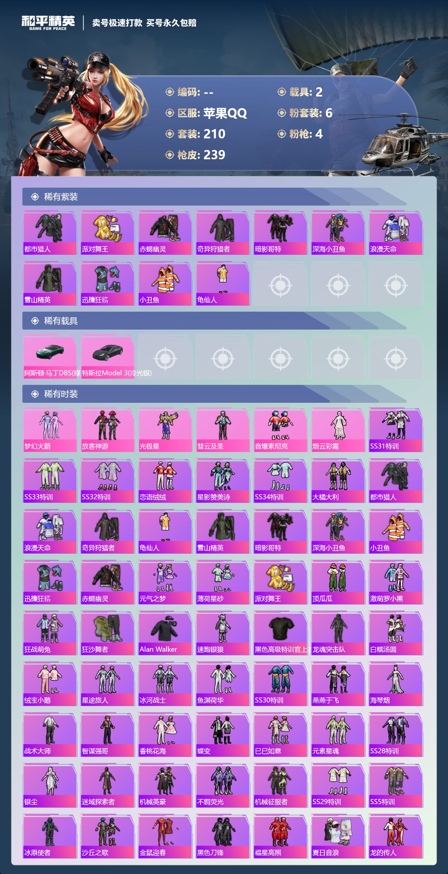 [12225376]实名: 可修改 时装数: 858 载具数: 2 呛械数: 239 战备数: 179 热门装扮: 奇异狩猎者梦幻火箭新101深海小丑鱼放客神游迅捷狂鲨花面小丑都市猎人彗云及圣恶魔喵喵激萌罗小黑奇迹天团神秘黑猫音爆索尼克赤蝎幽灵派对舞王烟云彩露光极