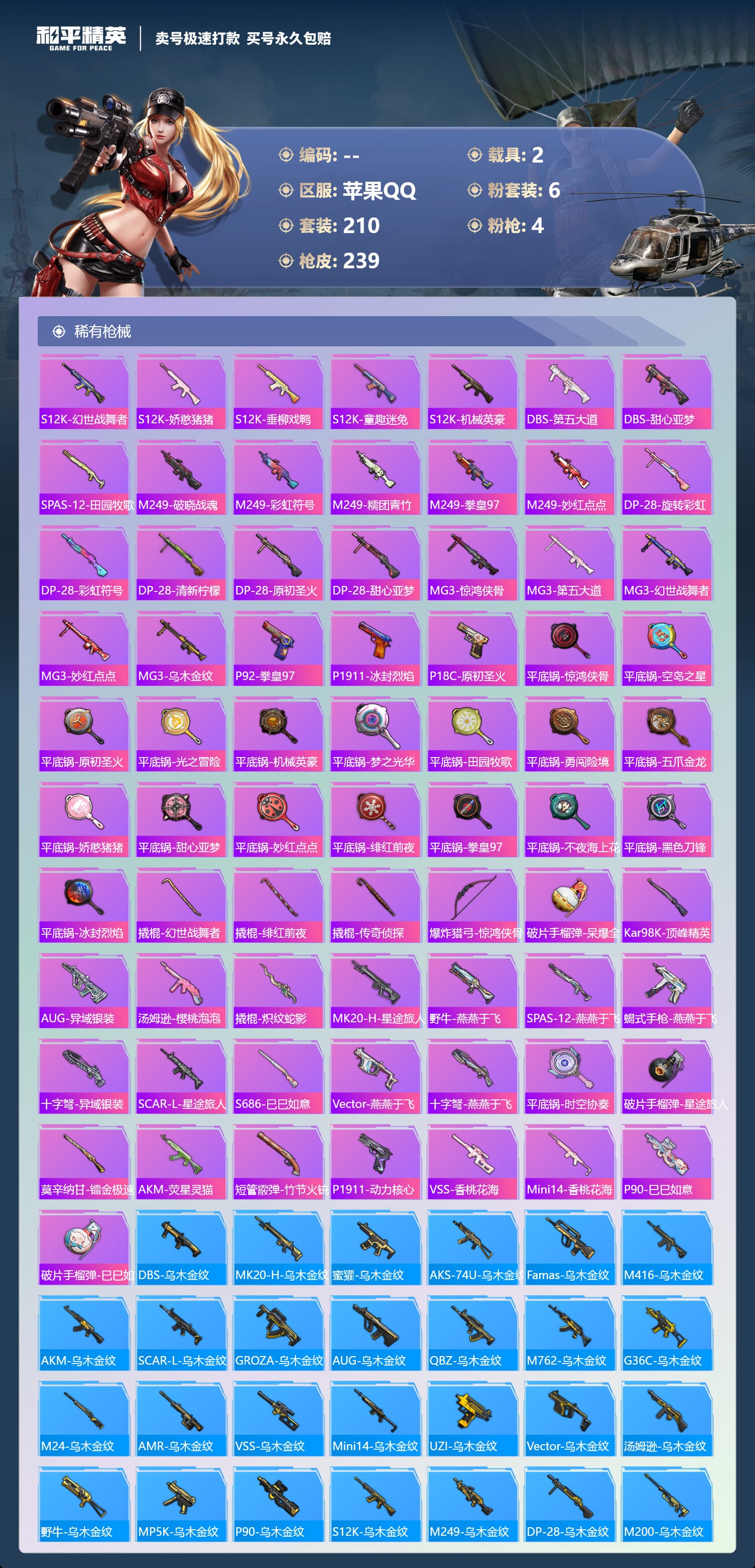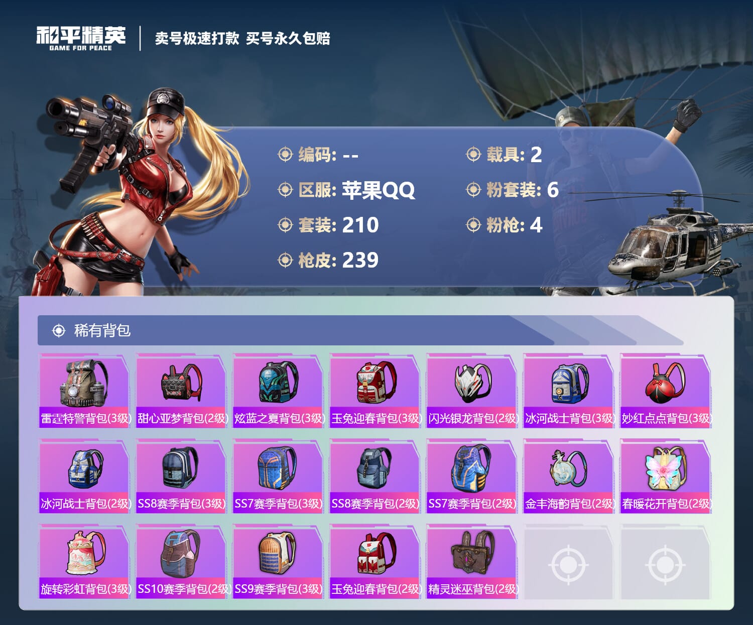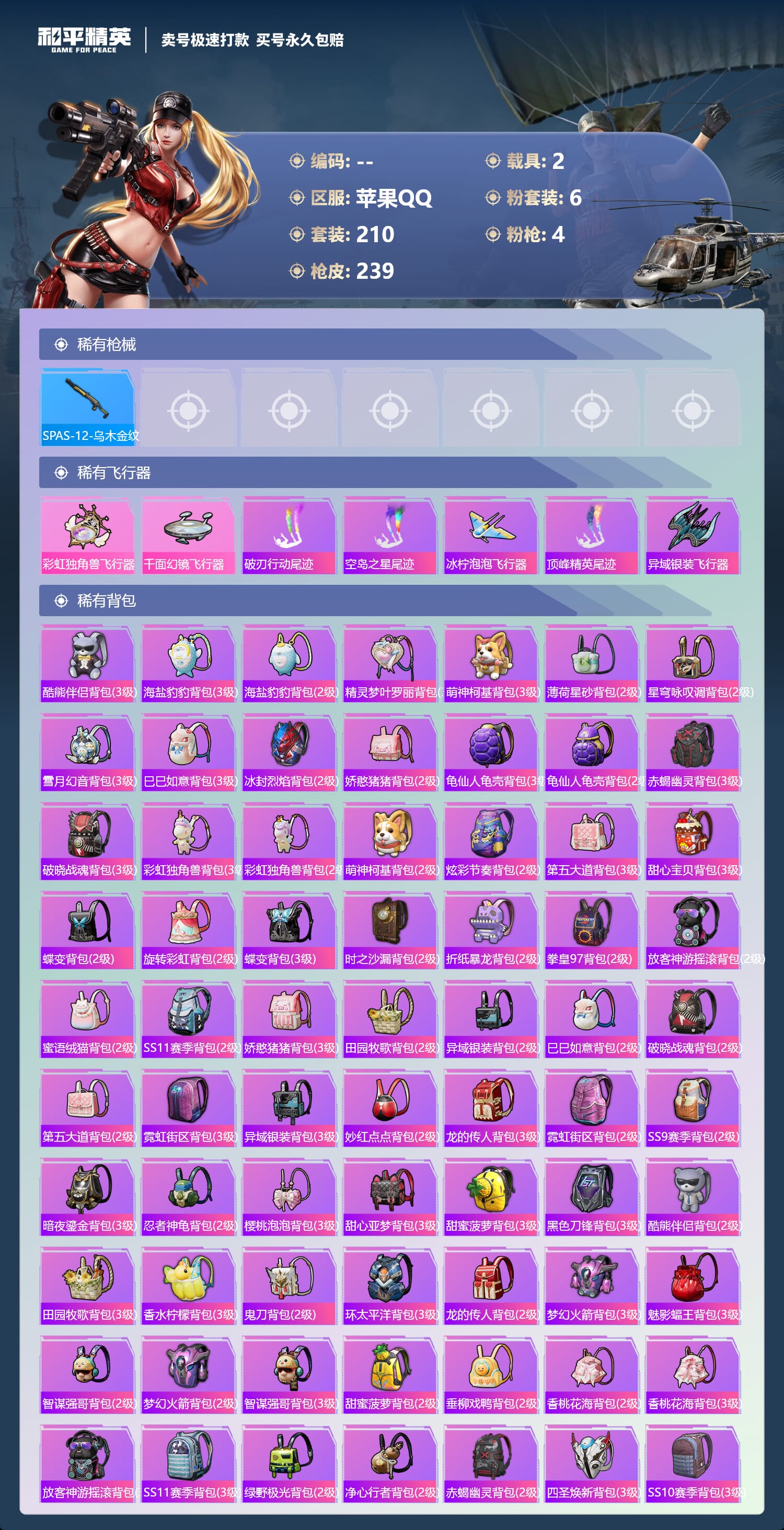 [12225376]实名: 可修改 时装数: 858 载具数: 2 呛械数: 239 战备数: 179 热门装扮: 奇异狩猎者梦幻火箭新101深海小丑鱼放客神游迅捷狂鲨花面小丑都市猎人彗云及圣恶魔喵喵激萌罗小黑奇迹天团神秘黑猫音爆索尼克赤蝎幽灵派对舞王烟云彩露光极