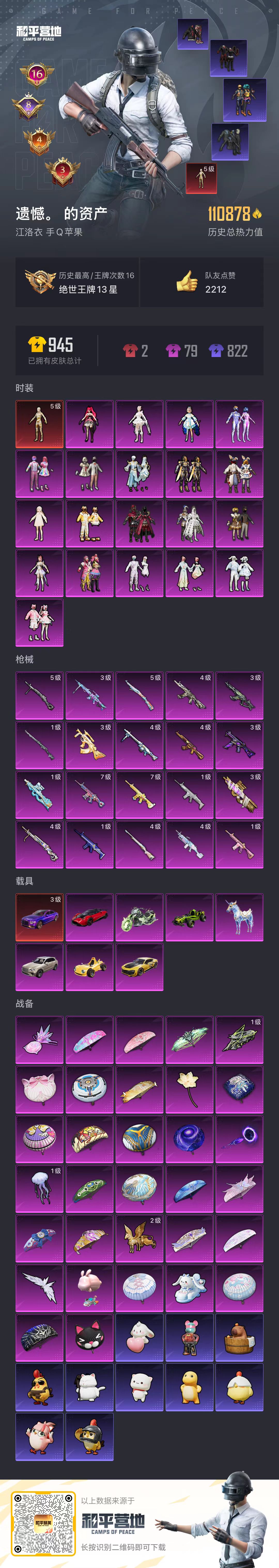 【和平精英】【txhp4615】20粉装,20特效呛,8载具,历史最高段位:绝世王牌13星 王牌印记16次 热力值:110878,172套装,248呛械,357装备,141战备;套装:沙丘之主-图卡盟,套装-甜心巧克力,套装-宝贝奶油派,套装-天使彩虹糖,套装-梦幻火箭,套装-缤纷油彩,套装-冰霜白皇,套装-童趣迷兔,套装-炙焰红王,角色-洛天依,套装-暖熊萌萌,套装-彩虹甜喵,角色-白勺歌姬,套装-萌物绒绒,套装-莲影清波,套装-镜光幻境,角色-圣堂之誓,套装-创世·救赎,套装-金丰海韵,角色-千金淑猫,角色-绯穹魔姬,套装-蓝色运动,套装-骑行爱好者,套装-冰川格斗者,套装-竞技名士,套装-长空猛禽,套装-漫步者,套装-竞技勇士朋克,套装-蓝色守护者,套装-海岛探路者,套装-旭日情侣,套装-赤蝎幽灵,套装-都市猎人,套装-浪漫天命,套装-贵族骑装,套装-鹰眼刺客,套装-冰冻风暴,套装-幻影武者,套装-蓝彩潮人,套装-怒火燎原,套装-魅力单车,套装-绮丽涂鸦,套装-耀眼新星,套装-都市漫游者,套装-破晓战魂,套装-热血青春,套装-沙漠兵团,套装-金耀舞者,套装-蓝调潮人,套装-暗影哥特,套装-弄潮海豚,套装-迅捷狂鲨,套装-呆萌铁蟹,套装-深海小丑鱼,套装-青涩时光,套装-缤纷果语,套装-龙魂突击队,套装-冰川特警,套装-小丑鱼,套装-恶魔人蛛,套装-粉红小猪,套装-破蛋小黄鸡,套装-疯狂小兔子,套装-北国孤狼,套装-ss6特训,套装-跃动心情,套装-ss7特训,套装-鹤鸣,套装-霓虹街区,套装-激萌罗小黑,套装-ss10特训,套装-潮萌小黄鸭,套装-ss8特训,套装-夏日音浪,套装-ss9特训,套装-牛气满满,套装-ss11特训,套装-萌趣颜团子,套装-战术大师,套装-ss18特训,套装-耀粉歌者,套装-ss13特训,套装-曼妙人鱼,套装-热情海星,套装-纯真浪花,套装-ss14特训,套装-天籁歌者,套装-电音精灵,套装-ss15特训,套装-ss17特训,套装-爆裂葡萄,套装-福星高照,套装-空投萌叽,套装-ss19特训,套装-ss20特训,套装-ss21特训,套装-俏皮奶喵,套装-暖心橘喵,套装-ss22特训,套装-轻风白浪,套装-王牌教练,套装-ss24特训,套装-华灯初上,套装-日照花林,套装-龟仙人,套装-涂山之恋,套装-ss25特训,套装-惊鸿侠骨,套装-锦衣飞扬,套装-晨曦薄雾,套装-龙的传人,套装-冰河战士,套装-ss26特训,套装-快闪甜心,套装-春光漫游,套装-空岛之星,套装-无暇誓言,套装-明鸳圣池,套装-贝斯之夜,玩偶服-超人强,套装-焰鹰斗篷,套装-幽夜迷踪,套装-幻羽潜行,套装-ss27特训,套装-恋语绒绒,套装-ss28特训,角色-蝶吟花词,角色-湖雨初晴,套装暗影刺翼,玩偶服-神气赞萌露比,角色-粉雾星云,角色-mark.06,套装-街头风暴,套装-海盐绵绵冰,套装-蝶变,套装-创世·追猎,套装-湖畔霞光,套装-粉日山川,套装-小熊娃娃,套装-ss29特训,套装-雏菊兔兔,角色-狂花道·雅典娜,套装-萝兰蝴蝶,角色-绯色魅影,角色-紫俏灵猫,套装-火种守卫者,套装-异域银装,角色-摩登魅猫,角色-都市丽猫,套装-星途旅人,角色-怀庆长公主,角色-临安公主,套装-ss30特训,套装-青团波波,套装-棉花软糖,套装-糖糖葫芦,套装-ss31特训,套装-鱼渊荷华,套装-石蕴玉辉,套装-燕燕于飞,套装-ss33特训,套装-ss32特训,套装-樱梦幻音,套装-顶瓜瓜,套装-大橘大利,套装-元气之梦,套装-ss34特训,套装-游乐,套装-薄荷星砂,套装-ss35特训,套装-ss36特训,套装-萌鸡速递;呛皮:7级scar-l-童趣迷兔,1级scar-l-青春物语,1级scar-l-纯梦嫁纱,scar-l-红色方程式,scar-l-夜灯,scar-l-炫彩节奏,scar-l-是爱神辣,scar-l-星途旅人,scar-l-海盐豹豹,4级akm-甜心宝贝,3级akm-幽焰骑士,akm-灼热熔岩,akm-影袭,akm-缤纷海域,akm-破晓战魂,akm-春暖花开,akm-霓虹街区,akm-涂鸦街区,akm-龙的传人,akm-江南烟雨,akm-霓彩脉冲,akm-绿洲时空,aug-耀粉歌者,aug-天降萌叽,aug-闲梦青缨,aug-异域银装,aug-紫晶流影,ac-val-乌木金纹,ac-val-彩虹甜喵,ac-val-天降萌叽,ac-val-闲梦青缨,ac-val-快闪甜心,ac-val-宇宙意志,m16a4-蓝色火焰,m16a4-红色方程式,m16a4-夜灯,m16a4-幻世战舞者,m16a4-冰河战士,m16a4-千金淑猫,1级m416-心之恋语,7级m416-暖熊萌萌,m416-夜灯,m416-蓝色火焰,m416-绯红前夜,m416-红色方程式,m416-神秘黑猫,m416-糯团青竹,mk47-洛神天依,mk47-乌木金纹,famas-突变脉冲,famas-霓彩脉冲,famas-乌木金纹,m762-甜心宝贝,m762-牛气冲天,m762-彩虹甜喵,m762-天降萌叽,m762-萌物绒绒,m762-雏菊兔兔,蜜獾-天降萌叽,蜜獾-糖糖葫芦,蜜獾-乌木金纹,3级groza-精灵之光,groza-影袭,groza-乌木金纹,q-神秘黑猫,q-洛神天依,q-萌萌彩虹球,q-纯真浪花,q-乌木金纹,g36c-乌木金纹,4级m24-莲影清波,m24-影袭,m24-奇异狩猎者,m24-炫彩节奏,m24-乌木金纹,awm-圣堂之誓,awm-焰鹰斗篷,awm-纯真浪花,5级kar98k-巳巳如意,kar98k-红色方程式,kar98k-影袭,kar98k-梦幻火箭,kar98k-炫彩节奏,kar98k-洛神天依,kar98k-六号树人,kar98k-顶峰精英,m200-惊鸿侠骨,m200-宇宙意志,m200-乌木金纹,1级莫辛纳甘-未来领航者,amr-镜光幻境,amr-鸡智如我,amr-乌木金纹,win94-乌木金纹,svd-霓彩脉冲,sks-迅猛狂鲨,sks-未来歌姬,m417-惊鸿侠骨,mk12-乌木金纹,slr-守护天翼,slr-璀璨流光,slr-金丰海韵,slr-霓彩脉冲,vss-香桃花海,vss-乌木金纹,mini14-穿刺龙虾,mini14-炫彩节奏,mini14-耀粉歌者,mini14-香桃花海,mini14-雏菊兔兔,mini14-鸡智如我,mk20-h-莲影清波,mk20-h-快闪甜心,mk20-h-星梦奇缘,mk20-h-星途旅人,mk20-h-糖糖葫芦,mk20-h-狂鲨锋刃,mk20-h-乌木金纹,mk14-童趣迷兔,mk14-冰河战士,mk14-薄荷星砂,uzi-红色方程式,uzi-影袭,uzi-天降萌叽,uzi-冰河战士,uzi-绝色倾城,uzi-啾咪啾咪,uzi-炫彩糖果,野牛-沙丘之主,