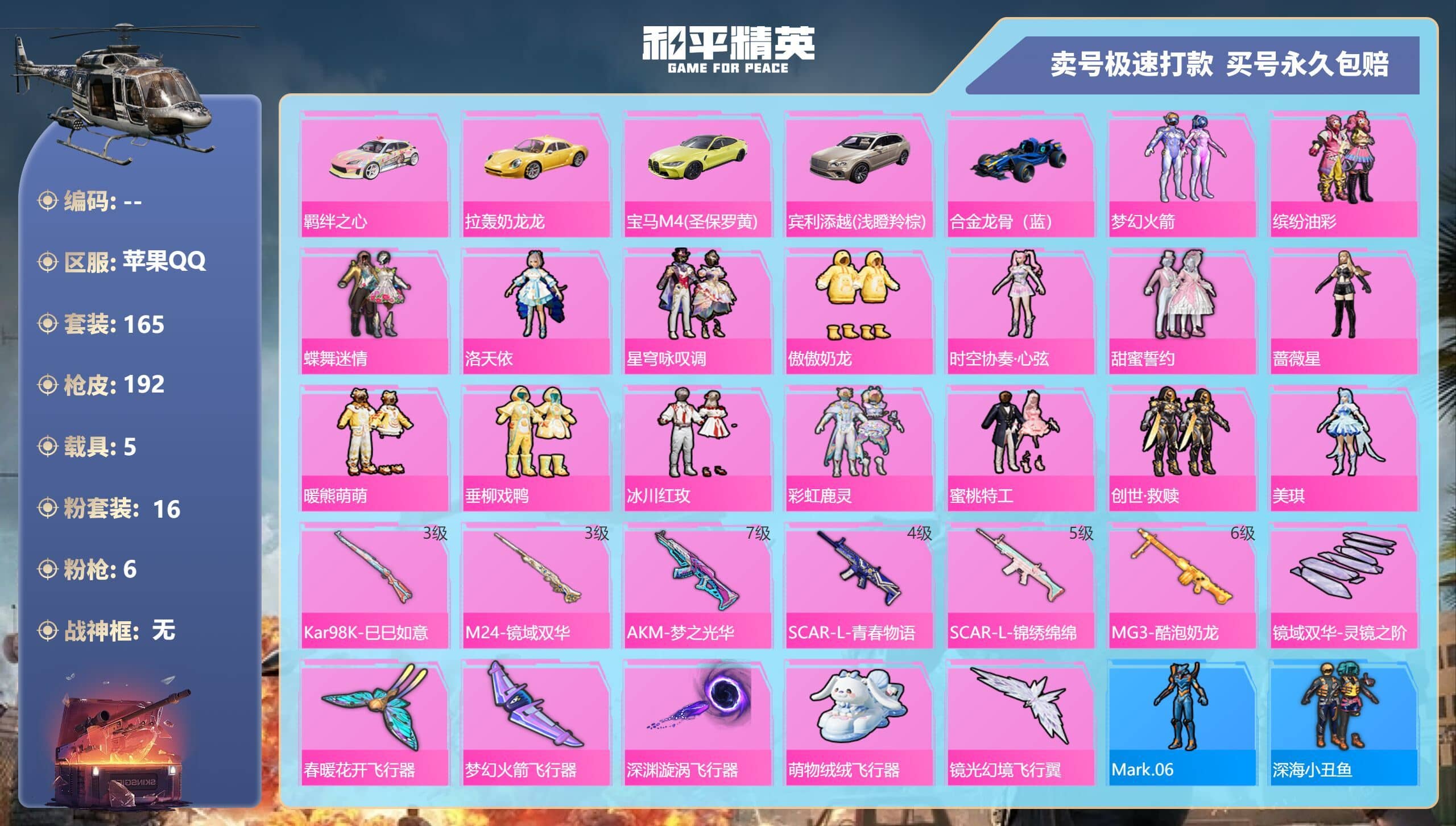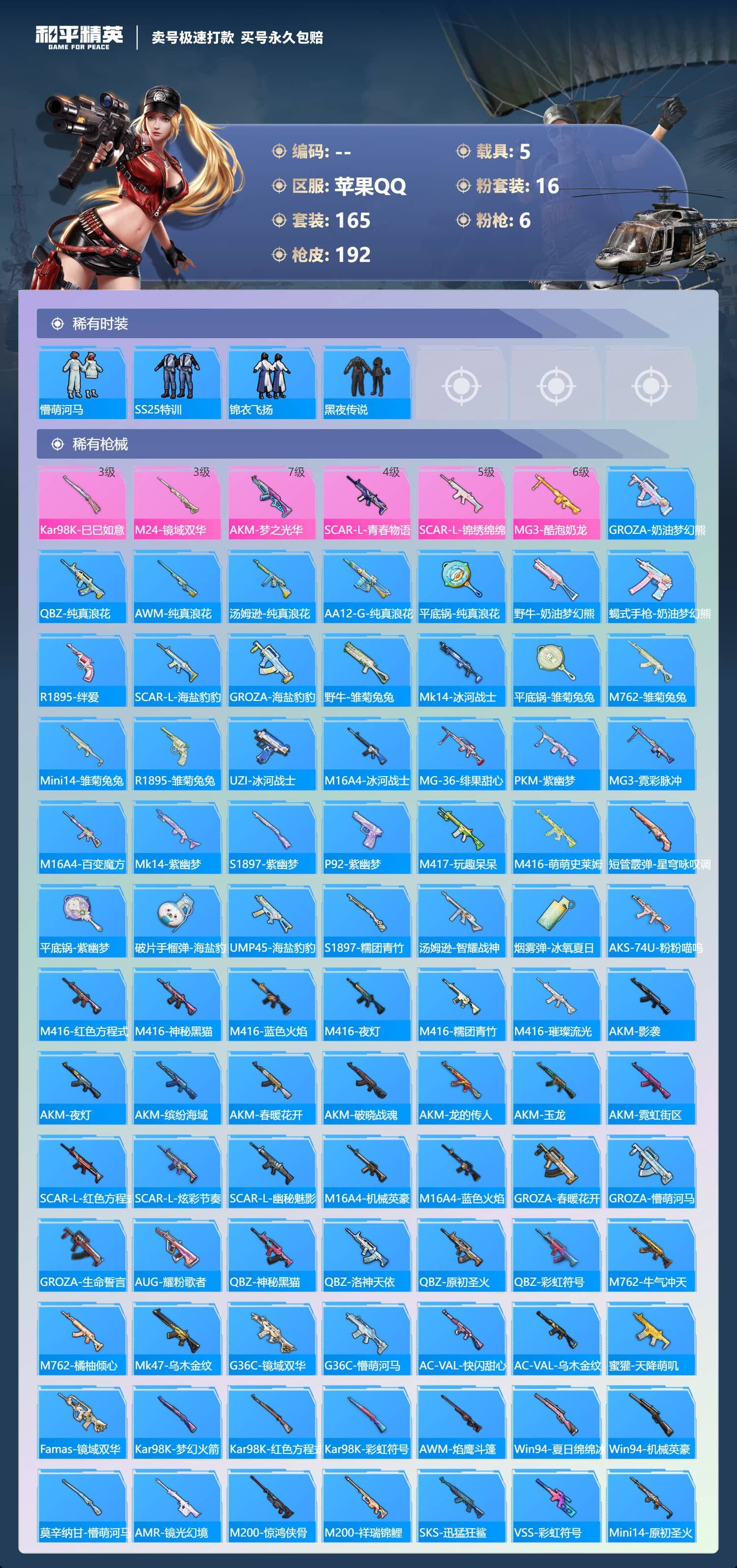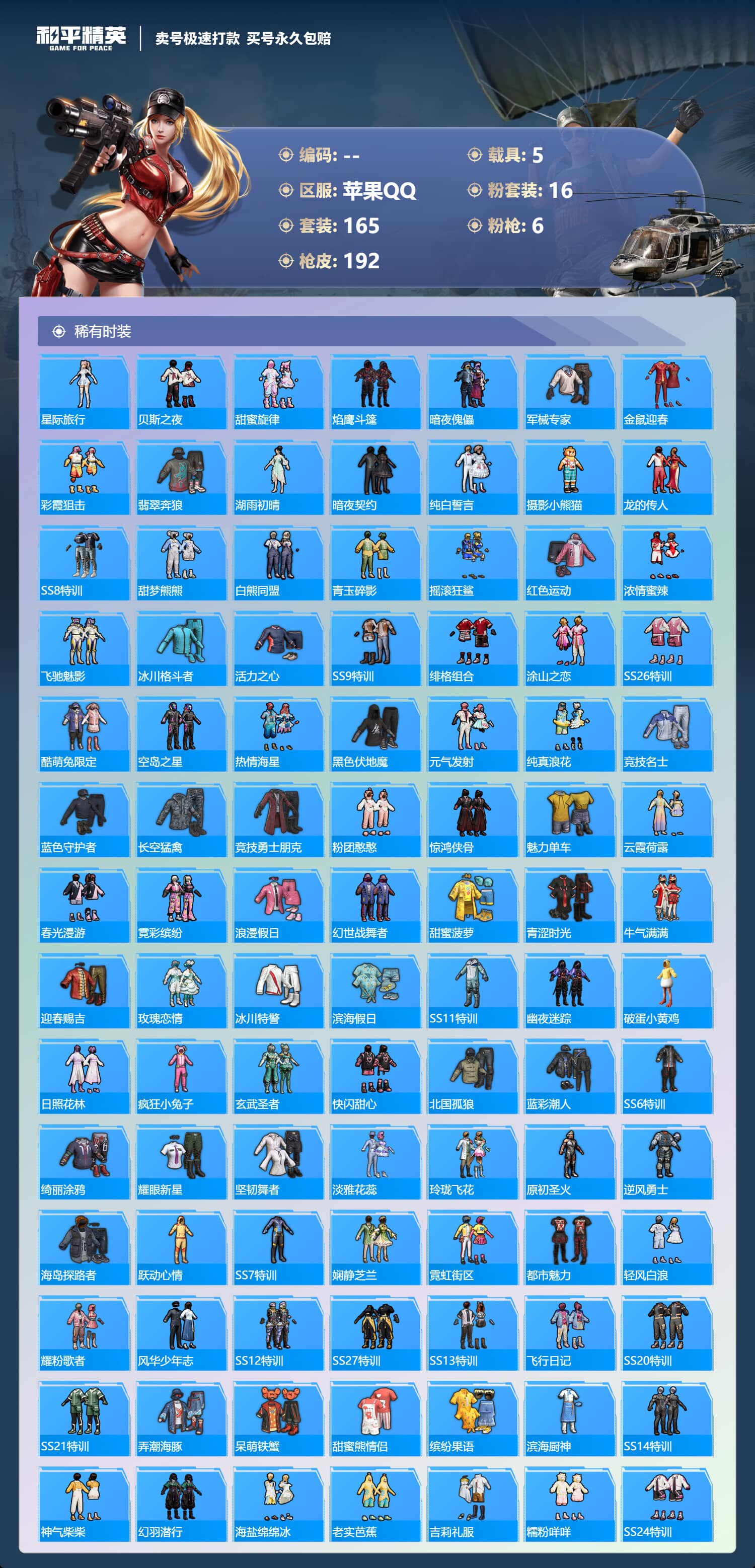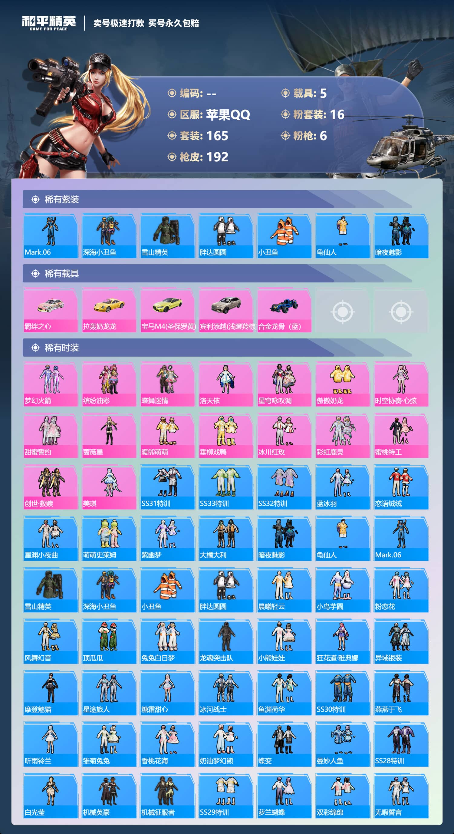 实名: 可修改 时装数: 608 载具数: 5 呛械数: 193 战备数: 160 热门装扮: 梦幻火箭新101蝶舞迷情呆萌铁蟹深海小丑鱼缤纷油彩甜蜜誓约蜜桃特工彩虹鹿灵洛天依暖熊萌萌垂柳戏鸭冰川红玫胖达圆圆兔兔白日梦暗夜魅影蔷薇星傲傲奶龙美琪创世·救赎时空