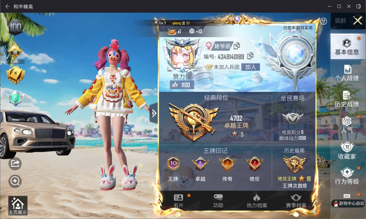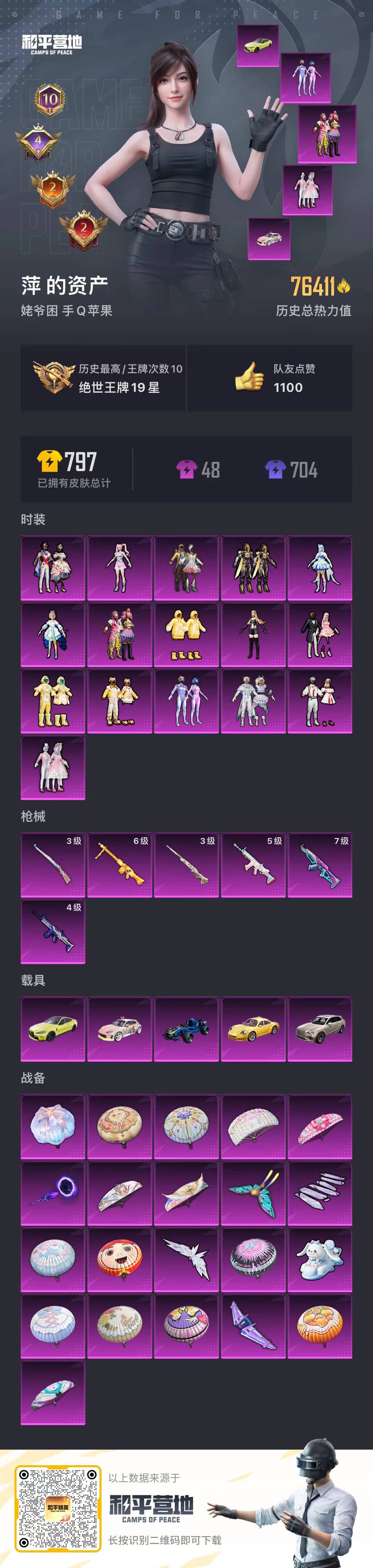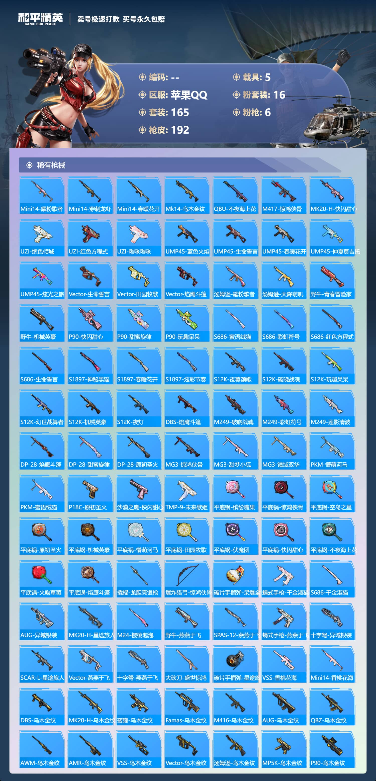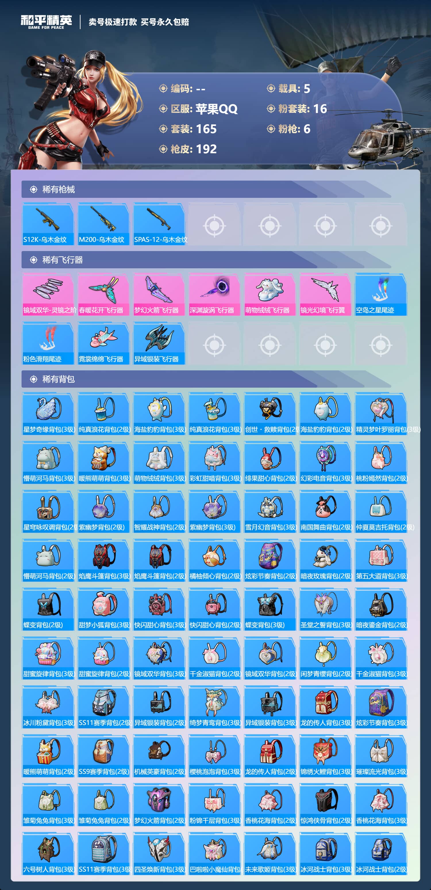 实名: 可修改 时装数: 608 载具数: 5 呛械数: 193 战备数: 160 热门装扮: 梦幻火箭新101蝶舞迷情呆萌铁蟹深海小丑鱼缤纷油彩甜蜜誓约蜜桃特工彩虹鹿灵洛天依暖熊萌萌垂柳戏鸭冰川红玫胖达圆圆兔兔白日梦暗夜魅影蔷薇星傲傲奶龙美琪创世·救赎时空