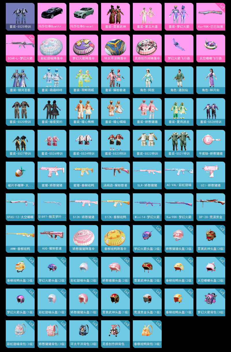 【和平精英】【lyhp17374】3粉装2特效呛2载具 梦幻火箭 第五大道 5级死噶梦幻火箭 玛莎拉蒂 3粉装,2特效呛,2载具,历史最高段位:荣耀皇冠ⅰ 王牌印记-1次 热力值:25598,66套装,65呛械,64装备,37战备;套装:套装-梦幻火箭,套装-霓裳武神,套装-第五大道,套装-特训学院,套装-红色运动,套装-蓝色运动,套装-白色伏地魔,套装-竞技名士,套装-深蓝色名流,套装-湖蓝色名流,套装-长空猛禽,套装-霸义无双,套装-黎明保卫者,套装-冷焰舞者,套装-沙漠毒蛇,套装-幻影武者,套装-蓝彩潮人,套装-魅力单车,套装-耀眼新星,套装-野性战心,套装-破晓战魂,套装-极地朋克,套装-幻世战舞者,套装-甜蜜菠萝,套装-缤纷果语,套装-冰川特警,套装-元素星魂,套装-极速红龙,套装-麻辣教官,套装-破蛋小黄鸡,套装-军械专家,套装-银河圣歌,套装-霓虹街区,套装-暗夜契约,套装-探宝勇士,套装-牛气满满,套装-牛气冲天,套装-耀粉歌者,套装-ss20特训,套装-ss21特训,套装-暖心熊熊,套装-萌趣咩咩,套装-娇憨猪猪,套装-夏雨游龙,套装-荷畔雨呱,套装-暖心橘喵,角色-李,角色-林月如,角色-阿奴,角色-酒剑仙,套装-玉兔迎春,套装-ss22特训,套装-光之冒险,套装-ss23特训,套装-王牌教练,套装-ss24特训,套装-龟仙人,套装-ss25特训,套装-龙的传人,套装-ss26特训,套装-空岛之星,套装-ss27特训,套装-ss28特训,套装-海盐绵绵冰,套装-顶瓜瓜,套装-ss36特训;呛皮:蜜獾-娇憨猪猪,蜜獾-垂柳戏鸭,蜜獾-天降萌叽,蜜獾-乌木金纹,q-彩虹符号,akm-破晓战魂,akm-彩虹符号,akm-龙的传人,5级scar-l-梦幻火箭,scar-l-红色方程式,scar-l-玉兔迎春,scar-l-海盐豹豹,aug-耀粉歌者,aug-天降萌叽,ac-val-乌木金纹,ac-val-彩虹甜喵,ac-val-天降萌叽,famas-乌木金纹,m416-蓝色火焰,mk47-乌木金纹,m762-天降萌叽,m16a4-幻世战舞者,amr-乌木金纹,3级kar98k-巳巳如意,kar98k-红色方程式,kar98k-梦幻火箭,m24-炫彩节奏,m24-乌木金纹,莫辛纳甘-乌木金纹,awm-垂柳戏鸭,mk12-乌木金纹,mk14-乌木金纹,slr-娇憨猪猪,mini14-梦幻火箭,sks-炫彩节奏,ump45-蓝色火焰,ump45-生命誓言,ump45-涂山之恋,ump45-极意拳锋,uzi-娇憨猪猪,uzi-天降萌叽,汤姆逊-耀粉歌者,汤姆逊-炫彩节奏,汤姆逊-天降萌叽,p90-玩趣呆呆,p90-乌木金纹,mp5k-乌木金纹,spas-12-太空嘟嘟,s12k-娇憨猪猪,s12k-垂柳戏鸭,s12k-幻世战舞者,s12k-玩趣呆呆,s1897-炫彩节奏,s1897-精灵梦叶罗丽,s686-红色方程式,dbs-乌木金纹,mg3-幻世战舞者,mg3-乌木金纹,m249-彩虹符号,dp-28-荒漠赏金,平底锅-娇憨猪猪,平底锅-光之冒险,撬棍-幻世战舞者,破片手留单-太空嘟嘟,破片手留单-爆破雪人;载具:玛莎拉蒂quattropte夜幕蓝,玛莎拉蒂grecale薄荷绿;降落伞:梦幻火箭飞行器,太空嘟嘟飞行器; 详情看图