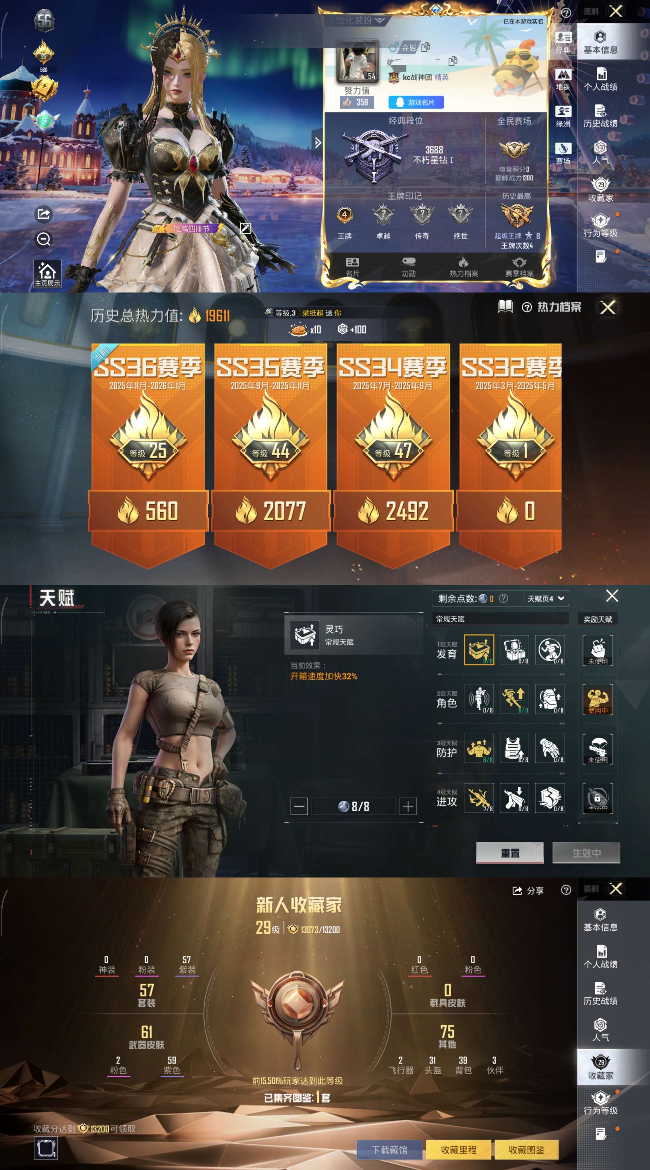 xq774【身法素材号-1角色1飞行器 地铁天赋已开 (送王者115皮2传说3000星元币)0违规2太阳】安卓q区无二次-2特效呛-19611热力值-4王牌印记-57套装-70呛皮【特效呛等级】:kar98k-巳巳如意五级【稀有武器皮肤】: scar-l-海盐豹豹 groza-海盐豹豹 kar98k-巳巳如意 pkm-啾咪啾咪 m416-红色方程式 m416-蓝色火焰 akm-破晓战魂 akm