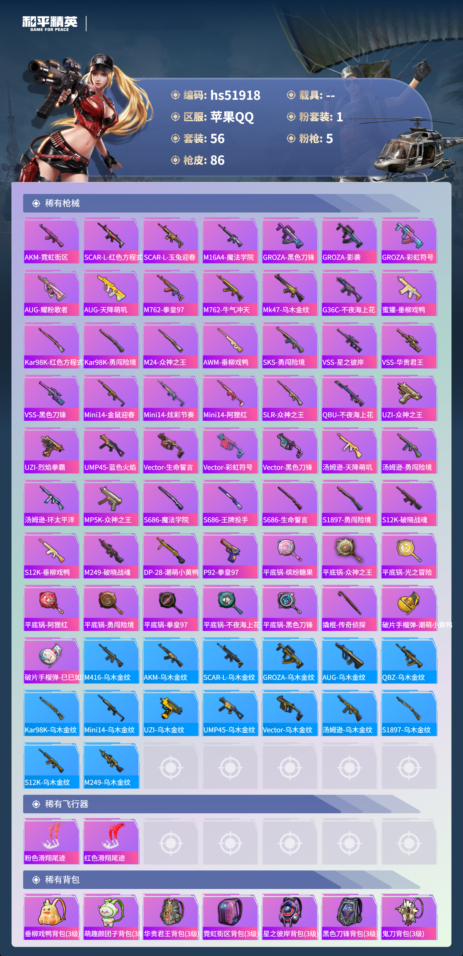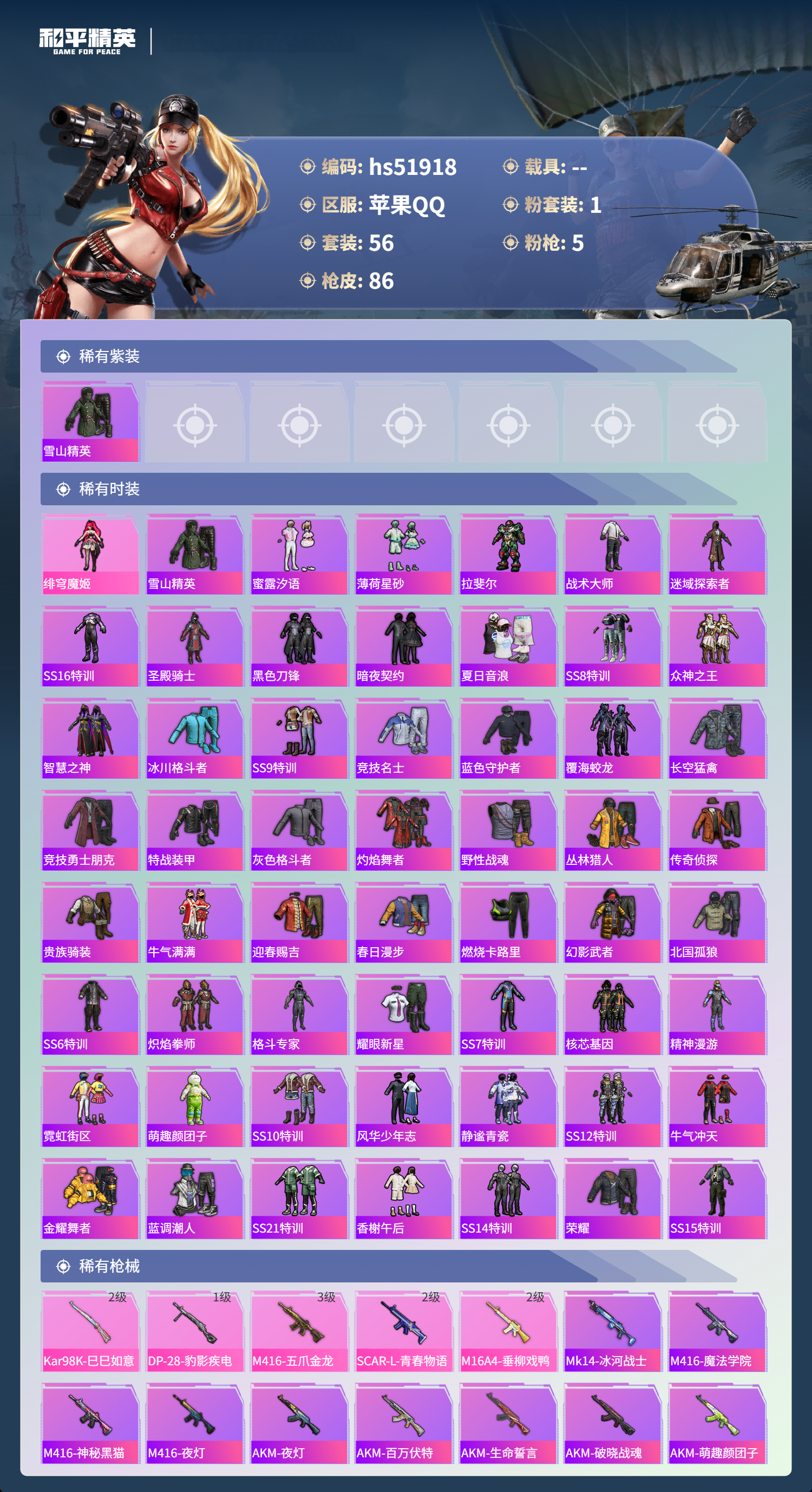 hs51918 苹果手q-0王牌印记-1粉装-5特效呛-23680热力值-56套装-86呛皮【1粉装】角色-绯穹魔姬【5特效呛】m416-五爪金龙/3级m16a4-垂柳戏鸭/2级kar98k-巳巳如意/2级scar-l-青春物语/2级dp-28-豹影疾电/1级【1稀有紫装】雪山精英【56稀有时装】绯穹魔姬雪山精英蜜露汐语薄荷星砂拉斐尔战术大师迷域探索者ss16特训