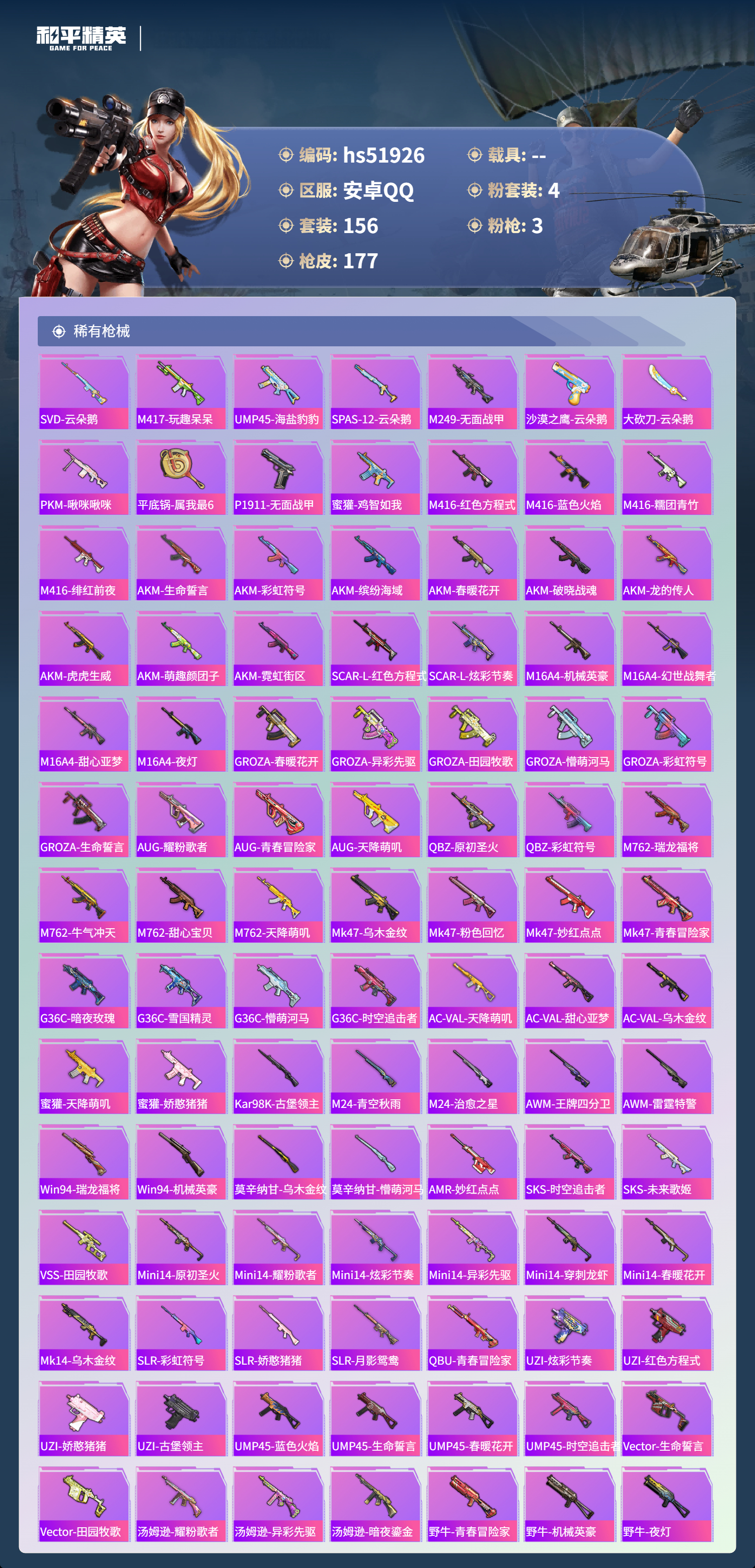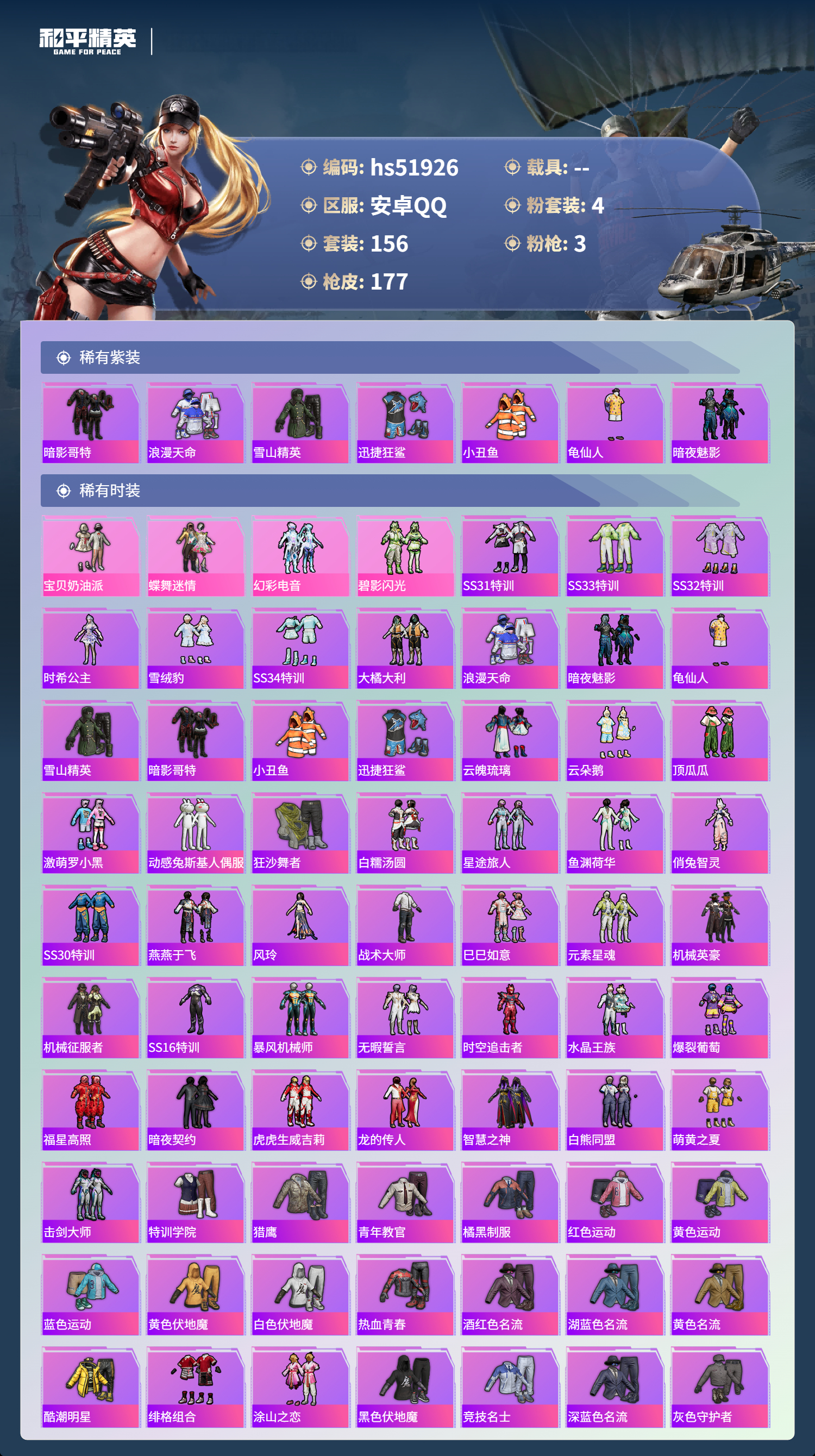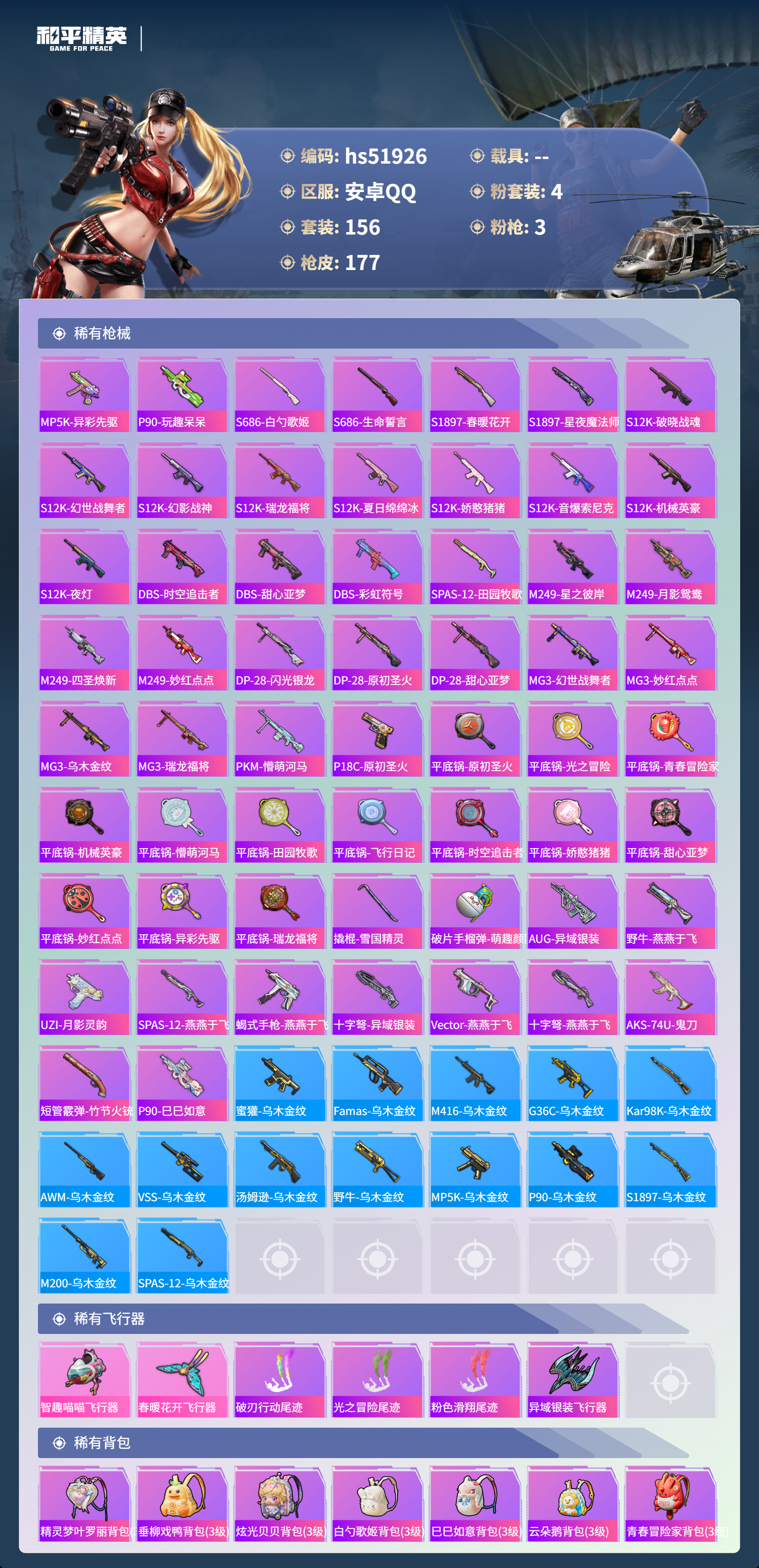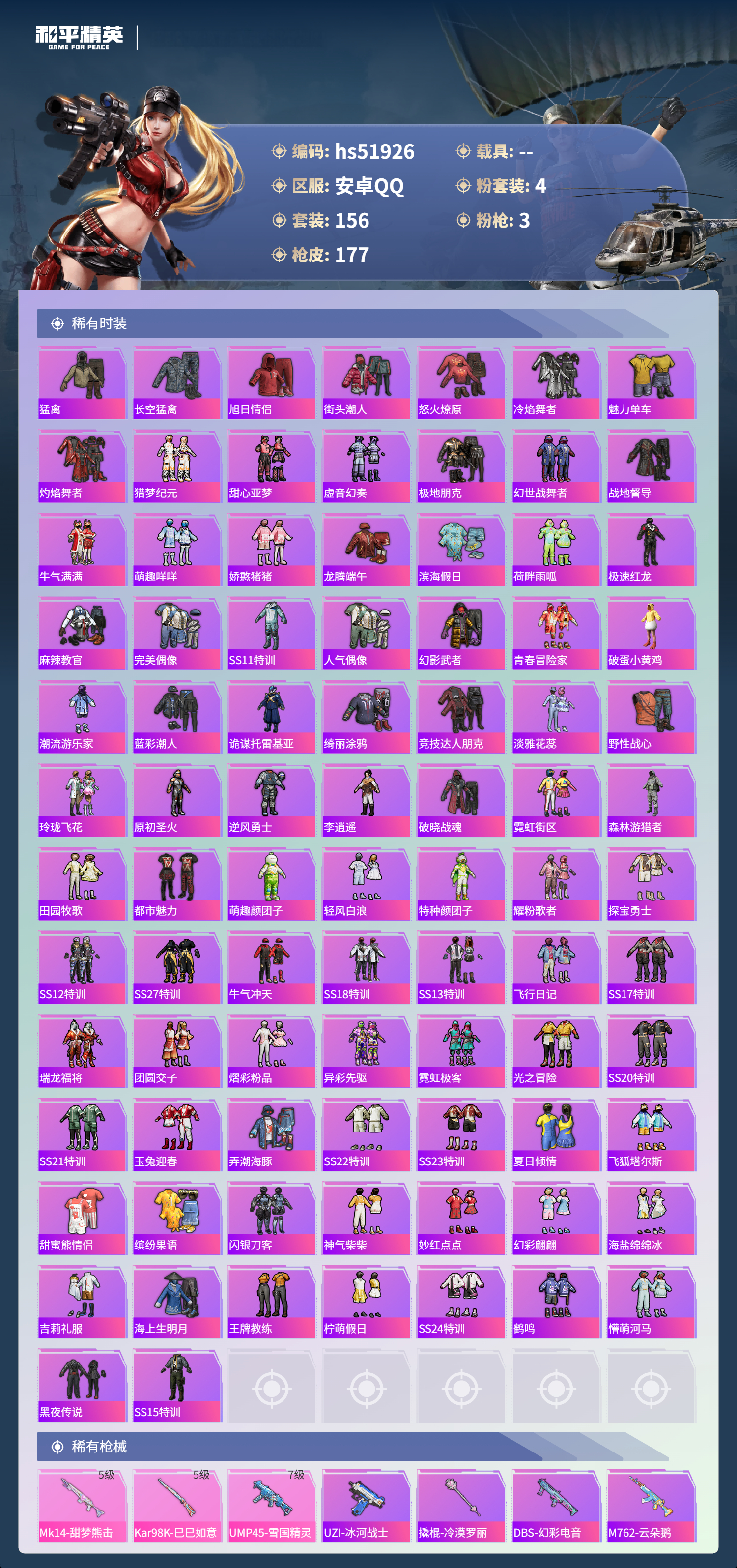 hs51926 安卓手q-7王牌印记-4粉装-3特效呛-53920热力值-156套装-177呛皮【4粉装】套装-碧影闪光套装-宝贝奶油派套装-蝶舞迷情套装-幻彩电音【3特效呛】kar98k-巳巳如意/5级mk14-甜梦熊击/5级ump45-雪国精灵/7级【7稀有紫装】暗影哥特浪漫天命雪山精英迅捷狂鲨小丑鱼龟仙人暗夜魅影【156稀有时装】宝贝奶油派蝶舞迷情幻彩电音