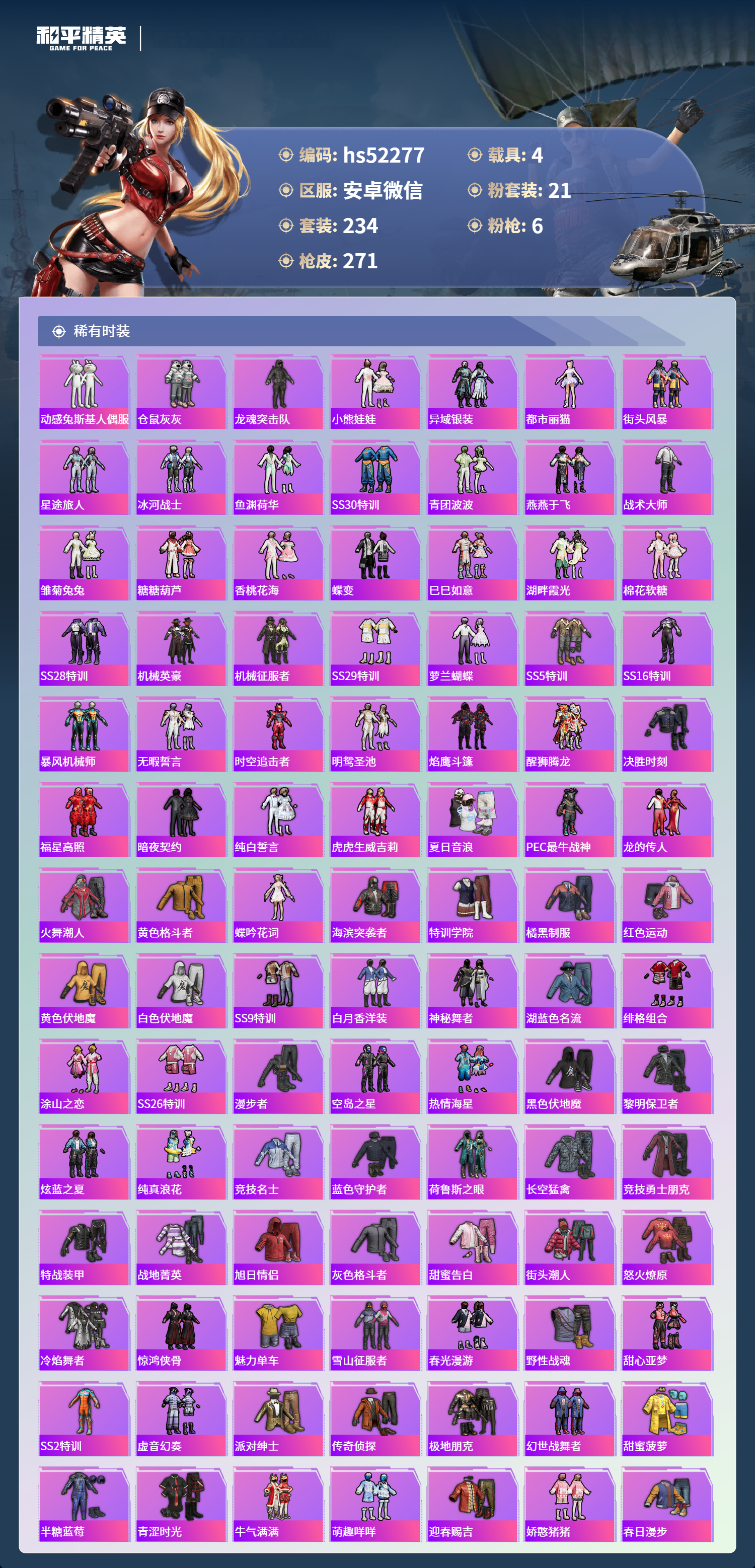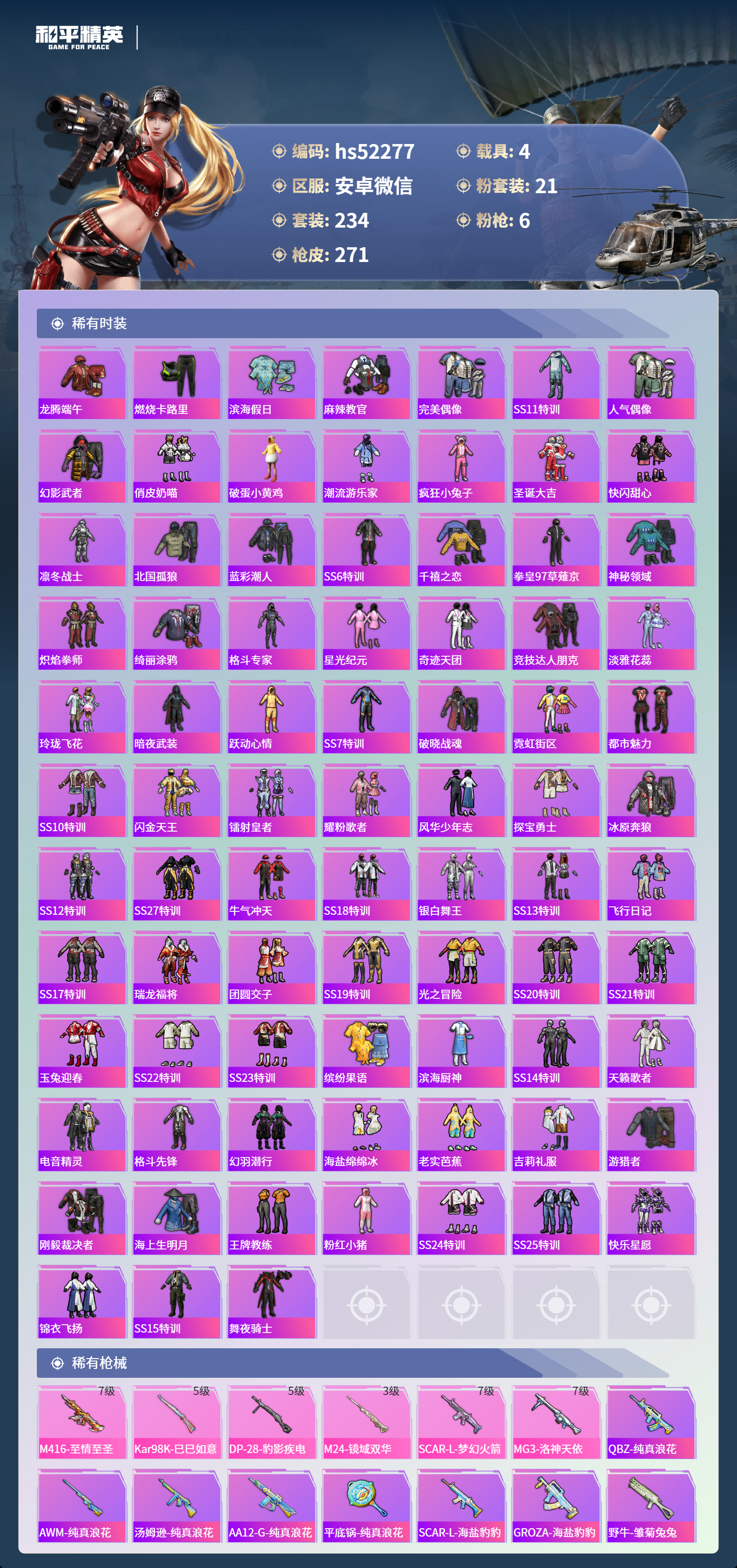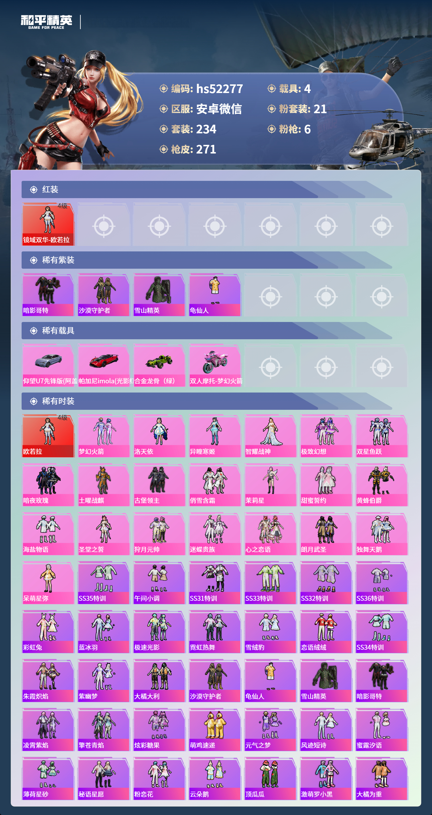 hs52277 安卓微信-20王牌印记-1红装-21粉装-6特效呛-4载具-热力值-234套装-271呛皮-9卓越印记-5传奇印记【1红装】镜域双华-欧若拉/4级【21粉装】套装-梦幻火箭套装-独舞天鹅角色-茉莉星套装-极致幻想套装-俏雪含霜套装-黄蜂伯爵套装-古堡领主套装-甜蜜誓约角色-圣堂之誓套装-暗夜玫瑰套装-海盐物语角色-智耀战神套装-双星鱼跃角色
