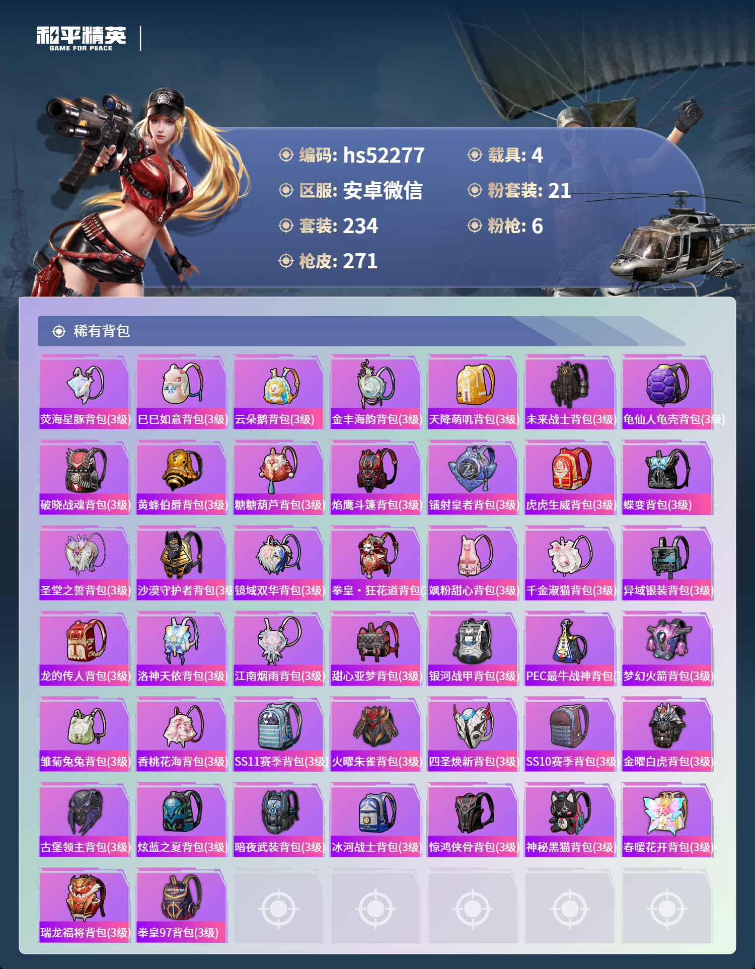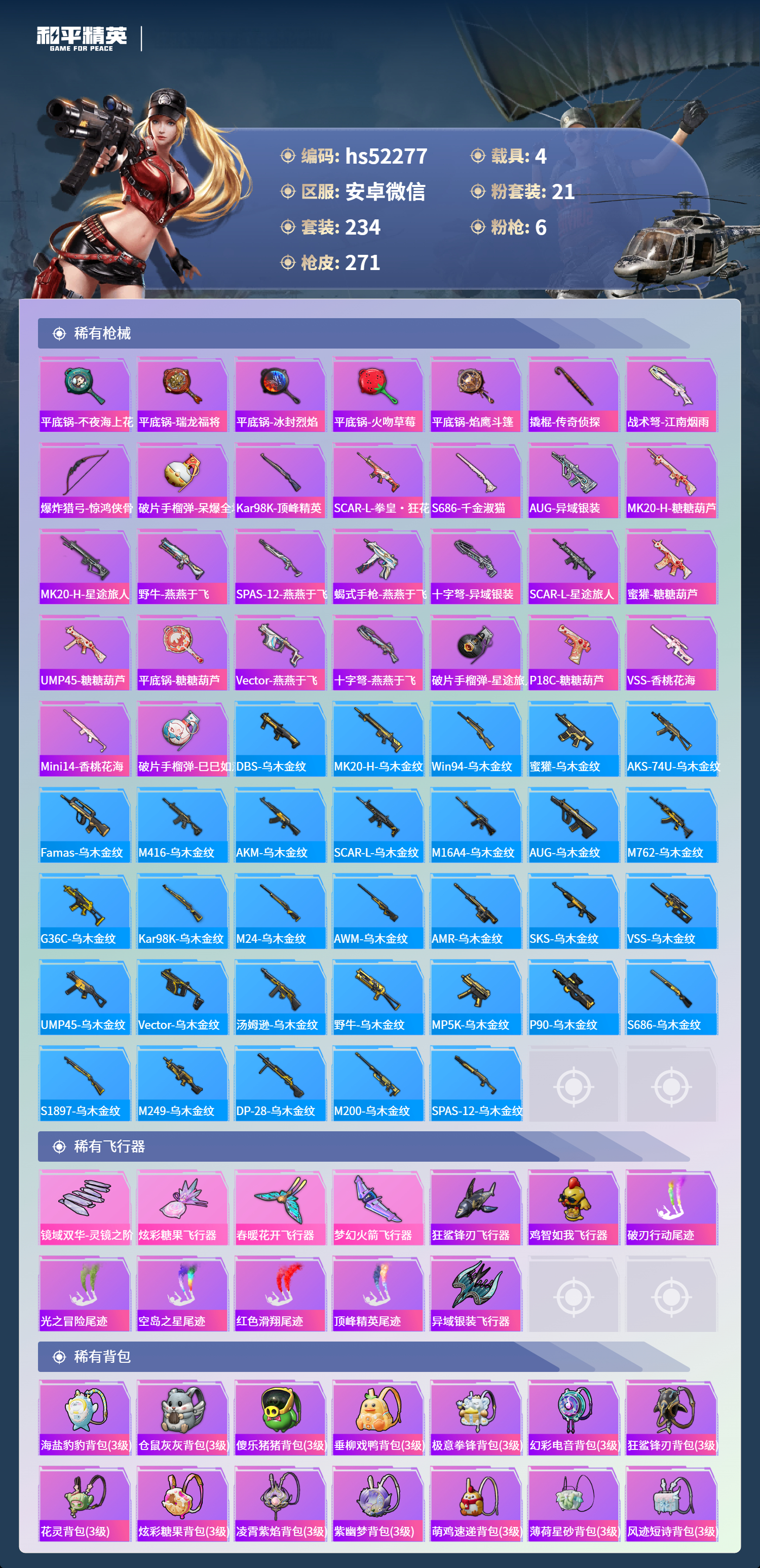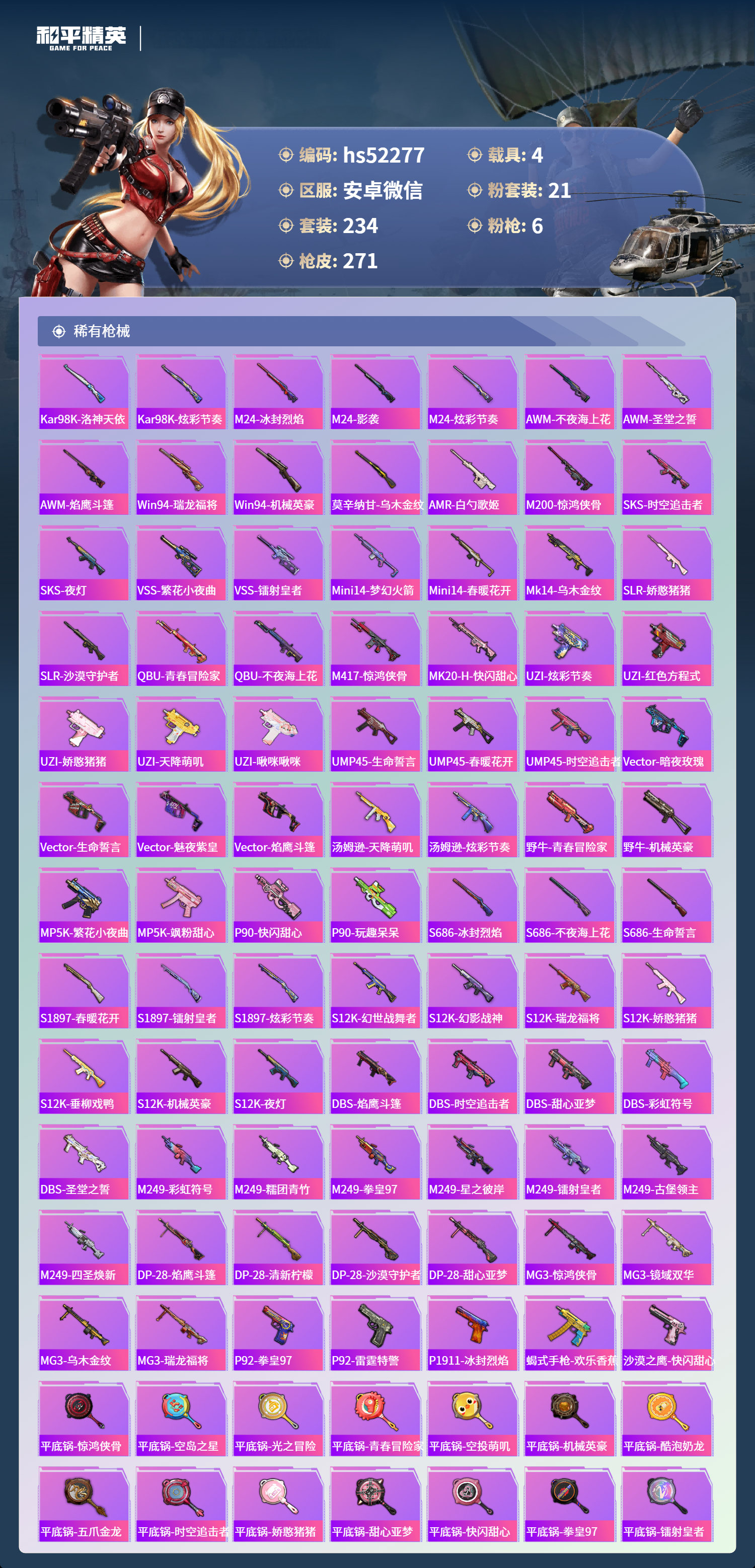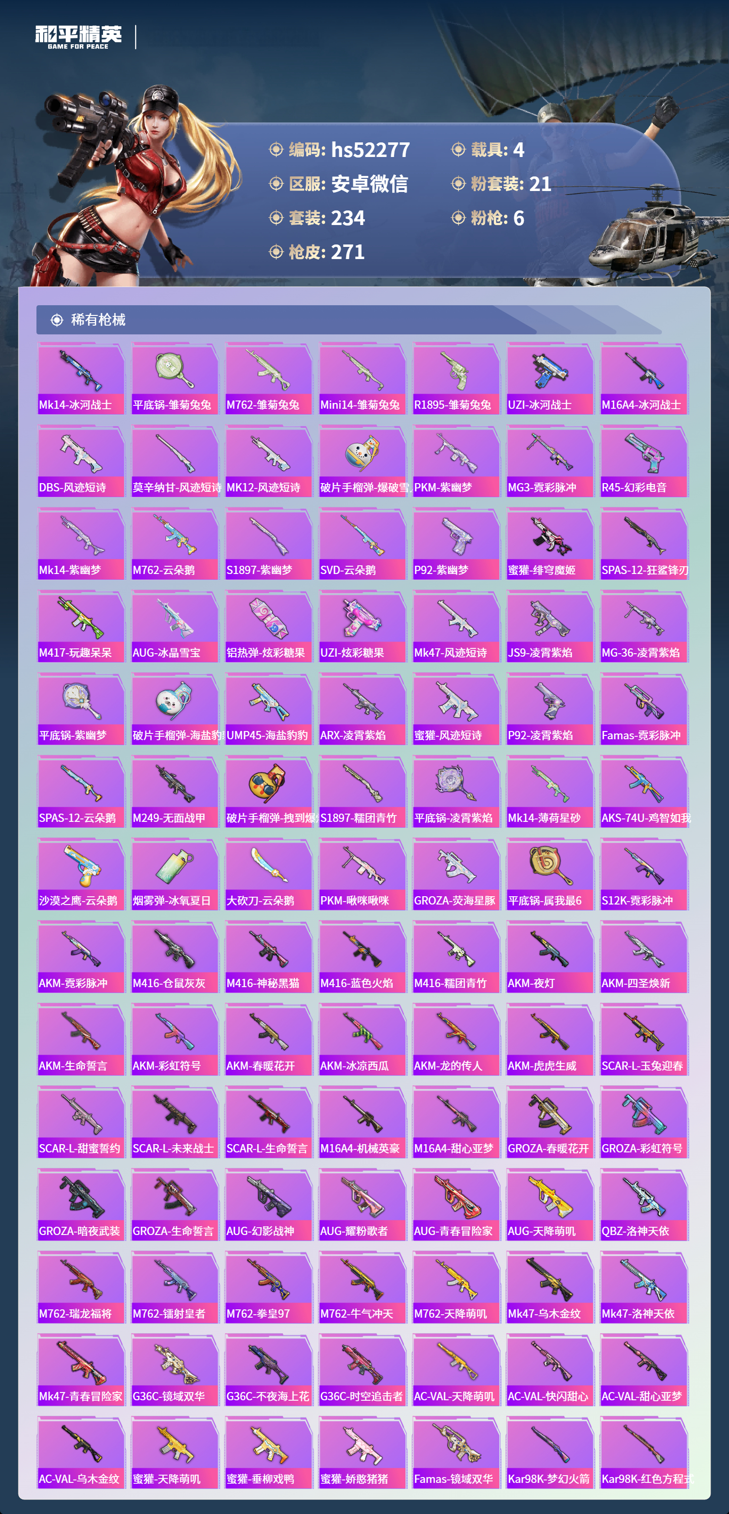 hs52277 安卓微信-20王牌印记-1红装-21粉装-6特效呛-4载具-热力值-234套装-271呛皮-9卓越印记-5传奇印记【1红装】镜域双华-欧若拉/4级【21粉装】套装-梦幻火箭套装-独舞天鹅角色-茉莉星套装-极致幻想套装-俏雪含霜套装-黄蜂伯爵套装-古堡领主套装-甜蜜誓约角色-圣堂之誓套装-暗夜玫瑰套装-海盐物语角色-智耀战神套装-双星鱼跃角色
