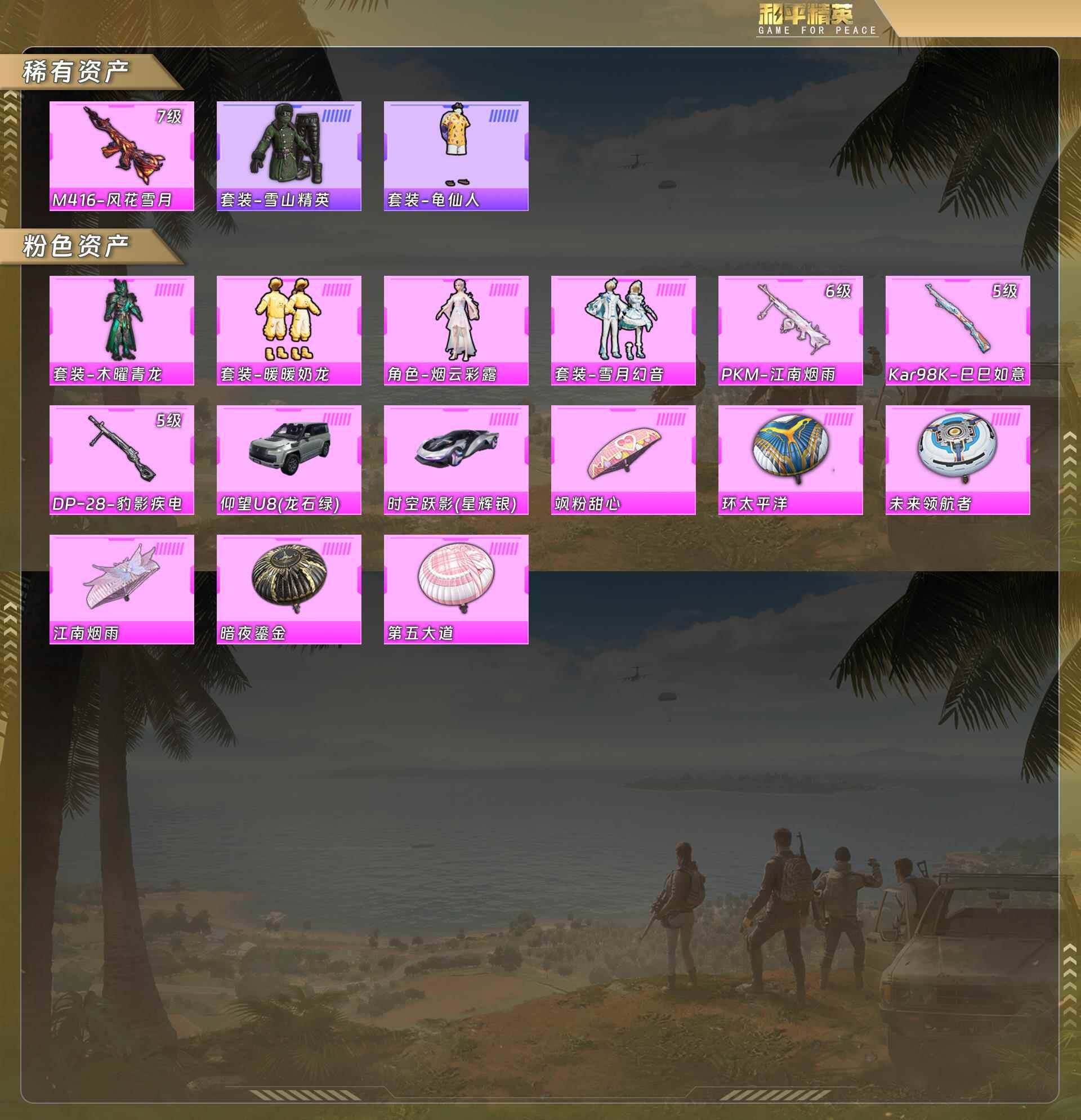 (4粉套4粉呛2载具)木曜青龙/暖暖奶龙/烟云彩露/雪月幻音/pkm江南烟雨6级/98k巳巳如意5级/dp28豹影疾电5级/m4风花雪月7级/仰望绿/时空跃影银没战神框hp3811 -0粉色飞行器-53002热力值-7王牌印记-127套装-166呛皮 【热门品类】:套装-忍者信条,套装-龟仙人 【粉色载具】:仰望u8(龙石绿),时空跃影(星辉银) 【粉色套装】:粉装-木曜青龙,粉装-暖暖奶龙,角色-烟云彩露,粉装-雪月幻音 【粉色呛皮等级】:m416-风花雪月七级,kar98k-巳巳如意五级,dp-28-豹影疾电五级,pkm-江南烟雨六级 【粉色呛皮】:m416-风花雪月,kar98k-巳巳如意,dp-28-豹影疾电,pkm-江南烟雨 【粉色降落伞】:环太平洋降落伞,暗夜鎏金降落伞,第五大道降落伞,飒粉甜心降落伞,江南烟雨降落伞,未来领航者降落伞 【稀有套装】:套装-龟仙人,套装-雏菊兔兔,套装-萝兰蝴蝶,套装-糖糖葫芦,套装-青团波波 【稀有呛皮】:akm-夜灯,akm-彩虹符号,akm-江南烟雨,akm-灼热熔岩,akm-破晓战魂,akm-虎虎生威,akm-霓虹街区,akm-龙的传人,m16a4-幻世战舞者,m16a4-红色方程式,m16a4-蓝色火焰,scar-l-夜灯,scar-l-炫彩节奏,scar-l-玉兔迎春,scar-l-红色方程式,m416-夜灯,m416-糯团青竹,m416-红色方程式,m416-蓝色火焰,groza-生命誓言,groza-田园牧歌,aug-天降萌叽,aug-耀粉歌者,q-飞驰魅影,m762-天降萌叽,m762-奇异狩猎者,m762-彩虹符号,m762-牛气冲天,mk47-妙红点点,ac-val-天降萌叽,ac-val-快闪甜心,蜜獾-天降萌叽,uzi-啾咪啾咪,uzi-天降萌叽,uzi-红色方程式,ump45-夜灯,ump45-涂山之恋,ump45-猪猪侠,ump45-生命誓言,ump45-蓝色火焰,vect-焰鹰斗篷,vect-彩虹符号,vect-田园牧歌,汤姆逊-天降萌叽,汤姆逊-炫彩节奏,汤姆逊-耀粉歌者,p90-快闪甜心,p90-飞驰魅影,kar98k-彩虹符号,kar98k-王子的夏天,kar98k-红色方程式,kar98k-飞驰魅影,m24-炫彩节奏,m24-青空秋雨,m24-奇异狩猎者,awm-焰鹰斗篷,sks-夜灯,sks-炫彩节奏,sks-糯团青竹,vss-彩虹符号,vss-田园牧歌,mini14-涂山之恋,mini14-炫彩节奏,mini14-耀粉歌者,slr-彩虹符号,amr-妙红点点,m417-惊鸿侠骨,mk20-h-快闪甜心,m200-惊鸿侠骨,m200-梦幻舞会,s686-彩虹符号,s686-生命誓言,s686-红色方程式,s1897-炫彩节奏,s1897-飞驰魅影,s12k-玩趣呆呆,s12k-破晓战魂,s12k-幻世战舞者,dbs-焰鹰斗篷,dbs-第五大道,spas-12-田园牧歌,m249-妙红点点,m249-彩虹符号,m249-破晓战魂,m249-糯团青竹,dp-28-焰鹰斗篷,dp-28-彩虹符号,mg3-妙红点点,mg3-幻世战舞者,mg3-惊鸿侠骨,mg3-青空秋雨,pkm-梦幻舞会,蝎式手呛-千金淑猫,沙墨之鹦-快闪甜心,tmp-9-江南烟雨,战术弩-江南烟雨,爆炸猎弓-惊鸿侠骨,大砍刀-青空秋雨 【其他套装】:套装-ss12特训,套装-ss13特训,套装-ss14特训,套装-ss17特训,套装-ss18特训,套装-ss19特训,套装-ss20特训,套装-ss21特训,套装-ss22特训,套装-ss23特训,套装-ss24特训,套装-ss25特训,套装-ss26特训,套装-ss27特训,套装-ss28特训,套装-ss29特训,套装-人气偶像,套装-光之冒险,套装-冰川格斗者,套装-冷焰舞者,套装-北国孤狼,套装-完美偶像,套装-幻世战舞者,套装-幻影武者,套装-怒火燎原,套装-战地督导,套装-探宝勇士,套装-极速红龙,套装-柠萌假日,套装-橘黑制服,套装-涂山之恋,套装-深蓝色名流,套装-湖蓝色名流,套装-灼焰舞者,套装-炫蓝之夏,套装-牛气冲天,套装-牛气满满,套装-特训学院,套装-猎鹰,套装-猛禽,套装-玉兔迎春,套装-王牌教练,套装-疯狂小兔子,套装-白色伏地魔,套装-破晓战魂,套装-破蛋小黄鸡,套装-空岛之星,套装-空投萌叽,套装-竞技名士,套装-竞技达人朋克,套装-红色运动,套装-绮丽涂鸦,套装-绯格组合,套装-耀粉歌者,套装-荣耀,套装-蓝彩潮人,套装-蓝色守护者,套装-蓝色运动,套装-虎虎生威吉莉,套装-街头潮人,套装-都市漫游者,套装-都市魅力,套装-酒红色名流,套装-酷萌兔限定,套装-长空猛禽,套装-霓虹街区,套装-青年教官,套装-青春校园,套装-飞行日记,套装-骑行爱好者,套装-魅力单车,套装-鹤鸣,套装-麻辣教官,套装-黄色伏地魔,套装-黄色名流,套装-黄色运动,套装-黑色伏地魔,套装-龙的传人,套装-龙腾端午,套装-龟仙人,套装-金耀舞者,套装-坚韧舞者,套装-雪山精英,套装-飞驰魅影,套装-音速流光,套装-田园牧歌,套装-轻风白浪,套装-妙红点点,套装-幻彩翩翩,套装-摩登艾咪,套装-绚紫流光,套装-惊鸿侠骨,套装-锦衣飞扬,套装-果汁能量,套装-快闪甜心,套装-春光漫游,玩偶服-超人强,套装-焰鹰斗篷,套装-幽夜迷踪,套装-幻羽潜行,角色-蝶吟花词,角色-湖雨初晴 【稀有头盔】:精灵迷巫头盔(2级) 【营地id】:721730799