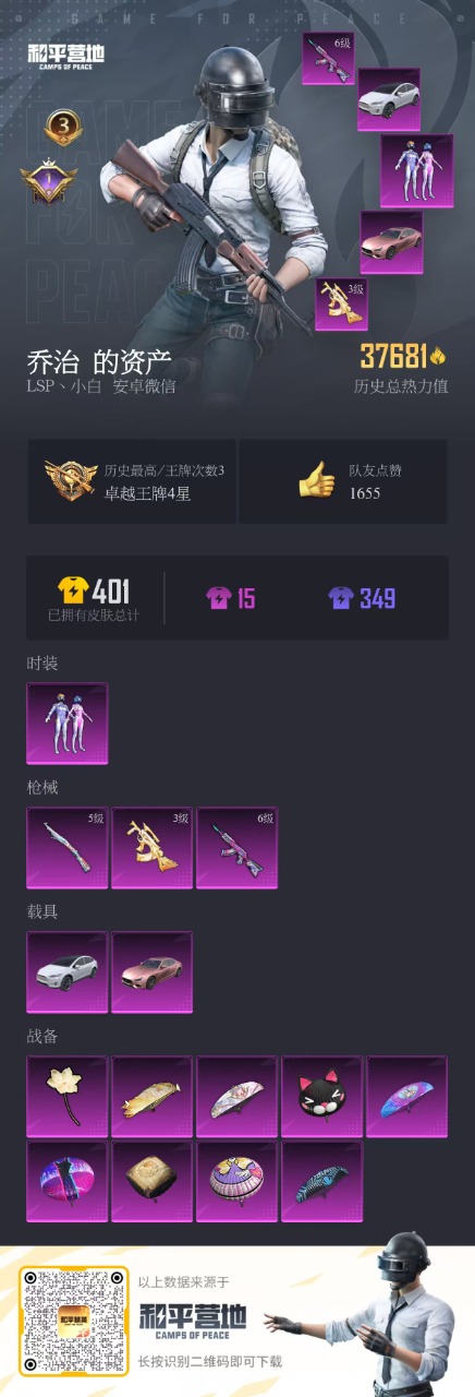 1粉装 3特效呛 2载具 3印记 可二次 可修改实名 【热门装扮】:梦幻火箭新101 神秘黑猫软萌银虎奇迹天团罗小黑激萌罗小黑潮萌小黄鸭仓鼠灰灰暴走罗小黑浪漫波比好奇恐龙 【载具】:玛莎拉蒂ghibli粉特斯拉model x珍珠白 【稀有呛皮】:groza-精灵之