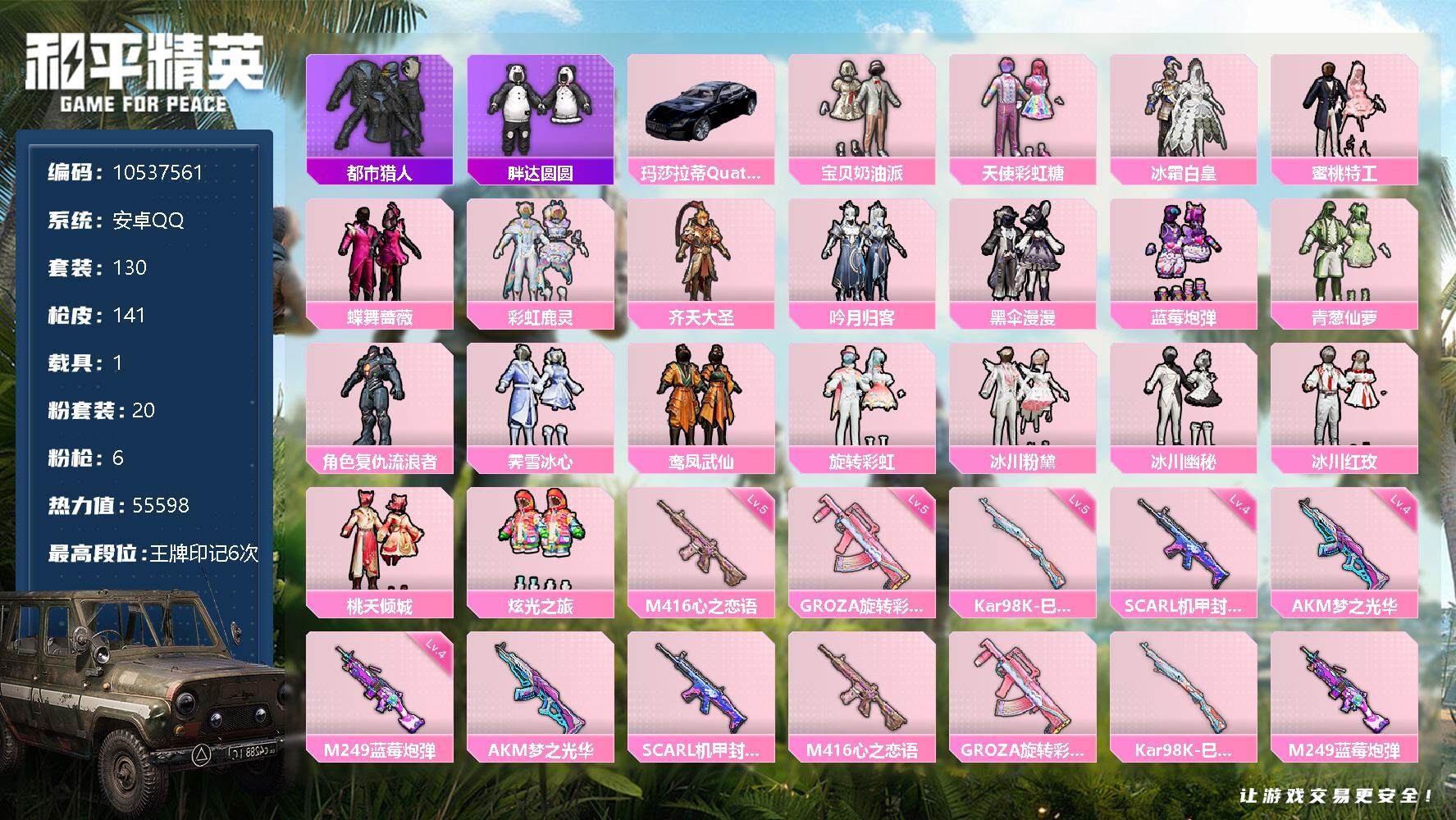 [14330698]【编号96546 可秒换绑 店长推荐捡漏号!】安卓 手q-20粉装-6特效呛-1载具-55598热力值-6印记-130套装-141呛皮 【稀有载具】:玛莎拉蒂quattropte(夜幕蓝) 【特效呛等级】:akm-梦之光华四级,scar-l-机甲封神四级,m416-心之恋语五级,groza-旋转彩虹五级,kar98k-巳巳如意五级,m249-蓝莓炮弹四级 【优质套装】:粉装-宝贝奶油派,粉装-天使彩虹糖,粉装-冰霜白皇,粉装-蜜桃特工,粉装-蝶舞蔷薇,粉装-彩虹鹿灵,粉装-齐天大圣,粉装-吟月归客,粉装-黑伞漫漫,粉装-蓝莓炮弹,粉装-青葱仙萝,角色-复仇流浪者,粉装-霁雪冰心,粉装-鸾凤武仙,粉装-旋转彩虹,粉装-冰川粉黛,粉装-冰川幽秘,粉装-冰川红玫,粉装-桃夭倾城,粉装-炫光之旅 【稀有套装】:套装-龟仙人,套装-巳巳如意,角色-蜜桃派对 【优质武器皮肤】:akm-梦之光华,scar-l-机甲封神,m416-心之恋语,groza-旋转彩虹,kar98k-巳巳如意,m249-蓝莓炮弹 【稀有武器皮肤】:akm-彩虹符号,akm-影袭,akm-虎虎生威,akm-龙的传人,m16a4-甜心亚梦,scar-l-红色方程式,m416-糯团青竹,m416-蓝色火焰,m416-黄金狮王,groza-异彩先驱,groza-影袭,groza-林间仙鹿,groza-田园牧歌,groza-蓝莓炮弹,aug-幻影战神,aug-耀粉歌者,m762-天降萌叽,m762-瑞龙福将,m762-甜心宝贝,m762-能量风暴,mk47-洛神天依,g36c-时空追击者,g36c-星穹咏叹调,ac-val-天降萌叽,ac-val-甜心亚梦,蜜獾-天降萌叽,蜜獾-娇憨猪猪,蜜獾-桃夭倾城,uzi-天降萌叽,uzi-娇憨猪猪,uzi-影袭,uzi-炫彩节奏,ump45-时空追击者,ump45-蓝色火焰,vect-呛炮玫瑰,vect-生命誓言,vect-田园牧歌,汤姆逊-天降萌叽,汤姆逊-异彩先驱,汤姆逊-暗夜鎏金,汤姆逊-炫彩节奏,汤姆逊-耀粉歌者,野牛-夜灯,野牛-桃夭倾城,mp5k-异彩先驱,mp5k-蓝莓炮弹,p90-巳巳如意,kar98k-2b战斗服款,kar98k-影袭,kar98k-洛神天依,kar98k-蓝莓炮弹,m24-影袭,m24-拂晓神骑,