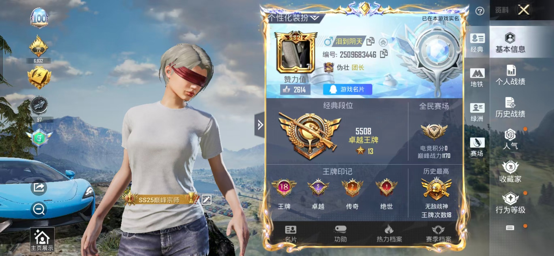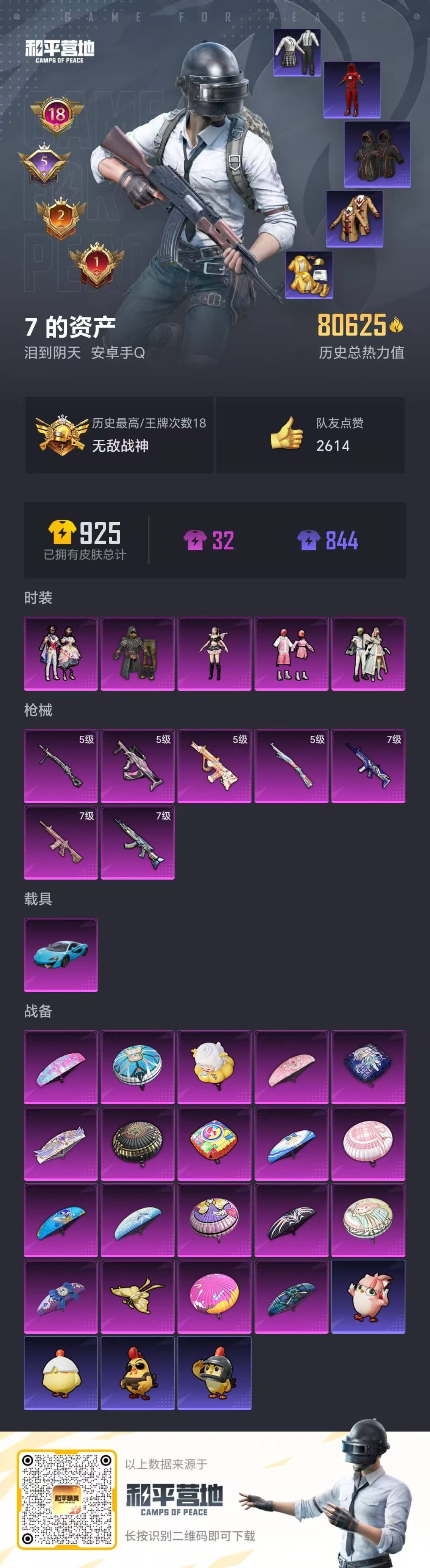 5粉装 7特效呛 1载具 18印记 可二次 可修改实名 战神框 【热门装扮】:星穹咏叹调极限特训筑梦精灵飒粉甜心白兰星鹰眼刺客派对舞王小金鞋 【载具】:迈凯伦570s天际蓝 【稀有呛皮】:aug-暖羊咩咩kar98k-巳巳如意groza-镜光银凌dp-28-豹影疾电m41