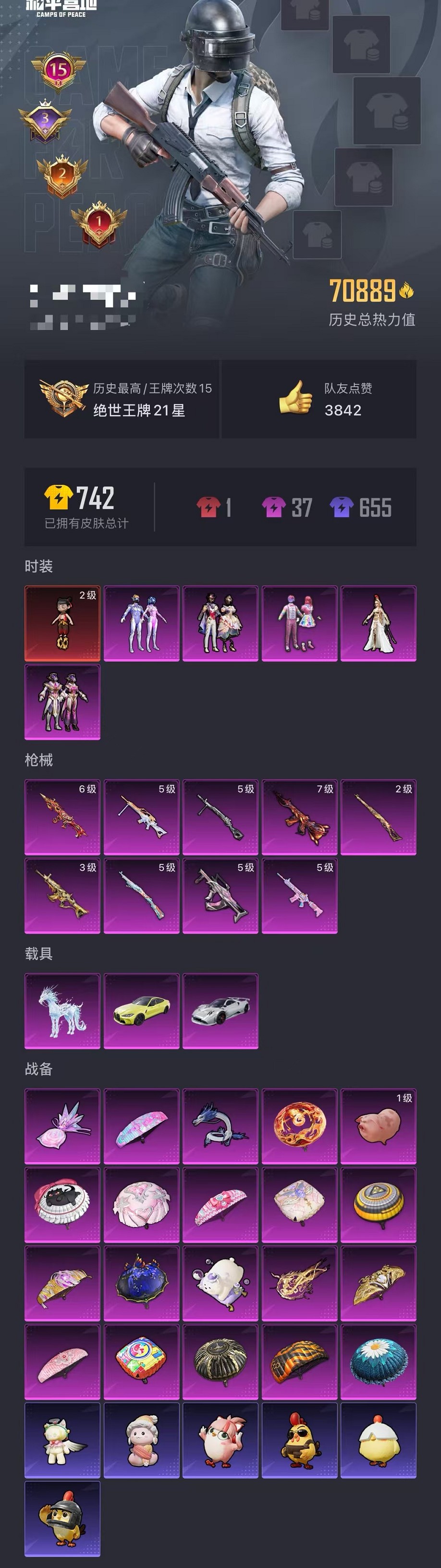 【哪吒2级 5粉装9特效呛3载具 可秒换绑】 苹果q区-70889热力值-15印记-147套装-211呛皮 【1红装】 魔童闹海-哪吒2级【3载具】 帕加尼imola艺术银 冰绡玉鳞 宝马m4圣保罗黄【5粉装】 梦幻火箭 天使彩虹糖 银红美神 星穹咏叹调 角色-萨利娅【9特效呛】 m416-风花雪月7级 m416-电玩时刻5级 kar98k-圣域龙灵2级 groza-镜光
