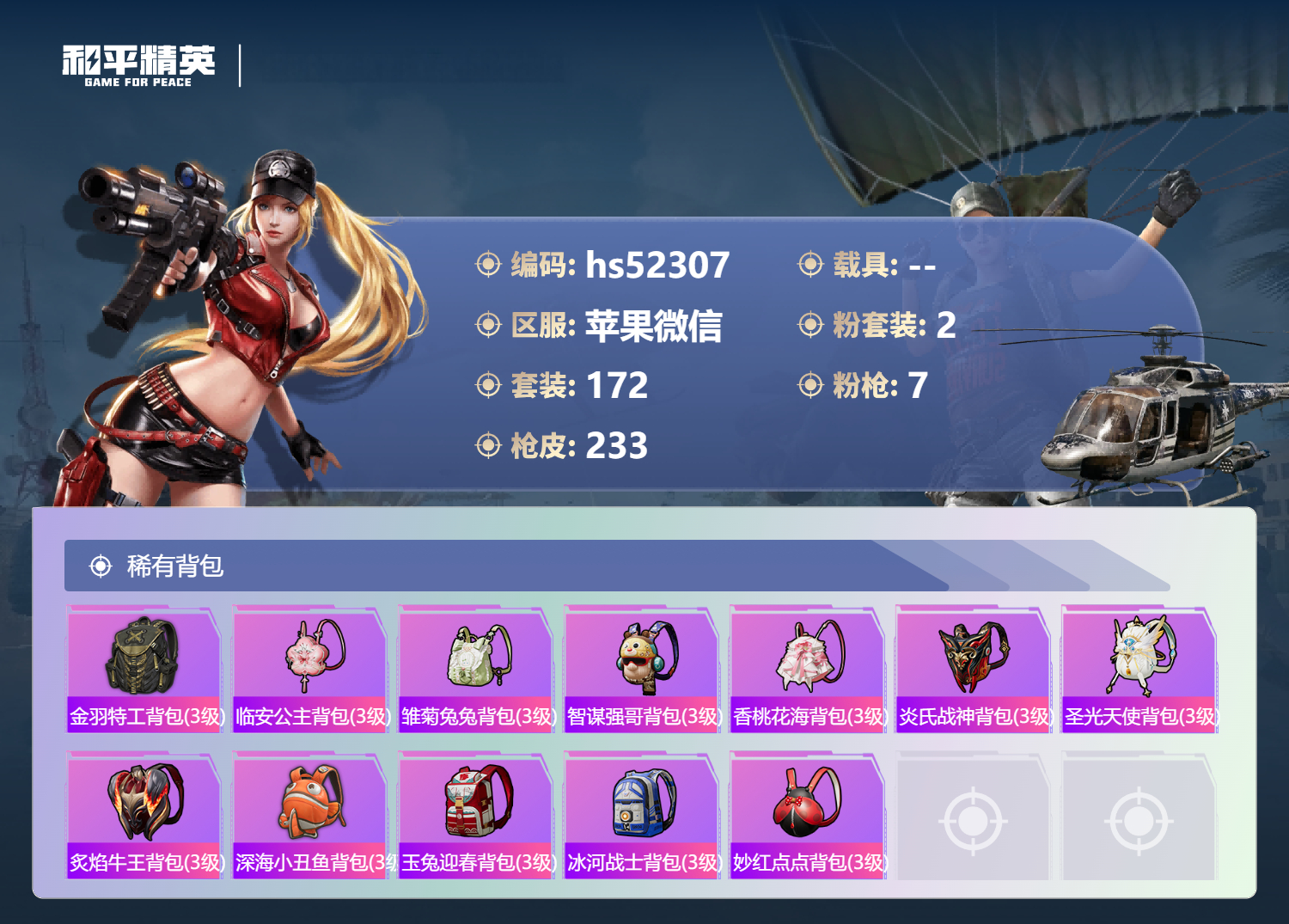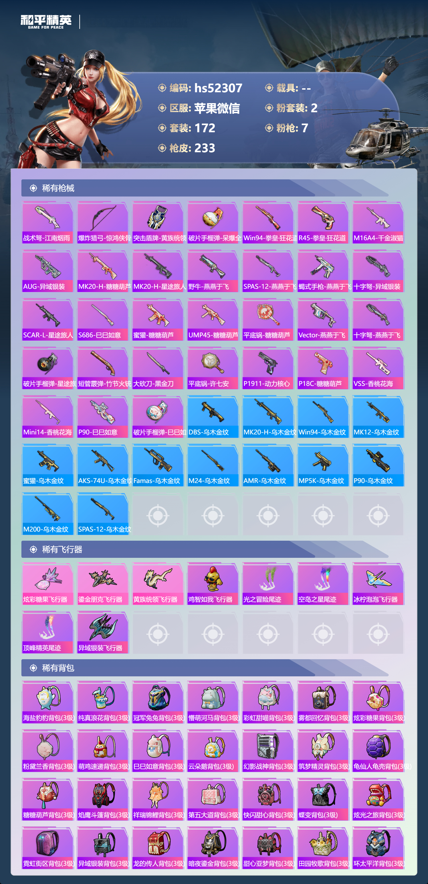 hs52307 苹果微信-16王牌印记-2粉装-7特效呛-68836热力值-172套装-233呛皮-7卓越印记-2传奇印记【2粉装】套装-未来领航者套装-数码大师【7特效呛】kar98k-巳巳如意/5级dp-28-豹影疾电/5级vect-环太平洋/7级m762-青锋波束/5级m416-五爪金龙/7级scar-l-锦绣绵绵/5级m416-电玩时刻/5级【11稀有紫装】都市猎人