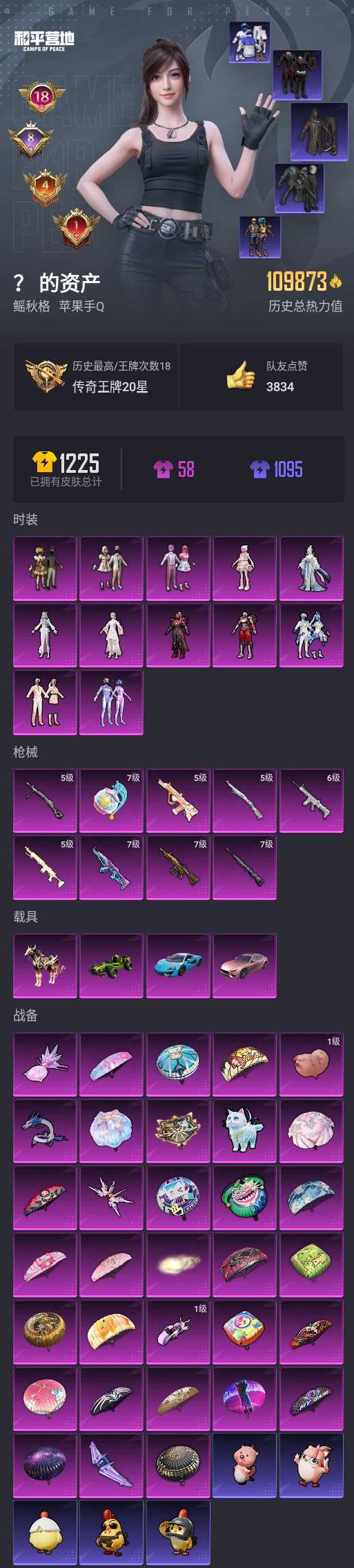 【和平精英】【lyhp17389】18印记1绝世 10w热力值 12粉9特效呛4载 梦幻火箭 巧克力三姐妹 都市猎人 第五大道 多呛型 满级m4金龙 满级akm梦华 满级手蕾 scar-l童话 mk12精灵 四车型 合金龙骨 粉玛莎 迈凯伦 黑耀马 12粉装,9特效呛,4载具,历史最高段位:传奇王牌20星 王牌印记18次 热力值:109873,254套装,314呛械,402装备,213战备;套装:套装-甜心巧克力,套装-宝贝奶油派,套装-天使彩虹糖,套装-梦幻火箭,套装-第五大道,角色-阿尔茜,角色-万古烈焰,套装-未来歌姬,角色-烟云彩露,角色-宁雨蝶,角色-冷漠罗丽,角色-羊梦糖心,套装-特训学院,套装-猎鹰,套装-青年教官,套装-橘黑制服,套装-红色运动,套装-黄色运动,套装-蓝色运动,套装-黄色伏地魔,套装-白色伏地魔,套装-黑色伏地魔,套装-冰川格斗者,套装-竞技名士,套装-深蓝色名流,套装-酒红色名流,套装-湖蓝色名流,套装-黄色名流,套装-猛禽,套装-长空猛禽,套装-漫步者,套装-霸义无双,套装-竞技勇士朋克,套装-雪鹰学院,套装-旭日情侣,套装-冷焰舞者,套装-灼焰舞者,套装-都市猎人,套装-浪漫天命,套装-特战装甲,套装-贵族骑装,套装-战地督导,套装-特殊使命,套装-街舞之王,套装-灰色格斗者,套装-活力之心,套装-甜蜜告白,套装-春日漫步,套装-潮流先锋,套装-燃烧卡路里,套装-滨海假日,套装-沙漠毒蛇,套装-鹰眼刺客,套装-冰冻风暴,套装-完美偶像,套装-人气偶像,套装-幻影武者,套装-街头潮人,套装-蓝彩潮人,套装-怒火燎原,套装-魅力单车,套装-绮丽涂鸦,套装-耀眼新星,套装-坚韧舞者,套装-竞技达人朋克,套装-野性战心,套装-破晓战魂,套装-森林游猎者,套装-都市魅力,套装-荣耀,套装-热血青春,套装-沙漠兵团,套装-丛林猎人,套装-雪山精英,套装-酷潮明星,套装-传奇侦探,套装-极地朋克,套装-幻世战舞者,套装-翡翠奔狼,套装-甜蜜菠萝,套装-冰凉西瓜,套装-奇异狩猎者,套装-金耀舞者,套装-蓝调潮人,套装-暗影哥特,套装-迅捷狂鲨,套装-呆萌铁蟹,套装-深海小丑鱼,套装-甜蜜熊情侣,套装-青涩时光,套装-缤纷果语,套装-滨海厨神,套装-龙魂突击队,套装-风暴特警,套装-极速红龙,套装-格斗先锋,套装-恶魔宝贝,套装-破蛋小黄鸡,套装-疯狂小兔子,套装-深蓝冒险家,套装-迷域探索者,套装-ss5特训,套装-圣诞大吉,套装-金鼠迎春,套装-军械专家,套装-北国孤狼,套装-ss6特训,套装-星光纪元,套装-奇迹天团,套装-威严将相,套装-跃动心情,套装-ss7特训,套装-黑色刀锋,套装-核芯基因,套装-精神漫游,套装-银河圣歌,套装-闪耀星光,套装-鹤鸣,套装-霓虹街区,套装-ss10特训,套装-潮萌小黄鸭,套装-ss8特训,套装-众神之王,套装-智慧之神,套装-软萌银虎,套装-白熊同盟,套装-萌黄之夏,套装-夏日音浪,套装-ss9特训,套装-风华少年志,套装-白月香洋装,套装-探宝勇士,套装-牛气满满,套装-ss11特训,套装-原初圣火,套装-逆风勇士,套装-萌趣颜团子,套装-战术大师,套装-ss12特训,套装-牛气冲天,套装-ss18特训,套装-耀粉歌者,套装-飞行日记,套装-ss13特训,套装-曼妙人鱼,套装-热情海星,套装-纯真浪花,套装-ss14特训,套装-吉莉礼服,套装-星梦畅游,套装-ss15特训,套装-ss16特训,套装-ss17特训,套装-福星高照,套装-空投萌叽,套装-ss19特训,套装-炫蓝之夏,套装-ss20特训,套装-粉团憨憨,套装-ss21特训,套装-萌趣咩咩,套装-娇憨猪猪,套装-夏雨游龙,套装-玉兔迎春,套装-ss22特训,套装-和煦暖阳,套装-田园牧歌,套装-轻风白浪,套装-极光玫瑰,套装-星夜迷魅,套装-绚烂繁星,套装-光之冒险,套装-绯格组合,套装-ss23特训,套装-甜梦熊熊,套装-神气柴柴,套装-懵萌河马,套装-灵蜜圈圈,套装-妙红点点,套装-幻彩翩翩,套装-王牌教练,套装-柠萌假日,套装-青玉碎影,套装-ss24特训,套装-荧惑魅影,角色-短笛,套装-龟仙人,套装-涂山之恋,套装-ss25特训,套装-惊鸿侠骨,套装-锦衣飞扬,套装-香桃花海,套装-龙的传人,套装-冰河战士,套装-ss26特训,套装-快闪甜心,套装-春光漫游,套装-空岛之星,角色-星际旅行,套装-贝斯之夜,角色-忠真马岱,角色-忠猛周仓,玩偶服-超人强,套装-焰鹰斗篷,套装-幽夜迷踪,套装-幻羽潜行,套装-ss27特训,套装-恋语绒绒,套装-老实芭蕉,套装-ss28特训,角色-白光莹,套装-街头风暴,套装-海盐绵绵冰,套装-蝶变,套装-小熊娃娃,套装-ss29特训,套装-雏菊兔兔,套装-萝兰蝴蝶,套装-异域银装,套装-星途旅人,角色-糖霜甜心,角色-许七安,套装-ss30特训,套装-青团波波,套装-棉花软糖,角色-夜瞳黯灵,套装-糖糖葫芦,套装-ss31特训,套装-鱼渊荷华,套装-燕燕于飞,套装-紫幽梦,套装-ss33特训,套装-云朵鹅,套装-巳巳如意,套装-ss32特训,套装-彩虹兔,套装-蓝冰羽,套装-顶瓜瓜,套装-雪绒豹,套装-圣穹绘梦,套装-极速光影,套装-炫彩糖果,角色-乐音,套装-蓝海鲸歌,玩偶服-美羊羊,套装-元气之梦,角色-玫纹锢梦,套装-ss34特训,套装-薄荷星砂,套装-ss35特训,套装-午间小调,套装-秘语星愿,套装-风迹短诗,套装-粉黛兰香;呛皮:7级akm-梦之光华,akm-灼热熔岩,akm-影袭,akm-奇异狩猎者,akm-缤纷海域,akm-破晓战魂,akm-星之信仰,akm-霓虹街区,akm-涂鸦街区,akm-彩虹符号,akm-萌趣颜团子,akm-墨染幽兰,akm-龙的传人,akm-灵猫魔法师,akm-霓彩脉冲,g36c-不夜海上花,g36c-暗夜玫瑰,g36c-懵萌河马,g36c-六号树人,g36c-乌木金纹,mk47-乌木金纹,mk47-妙红点点,mk47-炫光之旅,mk47-风迹短诗,groza-影袭,groza-生命誓言,groza-黑色刀锋,groza-彩虹符号,groza-田园牧歌,groza-懵萌河马,groza-海盐