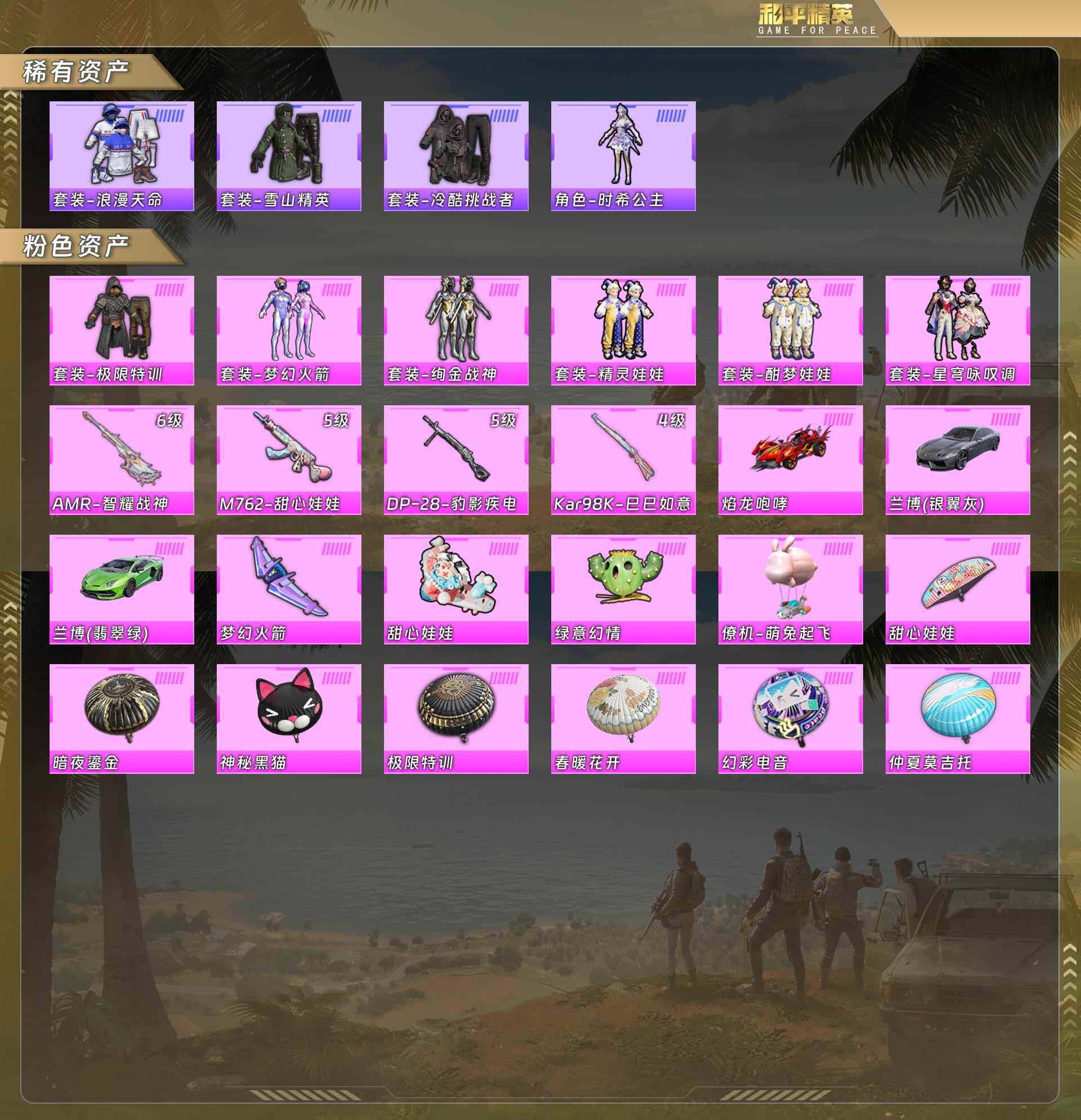 身法号-地铁满天赋/极限特训/梦幻火箭/浪漫天命/绚金战神/精灵娃娃/酣梦娃娃/星穹咏叹调/amr智耀战神6级/m762甜心娃娃5级/dp28豹影疾电5级/98k巳巳如意4级/焰龙咆哮/兰博基尼灰/兰博基尼绿/萌兔起飞(6粉套4粉呛3载具)没战神框hp3821-3粉色飞行器-44134热力值-9王牌印记-107套装-121呛皮 【热门品类】:粉装-梦幻火箭,套装-浪漫天命,套装-暗夜行者 【粉色载具】:兰博基尼aventad svj(翡翠绿),兰博基尼estoque(银翼灰),焰龙咆哮,僚机-萌兔起飞 【粉色套装】:粉装-极限特训,粉装-梦幻火箭,粉装-绚金战神,粉装-精灵娃娃,粉装-酣梦娃娃,粉装-星穹咏叹调 【粉色呛皮等级】:m762-甜心娃娃五级,kar98k-巳巳如意四级,amr-智耀战神六级,dp-28-豹影疾电五级 【粉色呛皮】:m762-甜心娃娃,kar98k-巳巳如意,amr-智耀战神,dp-28-豹影疾电 【粉色飞行器】:梦幻火箭飞行器,绿意幻情飞行器,甜心娃娃飞行器 【粉色降落伞】:极限特训降落伞,春暖花开降落伞,神秘黑猫降落伞,甜心娃娃降落伞,暗夜鎏金降落伞,仲夏莫吉托降落伞,幻彩电音降落伞 【稀有套装】:套装-粉恋花,套装-紫幽梦,套装-蓝冰羽,套装-彩虹兔,套装-云朵鹅,套装-雪绒豹,套装-混沌火种,角色-时希公主,角色-紫俏灵猫 【稀有呛皮】:akm-彩虹符号,akm-生命誓言,akm-破晓战魂,akm-霓虹街区,m16a4-幻世战舞者,scar-l-炫彩节奏,scar-l-玉兔迎春,m416-红色方程式,m416-蓝色火焰,groza-异彩先驱,groza-春暖花开,groza-田园牧歌,aug-天降萌叽,aug-流星咚咚,q-神秘黑猫,m762-天降萌叽,m762-暗夜鎏金,m762-云朵鹅,mk47-妙红点点,蜜獾-天降萌叽,uzi-金玉无双,ump45-春暖花开,ump45-灵符少年,ump45-金玉无双,vect-生命誓言,vect-田园牧歌,vect-金玉无双,汤姆逊-异彩先驱,汤姆逊-暗夜鎏金,mp5k-异彩先驱,kar98k-梦幻火箭,kar98k-灵符少年,kar98k-炫彩节奏,kar98k-红色方程式,kar98k-星穹咏叹调,m24-影袭,sks-夜灯,sks-金玉无双,vss-彩虹符号,vss-田园牧歌,vss-碧影闪光,mini14-异彩先驱,mini14-春暖花开,mini14-梦幻火箭,mini14-甜心娃娃,mini14-金玉无双,mk14-海螺星光,slr-彩虹符号,amr-妙红点点,m200-六号稻草人,svd-云朵鹅,s686-生命誓言,s1897-春暖花开,s1897-暗夜鎏金,s1897-炫彩节奏,s1897-神秘黑猫,s12k-玩趣呆呆,s12k-幻世战舞者,dbs-幻彩电音,spas-12-田园牧歌,spas-12-云朵鹅,m249-妙红点点,m249-糯团青竹,dp-28-旋转彩虹,mg3-妙红点点,mg3-暗夜行者,mg3-甜心娃娃,p92-流星咚咚,蝎式手呛-六号稻草人,沙墨之鹦-云朵鹅,大砍刀-云朵鹅 【其他套装】:套装-ss6特训,套装-ss18特训,套装-ss19特训,套装-ss20特训,套装-ss21特训,套装-ss22特训,套装-ss23特训,套装-ss24特训,套装-人气偶像,套装-光之冒险,套装-冷焰舞者,套装-北国孤狼,套装-千禧之恋,套装-夏日音浪,套装-幻世保卫者,套装-幻世战舞者,套装-幻影武者,套装-战地督导,套装-旭日情侣,套装-春日漫步,套装-暗金炫舞,套装-森林游猎者,套装-浪漫天命,套装-深蓝色名流,套装-湖蓝色名流,套装-滨海厨神,套装-灰色格斗者,套装-灿烂千阳,套装-牛气冲天,套装-猛禽,套装-玉兔迎春,套装-生化防暴队,套装-疯狂小兔子,套装-白色伏地魔,套装-破晓战魂,套装-空投萌叽,套装-竞技勇士朋克,套装-竞技名士,套装-竞技达人朋克,套装-红色运动,套装-耀粉歌者,套装-蓝彩潮人,套装-蓝色运动,套装-超能勇士,套装-酒红色名流,套装-长空猛禽,套装-雪鹰学院,套装-青年教官,套装-魅力单车,套装-麻辣教官,套装-黄色伏地魔,套装-黄色名流,套装-黄色运动,套装-黑色伏地魔,套装-龙腾端午,套装-鹰眼刺客,套装-冰冻风暴,套装-摇滚舞王,套装-摇滚战魂,套装-水银刺客,套装-冷酷挑战者,套装-战地菁英,套装-雪山精英,套装-玲珑飞花,套装-软萌银虎,套装-异彩先驱,套装-缤纷焰火,套装-霓虹极客,套装-糖果砰砰,套装-炫光向阳,套装-田园牧歌,套装-轻风白浪,套装-绚烂繁星,套装-熠彩粉晶,套装-妙红点点,套装-灵蜜圈圈,套装-幻彩翩翩 【稀有头盔】:梦幻火箭头盔(3级) 【稀有背包】:梦幻火箭背包(3级),梦幻火箭背包(2级),神秘黑猫背包(2级) 【营地id】:798643890