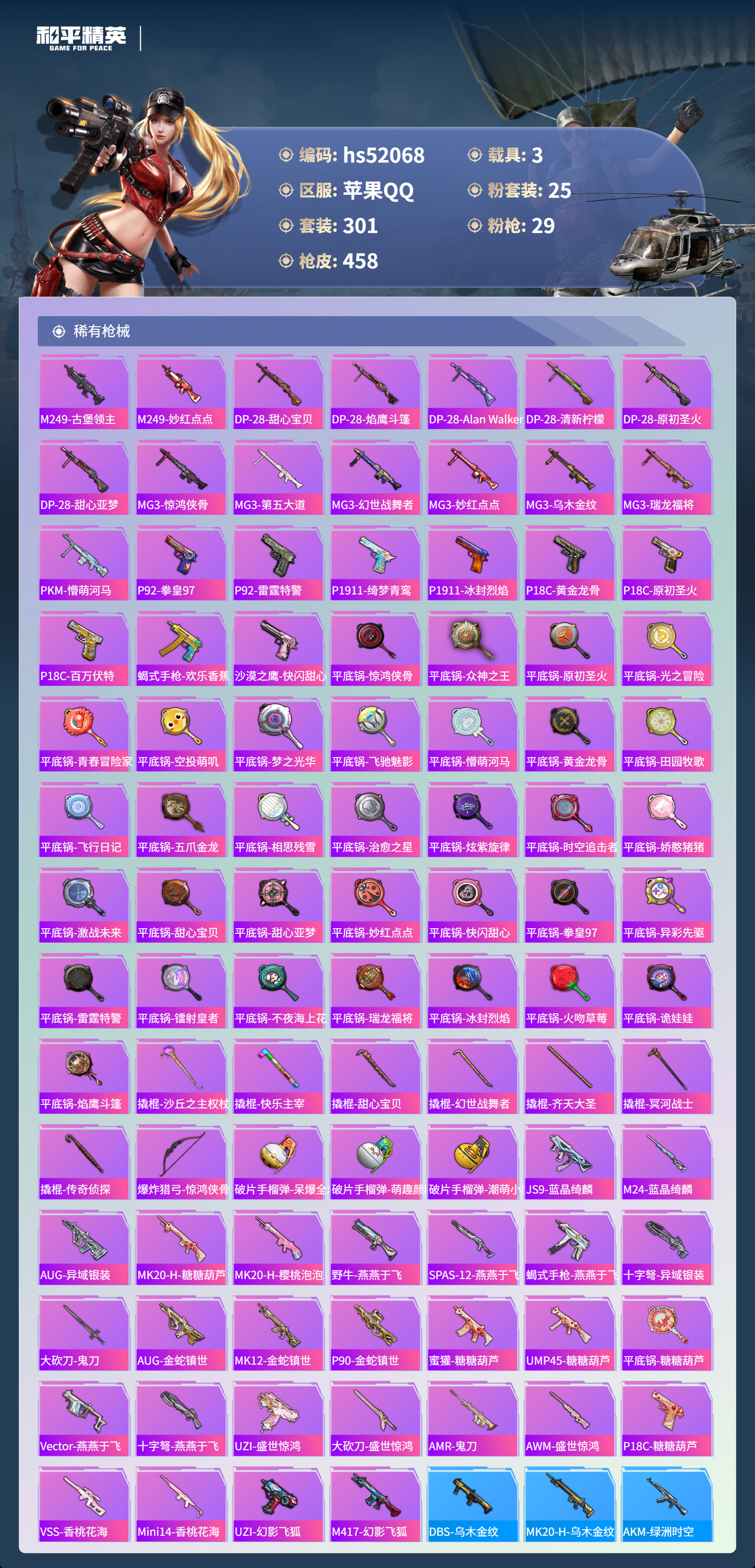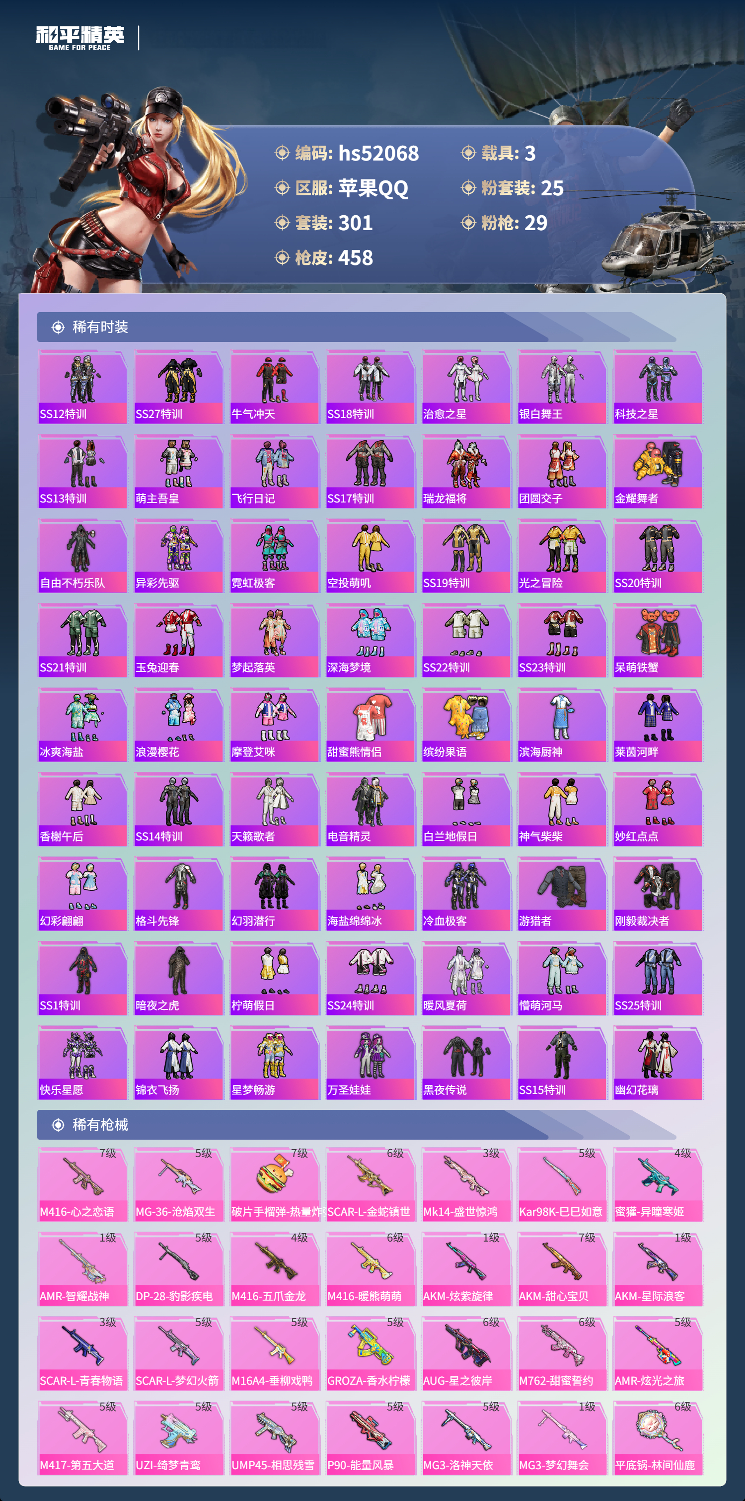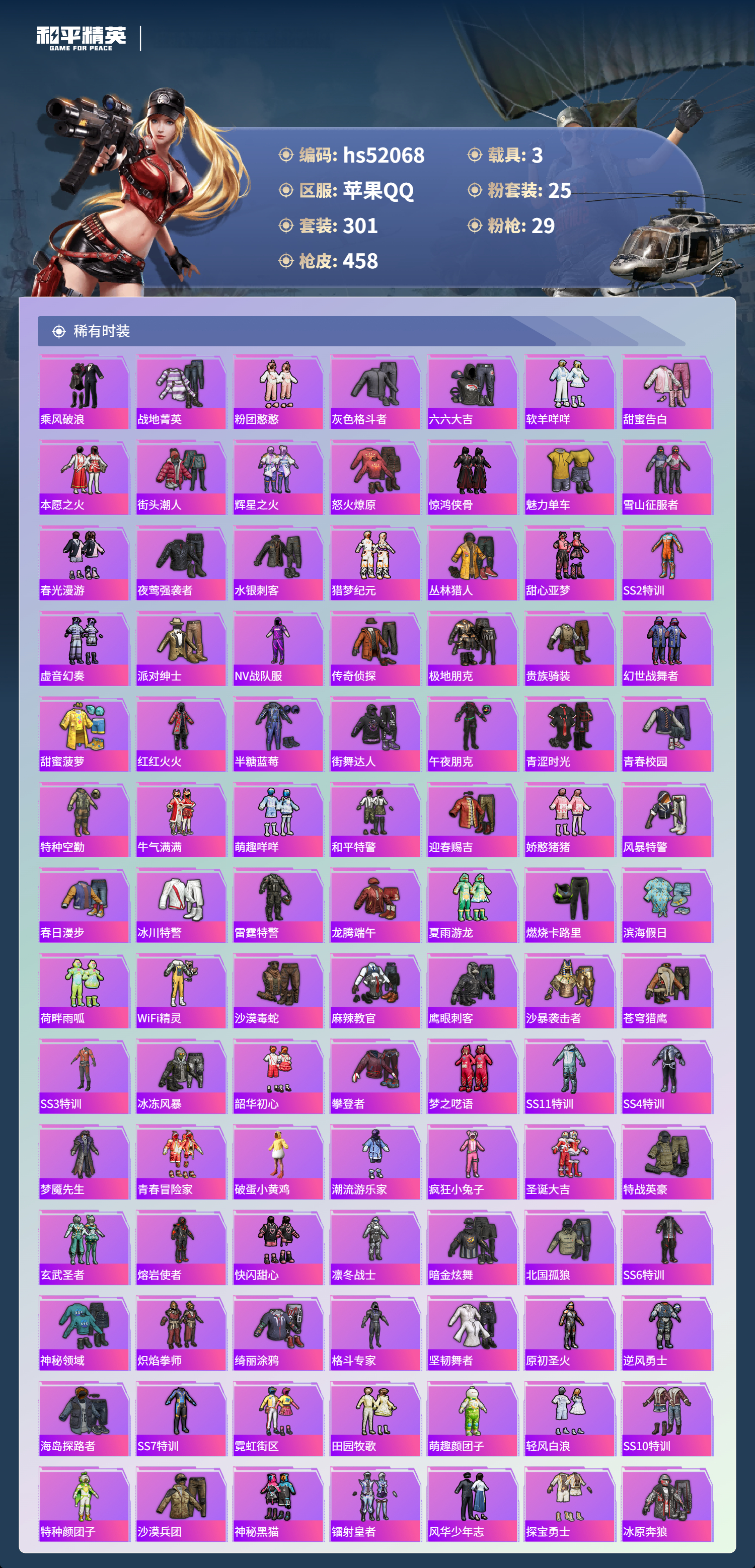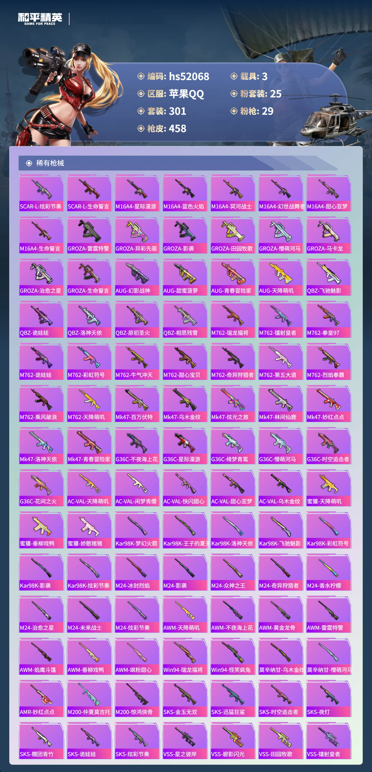 hs52068 苹果手q-31王牌印记-有战神框-1红装-25粉装-29特效呛-3载具-热力值-301套装-458呛皮-13卓越印记-12传奇印记【1红装】金蛇镇世-烛九/3级【25粉装】角色-异瞳寒姬套装-甜蜜誓约套装-星之彼岸套装-炙焰红王套装-飒粉甜心套装-花间之火套装-馨动时刻套装-冰霜白皇角色-洛天依角色-冰魄套装-pel轰鸣竞梦者套装-星穹咏叹调