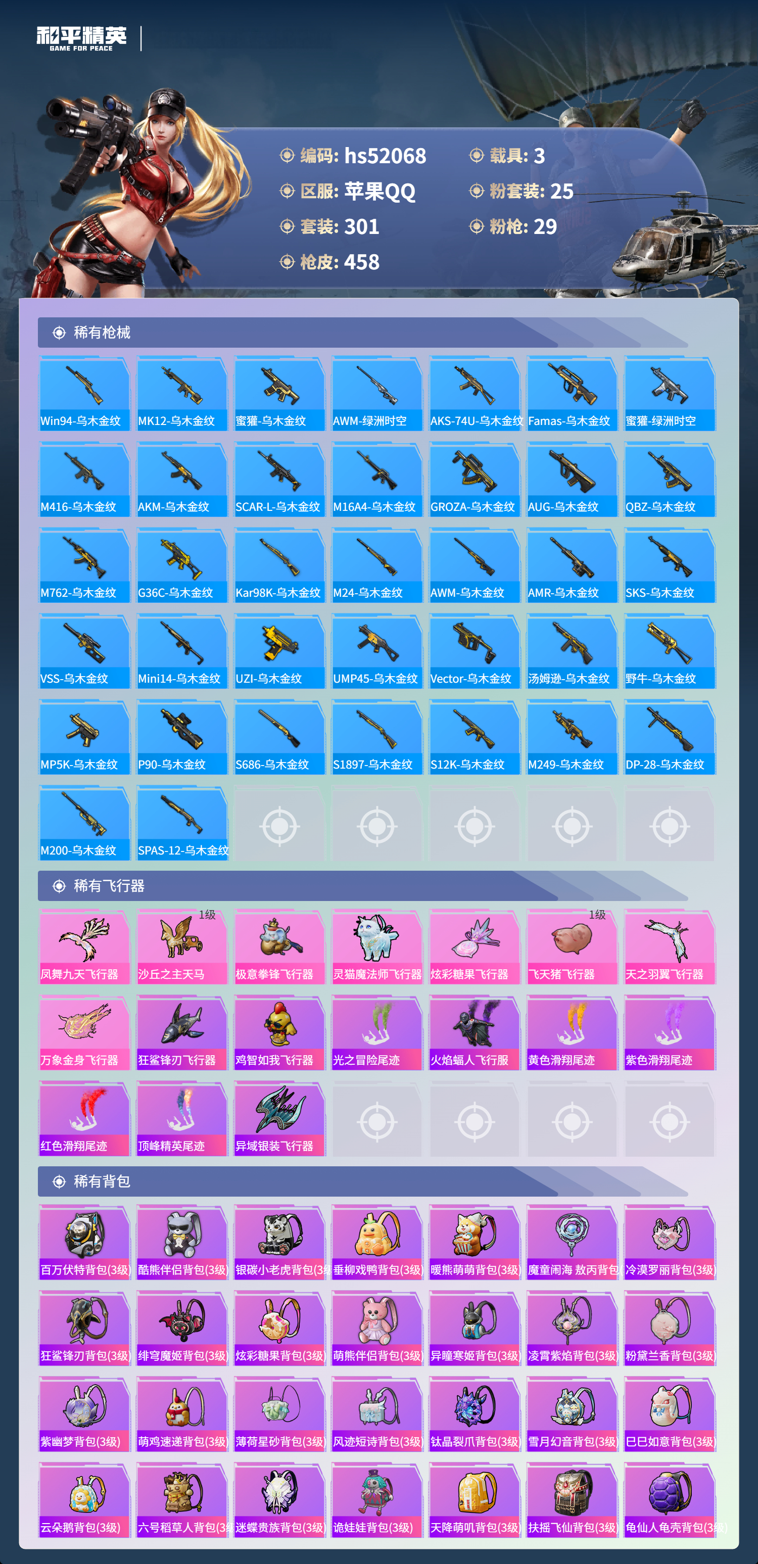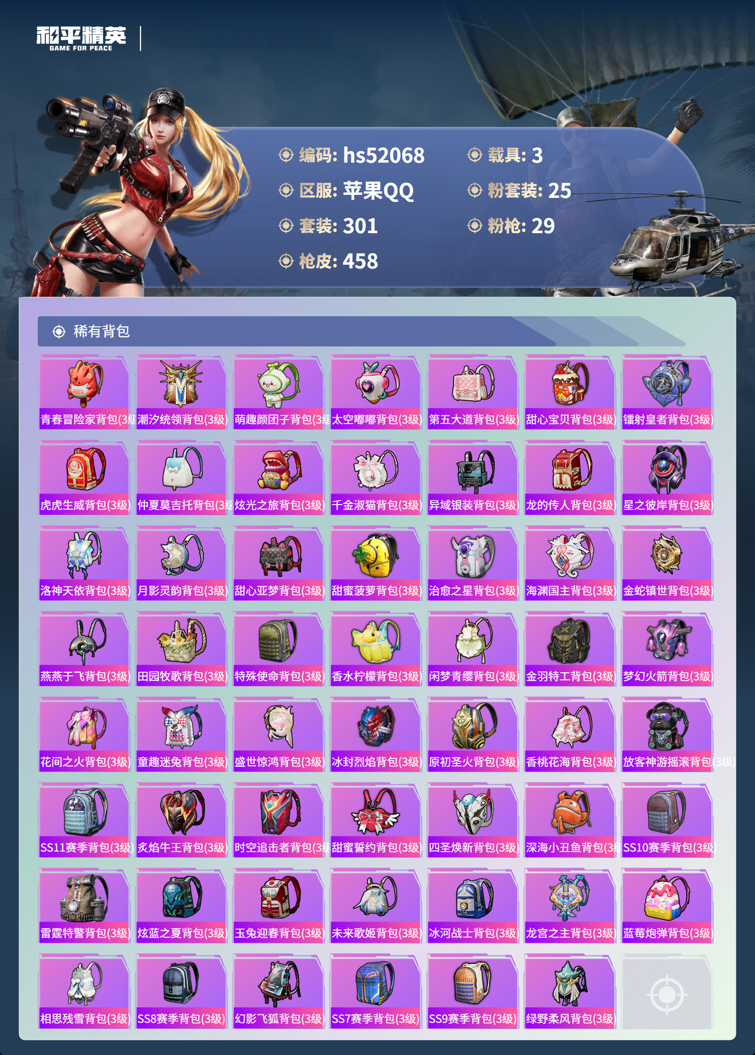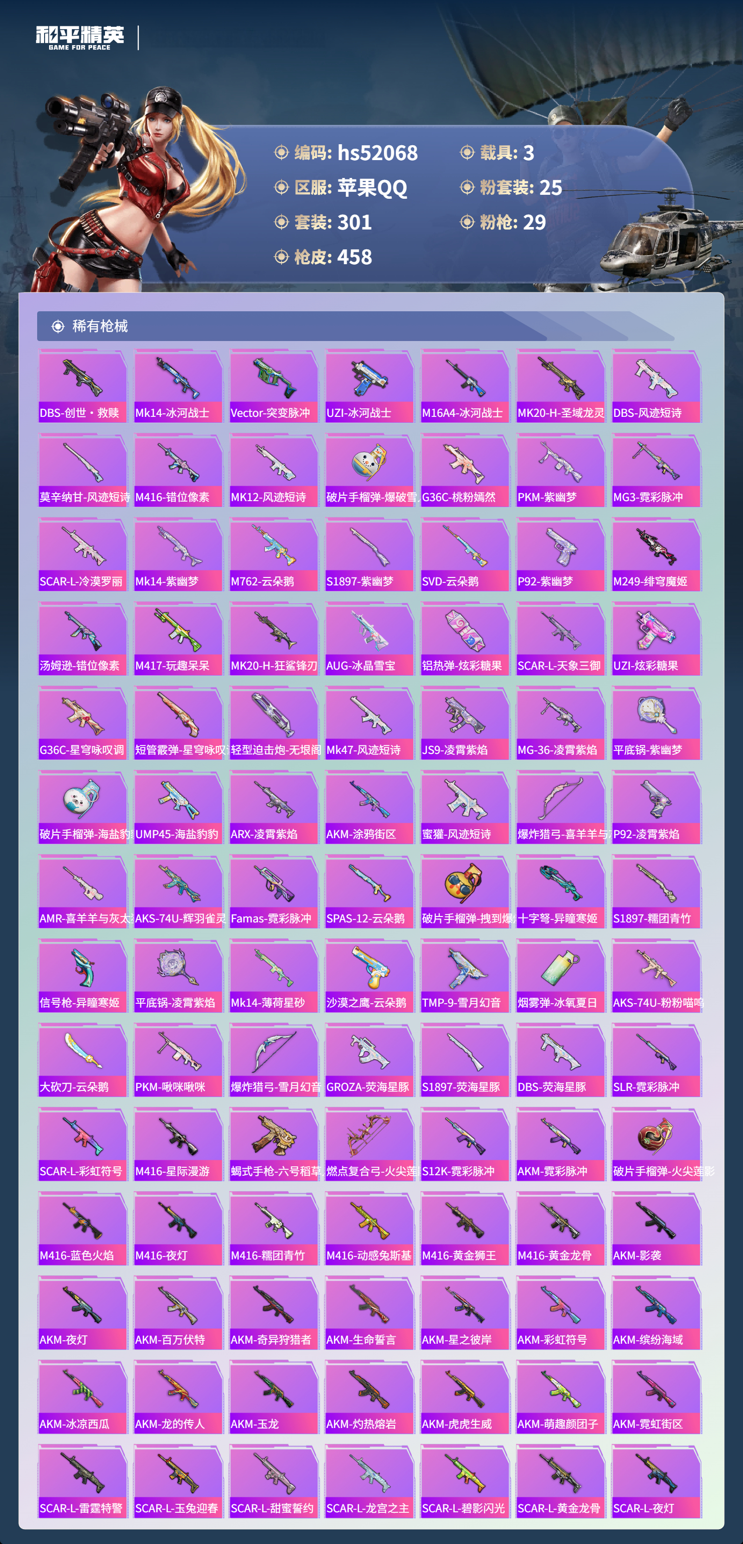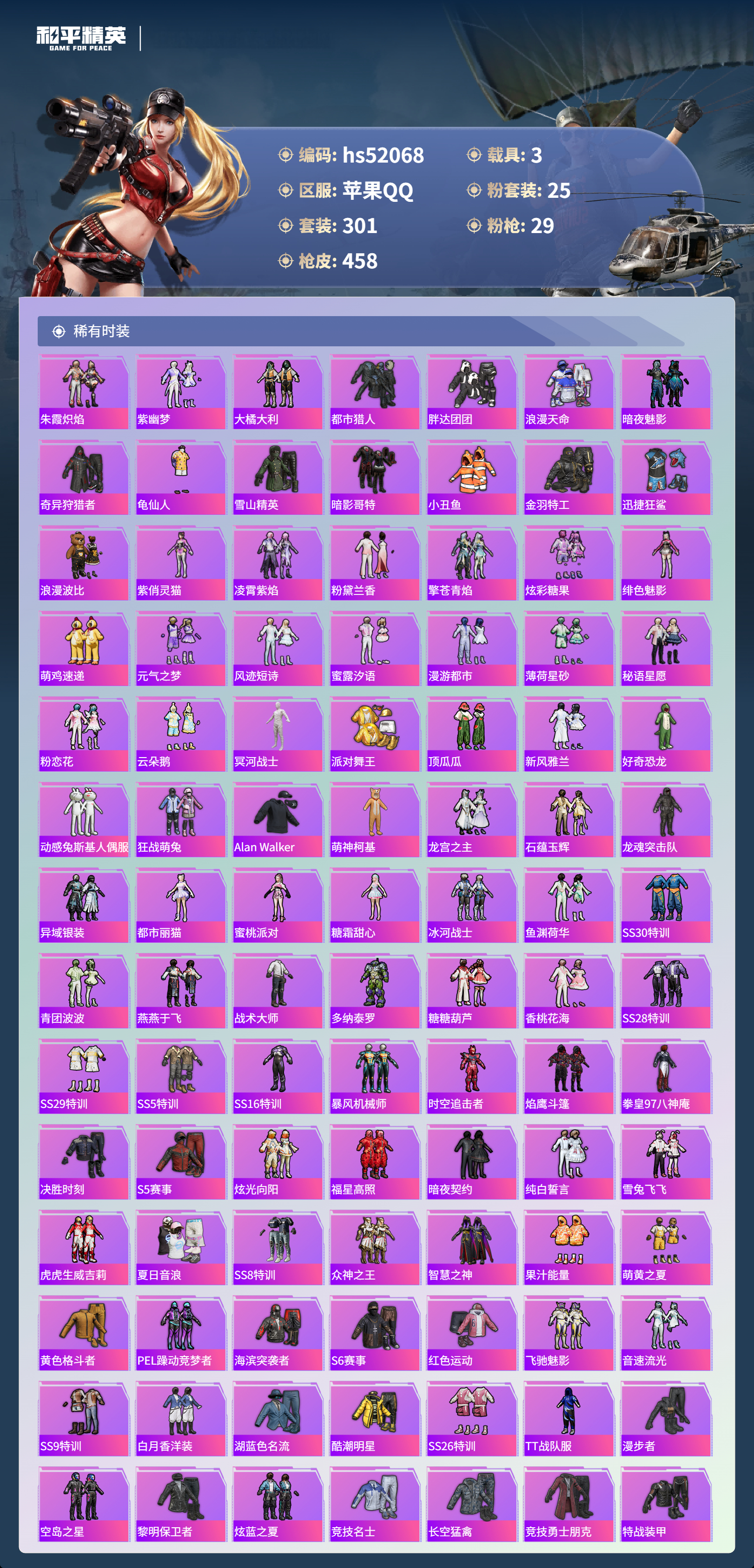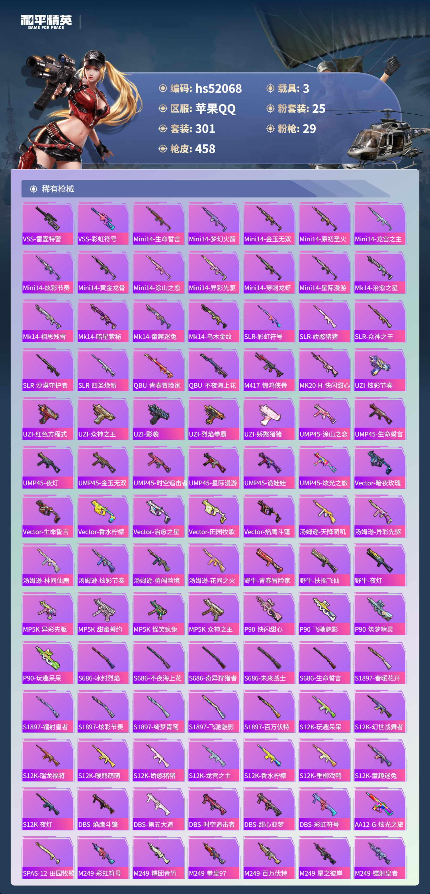 hs52068 苹果手q-31王牌印记-有战神框-1红装-25粉装-29特效呛-3载具-热力值-301套装-458呛皮-13卓越印记-12传奇印记【1红装】金蛇镇世-烛九/3级【25粉装】角色-异瞳寒姬套装-甜蜜誓约套装-星之彼岸套装-炙焰红王套装-飒粉甜心套装-花间之火套装-馨动时刻套装-冰霜白皇角色-洛天依角色-冰魄套装-pel轰鸣竞梦者套装-星穹咏叹调