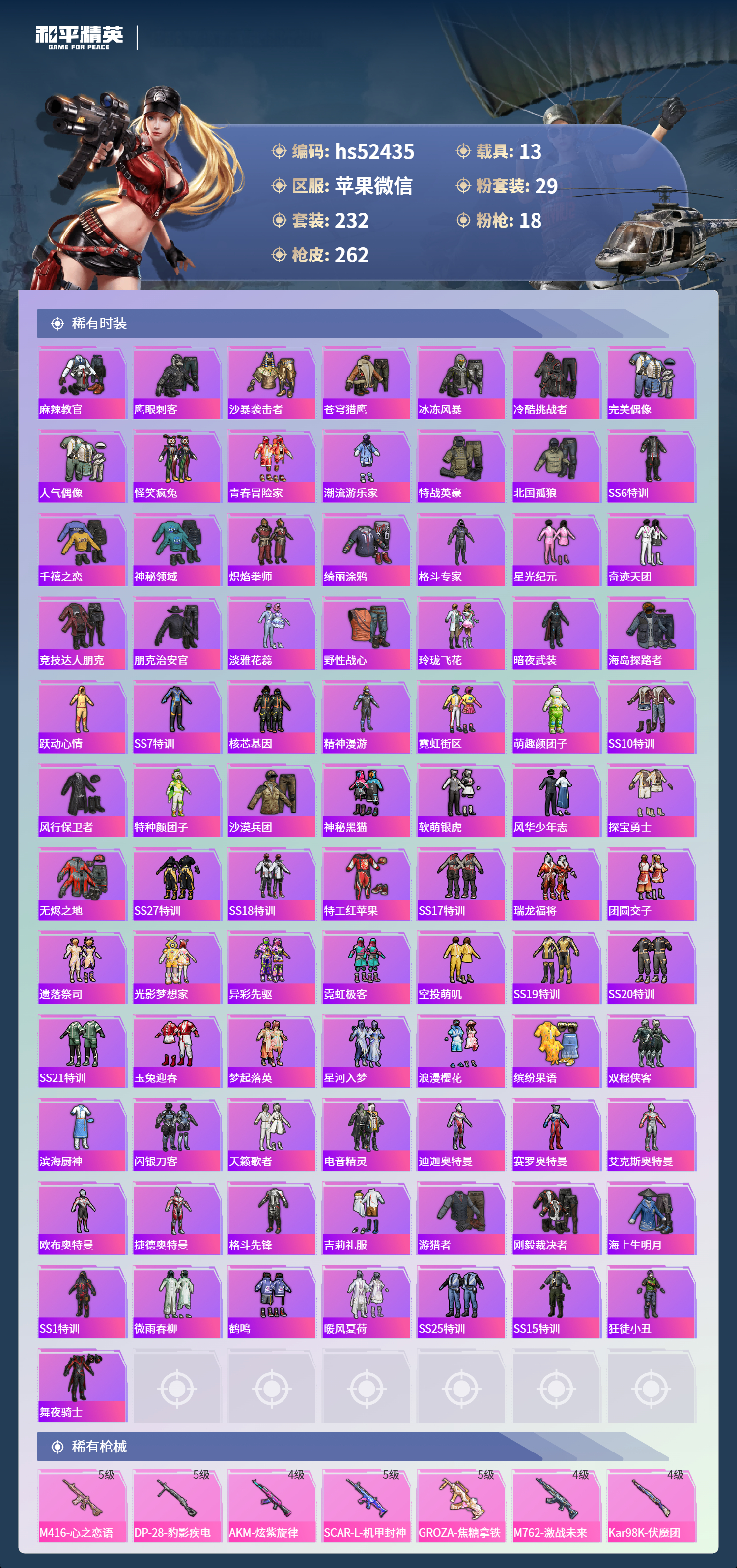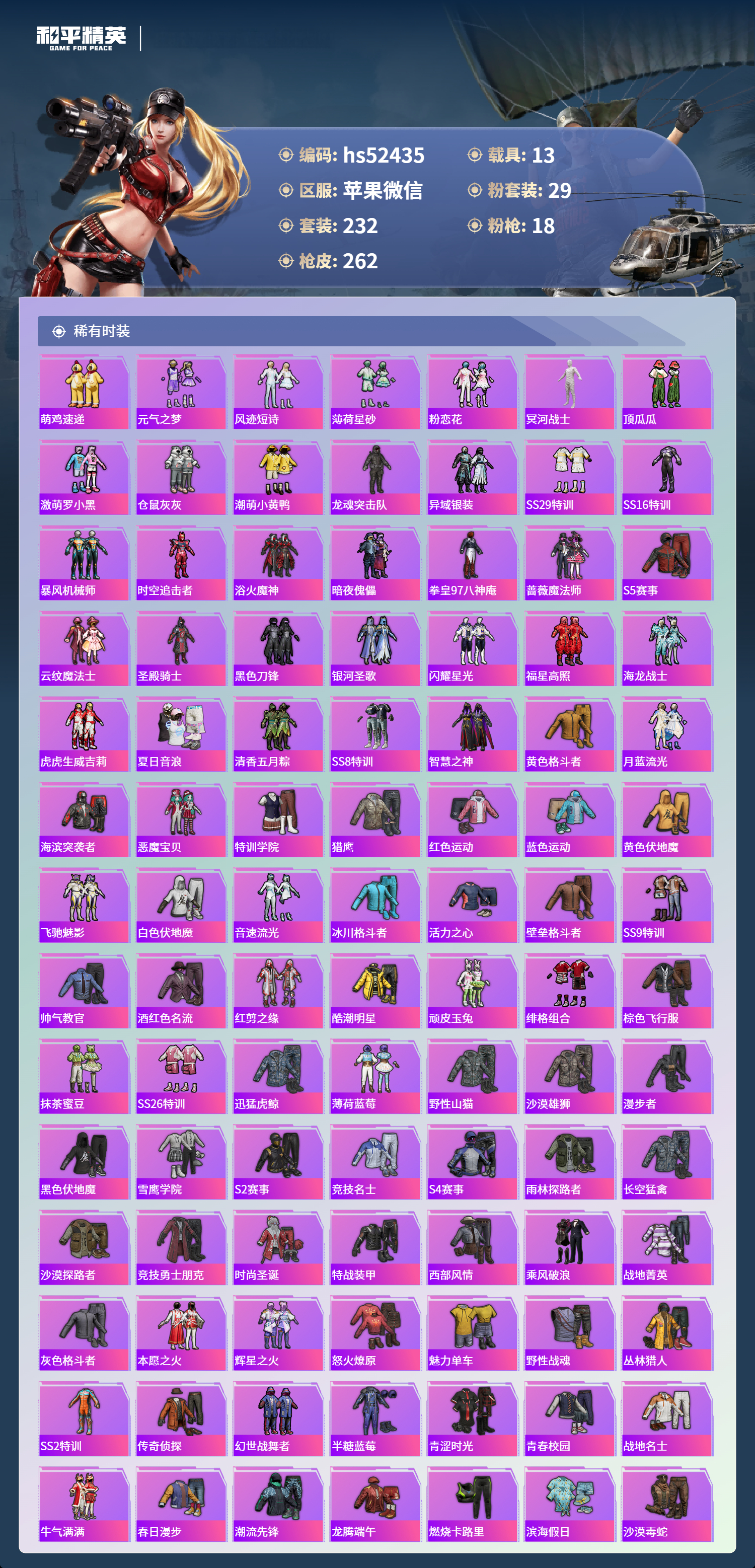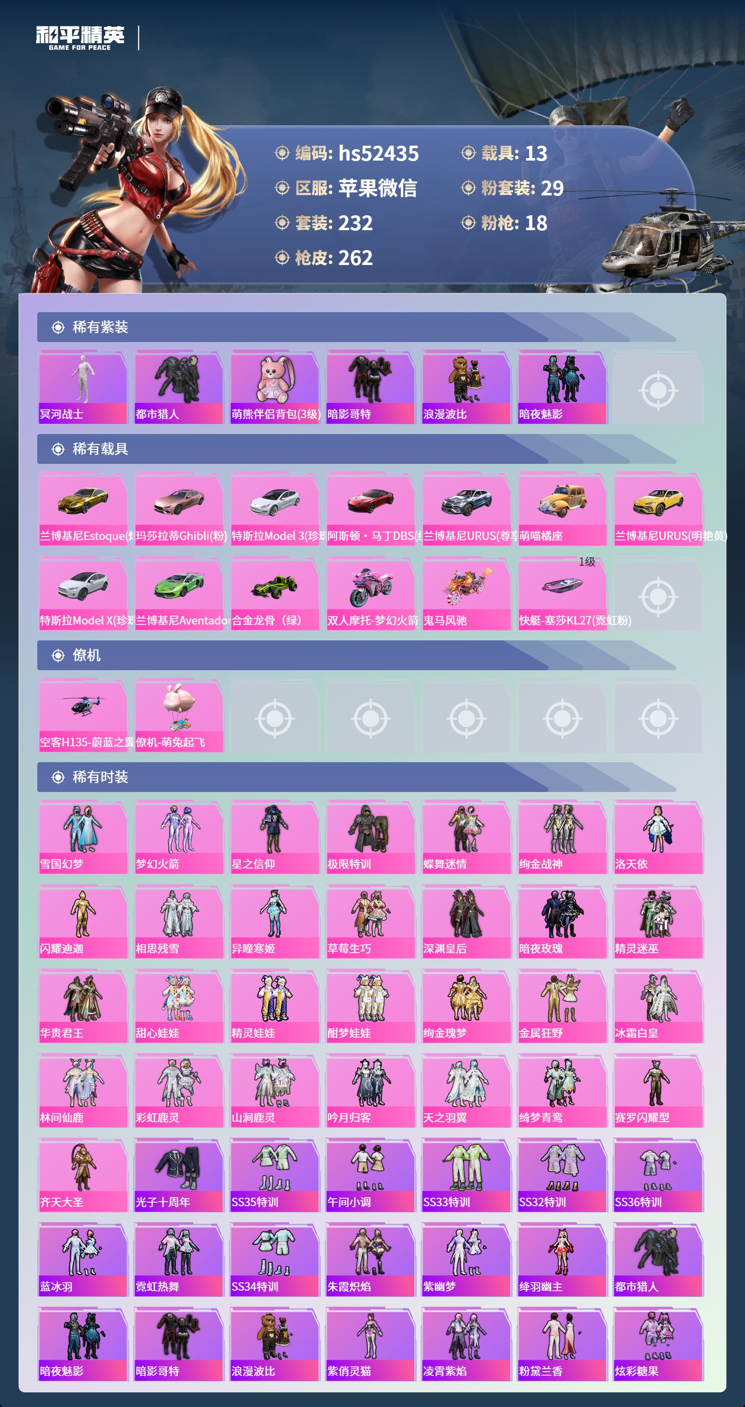 hs52435 苹果微信-10王牌印记-有战神框-29粉装-18特效呛-13载具-热力值-232套装-262呛皮-2卓越印记【29粉装】套装-草莓生巧套装-金属狂野套装-极限特训套装-天之羽翼套装-雪国幻梦套装-蝶舞迷情套装-齐天大圣套装-吟月归客套装-林间仙鹿套装-冰霜白皇角色-异瞳寒姬套装-绚金瑰梦角色-洛天依套装-甜心娃娃套装-绮梦青鸾套装-精灵迷