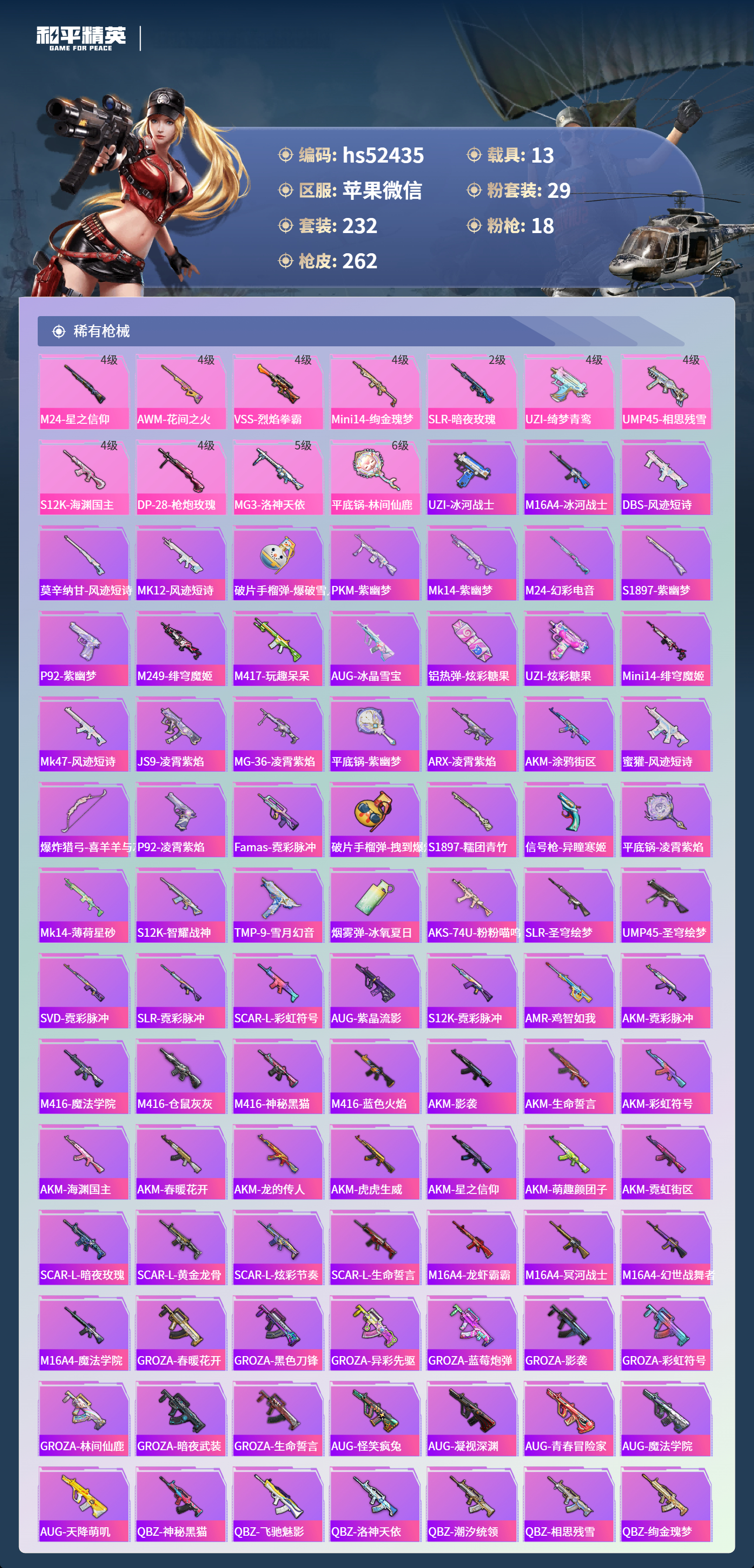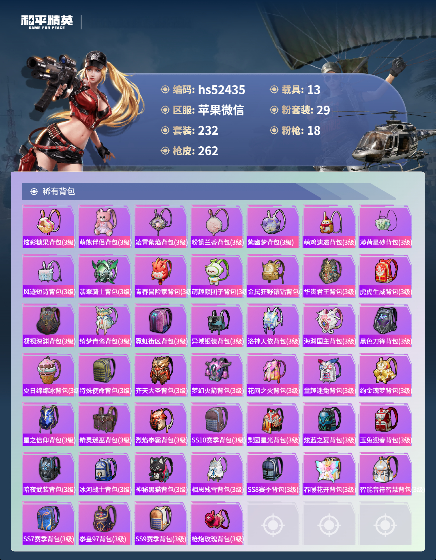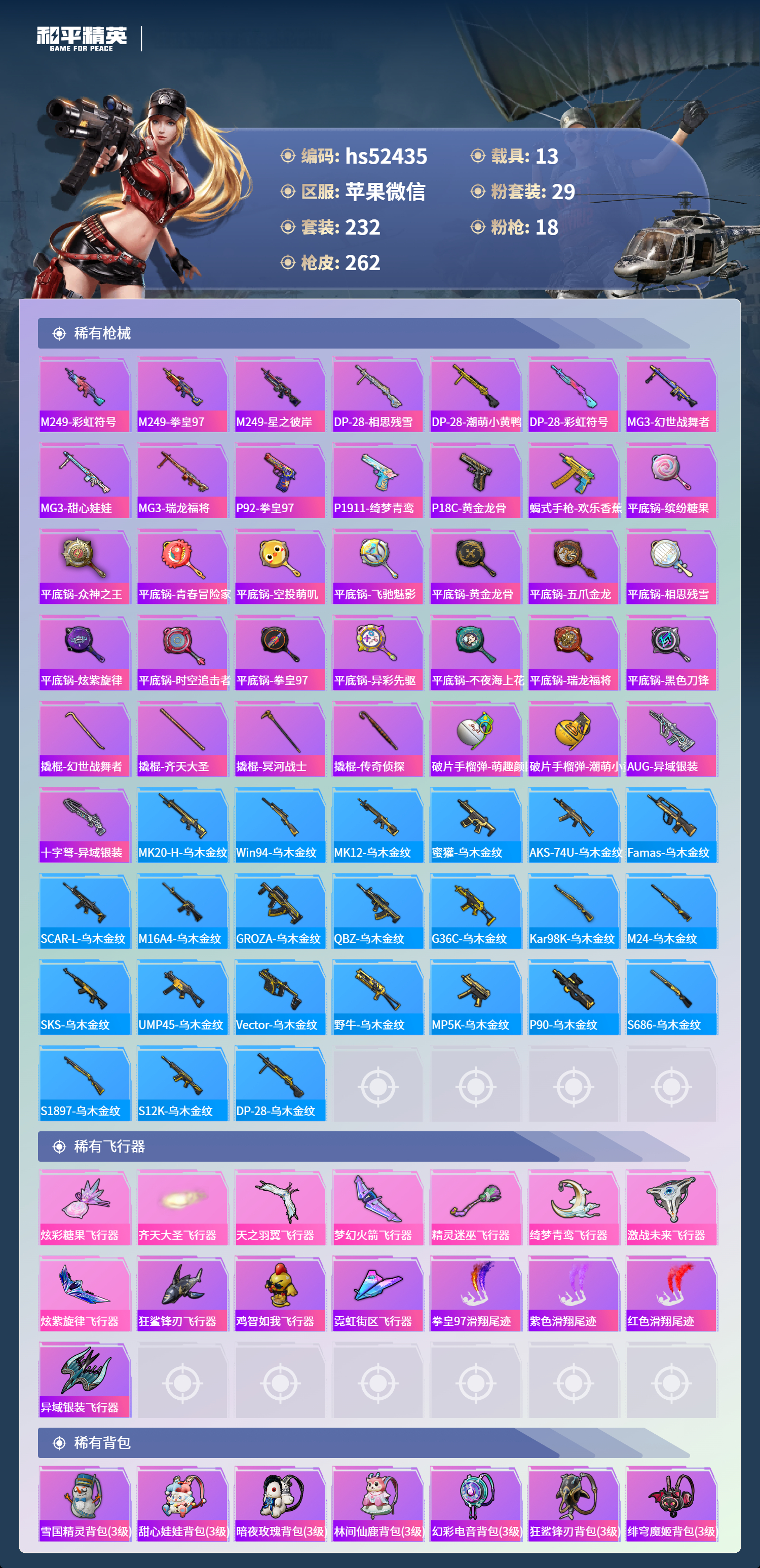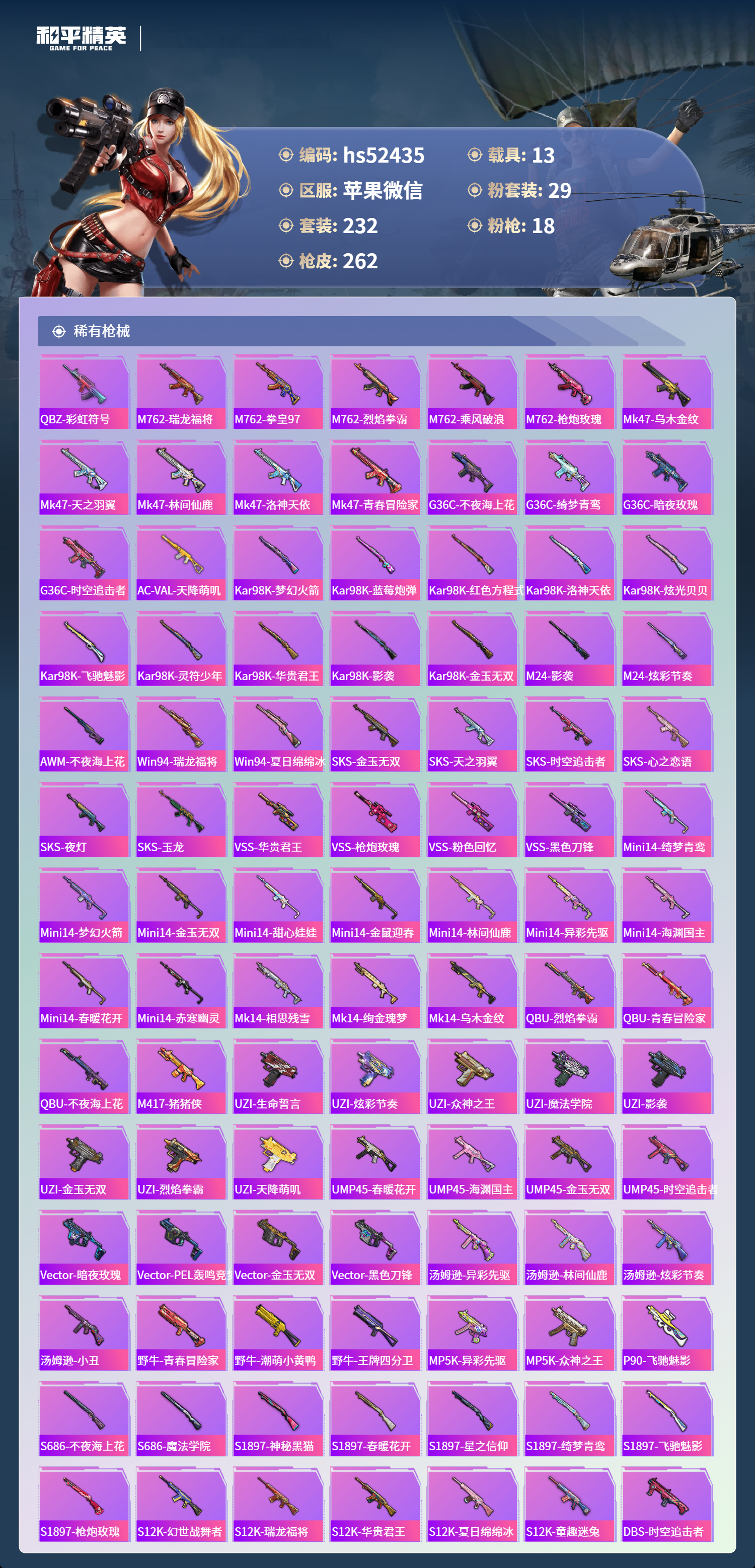 hs52435 苹果微信-10王牌印记-有战神框-29粉装-18特效呛-13载具-热力值-232套装-262呛皮-2卓越印记【29粉装】套装-草莓生巧套装-金属狂野套装-极限特训套装-天之羽翼套装-雪国幻梦套装-蝶舞迷情套装-齐天大圣套装-吟月归客套装-林间仙鹿套装-冰霜白皇角色-异瞳寒姬套装-绚金瑰梦角色-洛天依套装-甜心娃娃套装-绮梦青鸾套装-精灵迷