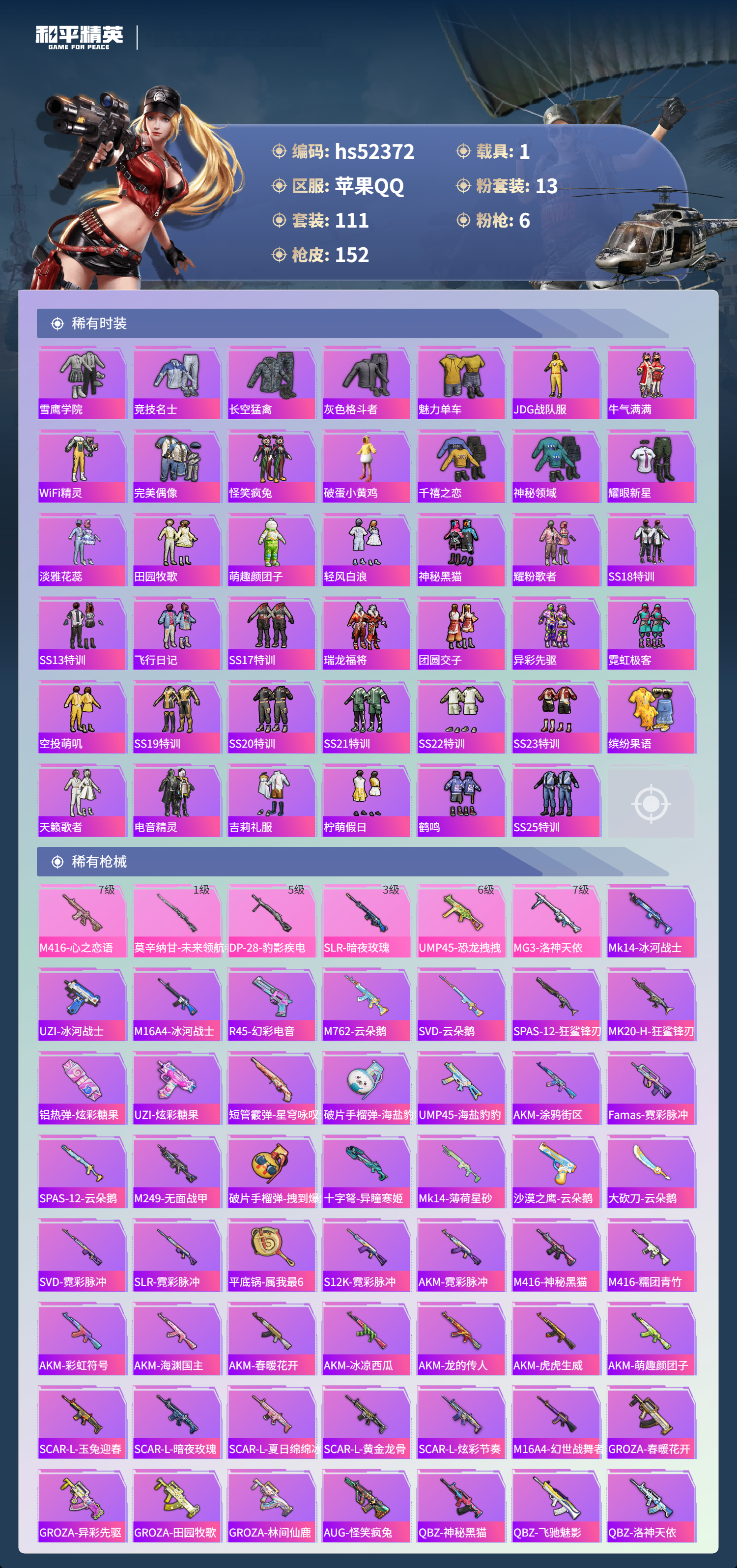 hs52372 苹果手q-9王牌印记-13粉装-6特效呛-1载具-56441热力值-111套装-152呛皮-1卓越印记【13粉装】套装-宝贝奶油派套装-彩虹鹿灵套装-紫电风暴套装-黑伞漫漫套装-天使彩虹糖角色-千金淑猫套装-冷魅冰骑套装-数码大师角色-洛天依套装-甜心巧克力套装-山涧鹿灵套装-草莓生巧套装-黄伞悠悠【6特效呛】ump45-恐龙拽拽/6级slr-暗夜玫瑰