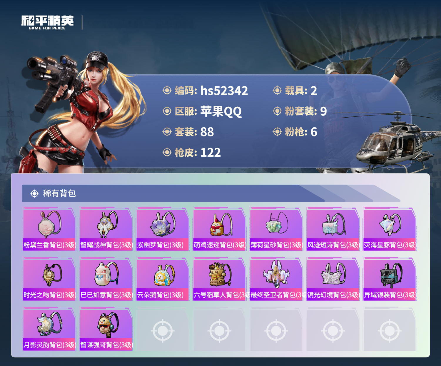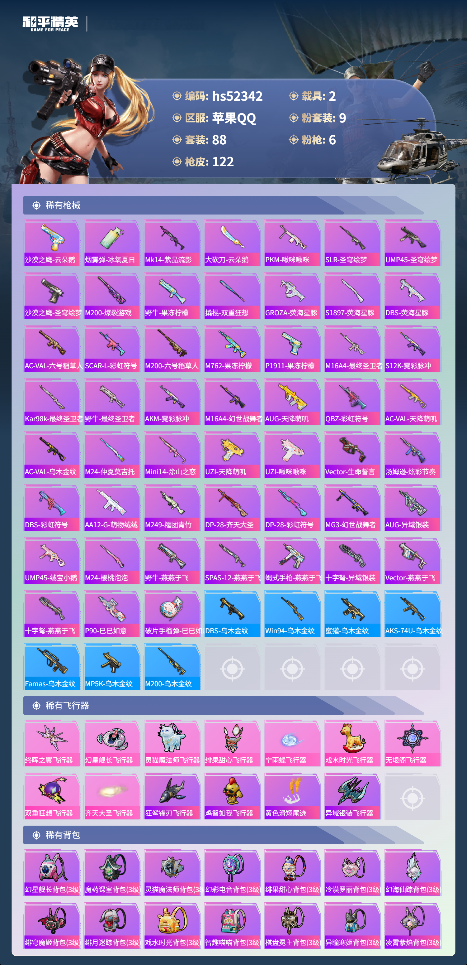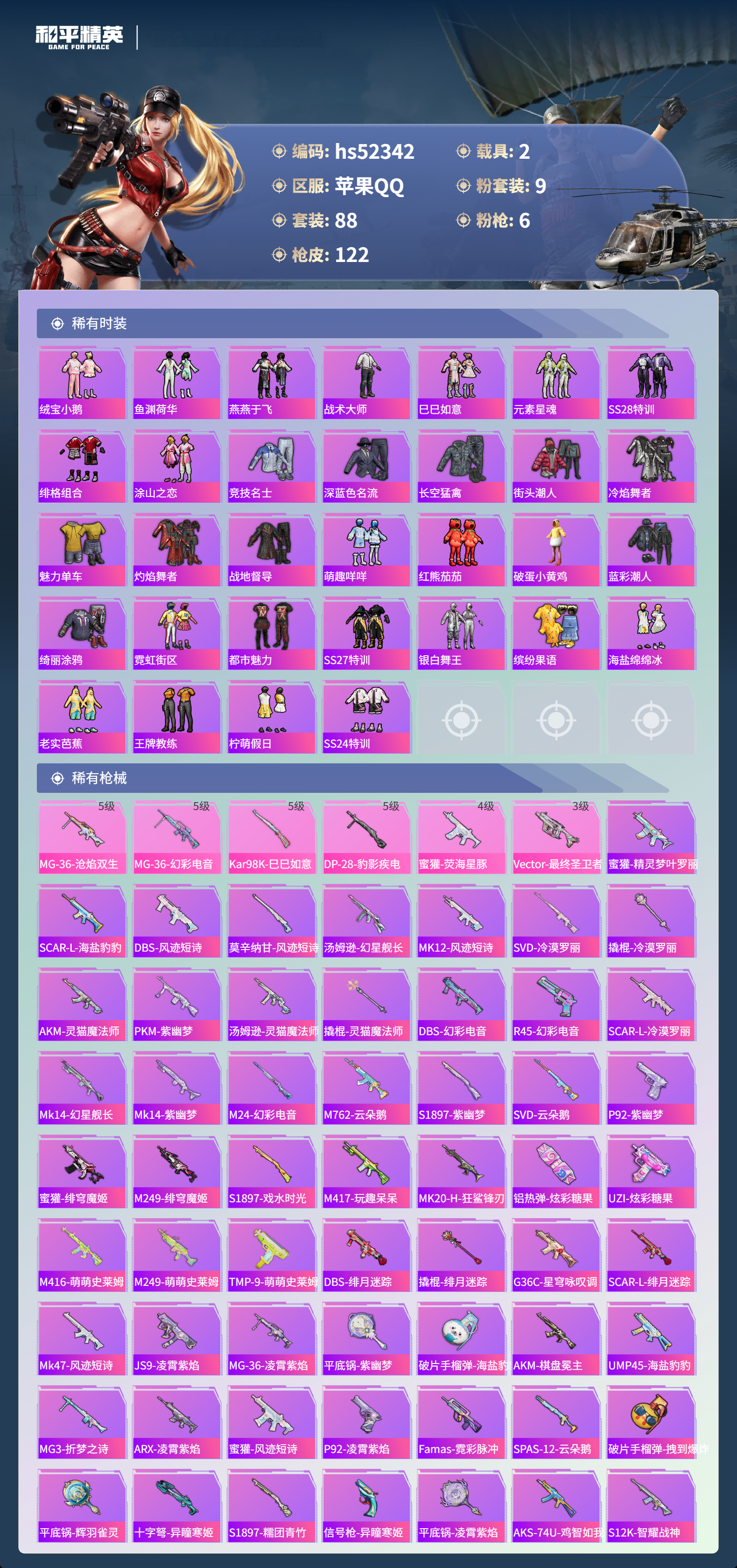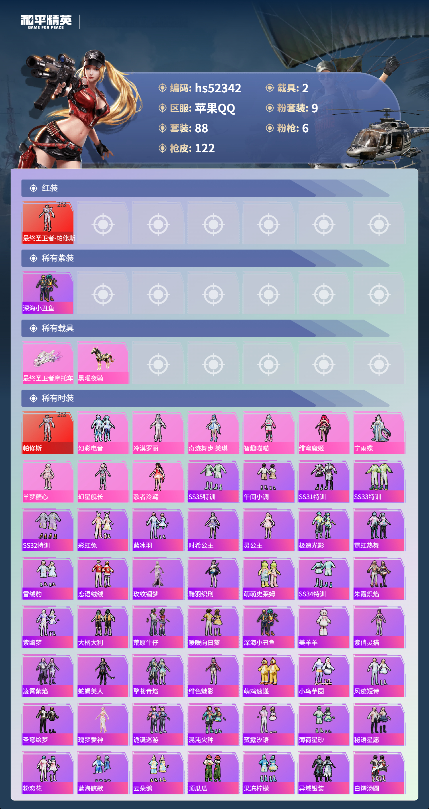 hs52342 苹果手q-6王牌印记-1红装-9粉装-6特效呛-2载具-47430热力值-88套装-122呛皮-2卓越印记-1传奇印记【1红装】最终圣卫者-帕修斯/2级【9粉装】角色-幻星舰长角色-宁雨蝶角色-歌者泠鸢角色-智趣喵喵角色-羊梦糖心角色-奇迹舞步 美琪角色-绯穹魔姬套装-幻彩电音角色-冷漠罗丽【6特效呛】mg-36-沧焰双生/5级vect-最终圣卫者/3级