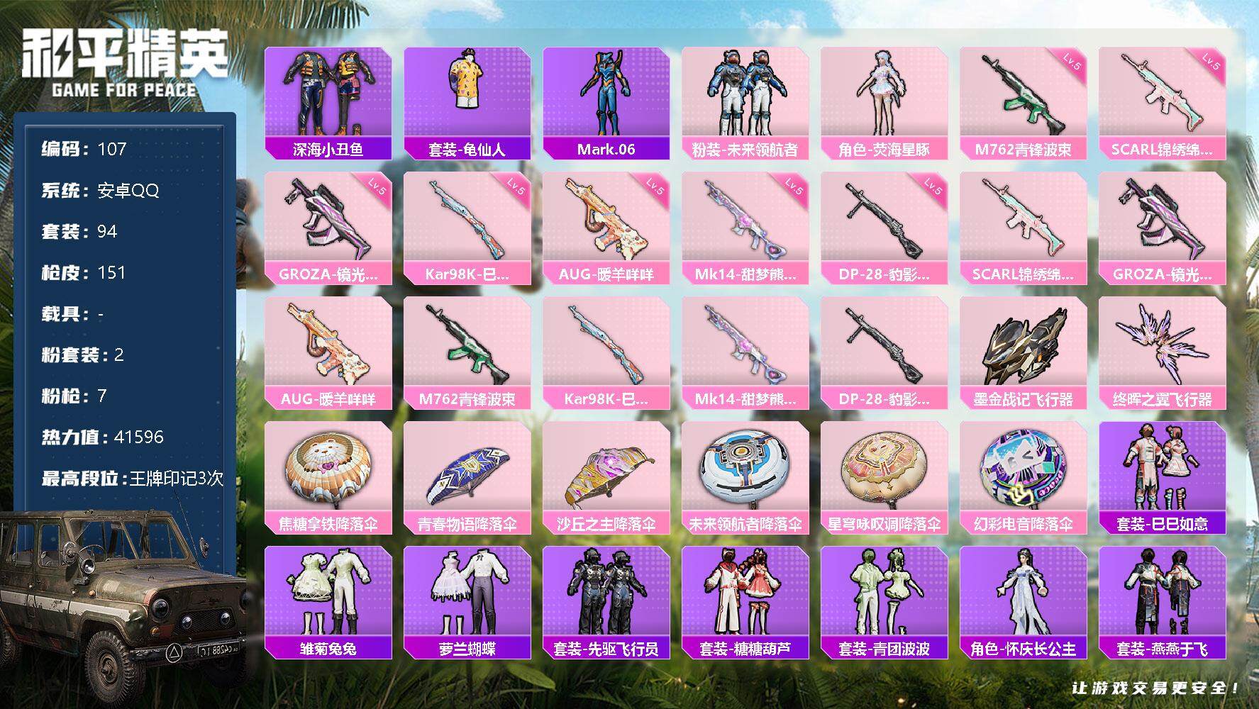 [14354058]【编号42343 可秒换绑】【店长推荐捡漏!!!顶级极品号喜欢的宝宝速抢】安卓 手q-2粉装-7特效呛-0载具-2粉色飞行器-41596热力值-3王牌印记-94套装-151呛皮 【热门品类】:套装-深海小丑鱼,套装-龟仙人,角色-mark.06 【粉色套装】:粉装-未来领航者,角色-荧海星豚 【粉色呛皮等级】:scar-l-锦绣绵绵五级,groza-镜光银凌五级,aug-暖羊咩咩五级,m762-青锋波束五级,kar98k-巳巳如意五级,mk14-甜梦熊击五级,dp-28-豹影疾电五级 【粉色呛皮】:scar-l-锦绣绵绵,groza-镜光银凌,aug-暖羊咩咩,m762-青锋波束,kar98k-巳巳如意,mk14-甜梦熊击,dp-28-豹影疾电 【粉色飞行器】:墨金战记飞行器,终晖之翼飞行器 【粉色降落伞】:焦糖拿铁降落伞,青春物语降落伞,沙丘之主降落伞,未来领航者降落伞,星穹咏叹调降落伞,幻彩电音降落伞 【稀有套装】:套装-龟仙人,套装-巳巳如意,套装-雏菊兔兔,套装-萝兰蝴蝶,套装-先驱飞行员,套装-糖糖葫芦,套装-青团波波,角色-怀庆长公主,套装-燕燕于飞,套装-鱼渊荷华,套装-白辉玉蕊,套装-紫幽梦,套装-蓝冰羽,套装-虚空漩涡,套装-引力深渊,套装-云朵鹅,套装-雪绒豹,角色-乐音,套装-朱霞炽焰,套装-凌霄紫焰 【稀有呛皮】:akm-夜灯,akm-彩虹符号,akm-破晓战魂,akm-虎虎生威,akm-龙的传人,akm-棋盘冕主,m16a4-幻世战舞者,m16a4-蓝色火焰,scar-l-炫彩节奏,scar-l-玉兔迎春,scar-l-红色方程式,m416-红色方程式,m416-蓝色火焰,groza-彩虹符号,aug-天降萌叽,aug-耀粉歌者,q-彩虹符号,q-飞驰魅影,m762-天降萌叽,m762-云朵鹅,ac-val-天降萌叽,蜜獾-天降萌叽,arx-凌霄紫焰,uzi-天降萌叽,uzi-炫彩节奏,uzi-红色方程式,ump45-炫光之旅,ump45-蓝色火焰,vect-彩虹符号,vect-生命誓言,汤姆逊-天降萌叽,汤姆逊-奇异狩猎者,汤姆逊-炫彩节奏,汤姆逊-耀粉歌者,野牛-最终圣卫者,js9-凌霄紫焰,p90-飞驰魅影,p90-巳巳如意,kar98k-红色方程式,kar98k-飞驰魅影,kar98k-