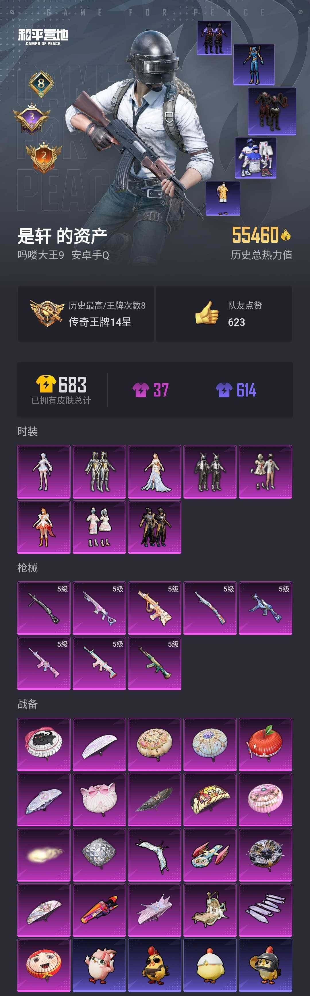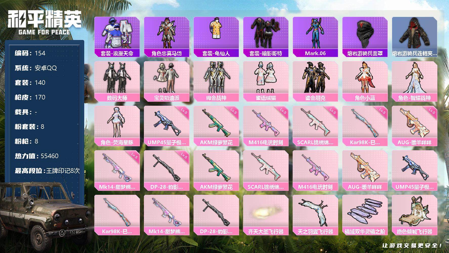 [14354409]【编号68075 可秒换绑】【店长推荐捡漏!!!顶级极品号喜欢的宝宝速抢】安卓 手q-8粉装-8特效呛-0载具-6粉色飞行器-55460热力值-8王牌印记-140套装-170呛皮 【热门品类】:套装-浪漫天命,角色-忠真马岱,套装-龟仙人,套装-暗影哥特,角色-mark.06,熔岩游骑兵面罩,熔岩游骑兵连帽夹克 【粉色套装】:粉装-数码大师,粉装-宝贝奶油派,粉装-绚金战神,粉装-蜜语绒猫,粉装-鎏金朋克,角色-小蓝,角色-智耀战神,角色-荧海星豚 【粉色呛皮等级】:akm-绿萝繁花五级,scar-l-锦绣绵绵五级,m416-电玩时刻五级,aug-暖羊咩咩五级,ump45-量子极限五级,kar98k-巳巳如意五级,mk14-甜梦熊击五级,dp-28-豹影疾电五级 【粉色呛皮】:akm-绿萝繁花,scar-l-锦绣绵绵,m416-电玩时刻,aug-暖羊咩咩,ump45-量子极限,kar98k-巳巳如意,mk14-甜梦熊击,dp-28-豹影疾电 【粉色飞行器】:齐天大圣飞行器,天之羽翼飞行器,镜域双华-灵镜之阶,绝色倾城飞行器,霓虹漫游飞行器 【粉色降落伞】:甜心宝贝降落伞,千面幻镜降落伞,镜光幻境降落伞,猪猪侠降落伞,江南烟雨降落伞,精灵梦叶罗丽降落伞,墨龙九天降落伞,守护天翼降落伞,英伦信使降落伞,千金淑猫降落伞,赛博古神降落伞,智耀战神降落伞,绯果甜心降落伞,星穹咏叹调降落伞,绯穹魔姬降落伞 【稀有套装】:套装-龟仙人,套装-小鸟芋圆,套装-雏菊兔兔,套装-萝兰蝴蝶,角色-米开朗基罗,套装-糖糖葫芦,套装-青团波波,套装-棉花软糖,角色-摩登魅猫,角色-怀庆长公主,套装-燕燕于飞,套装-鱼渊荷华,套装-风舞幻音,角色-幽秘之星,套装-粉恋花,套装-紫幽梦,套装-蓝冰羽,角色-猎影月神,套装-星渊小夜曲,玩偶服-喜羊羊 【稀有呛皮】:akm-彩虹符号,akm-缤纷海域,akm-萌趣颜团子,akm-霓虹街区,akm-龙的传人,m16a4-幻世战舞者,m16a4-千金淑猫,m16a4-雨林猎影,m416-糯团青竹,m416-红色方程式,m416-蓝色火焰,aug-幻影战神,aug-诡面斩,q-彩虹符号,m762-萌物绒绒,ac-val-快闪甜心,蜜獾-天降萌叽,蜜獾-御兔特攻,ace32-蓝晶绮麟,uzi-啾咪啾咪,uzi-天降萌叽