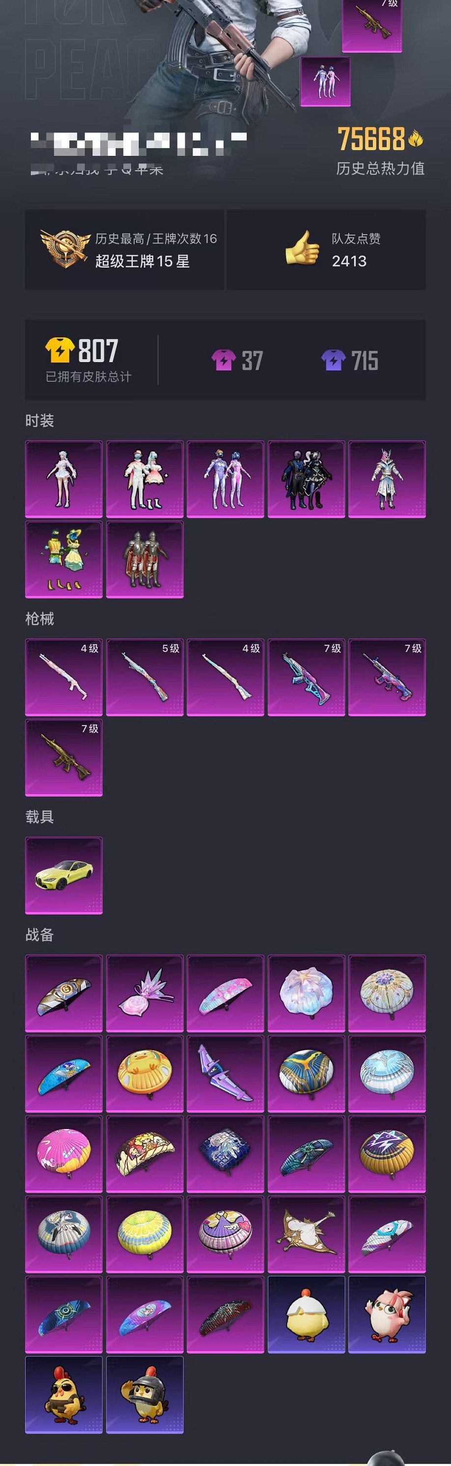 【连体号 梦幻满级五爪7粉装6特效呛1载具带王者2典藏15传说 可秒换绑】 苹果q区-75668热力值-16印记-146套装-221呛皮 【1载具】 宝马m4圣保罗黄【2稀有】 mark.06 奇异狩猎者【7粉装】 梦幻火箭 香水柠檬 暗夜玫瑰 旋转彩虹 铁血龙王 守护骑士 角色-荧海星豚【6特效呛】 m416-五爪金龙7级 kar98k-未来歌姬4级 akm-梦之光华7级 sc