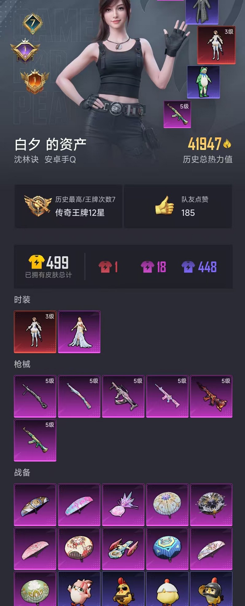 【3级欧若拉 1粉装6特效呛 可秒换绑】 安卓q区-41947热力值-7印记-100套装-138呛皮 【1红装】 镜域双华-欧若拉3级【1稀有】 mark.06【1粉装】 角色-智耀战神【6特效呛】 m416-风花雪月5级 akm-绿萝繁花5级 m416-电玩时刻5级 groza-镜光银凌5级 kar98k-巳巳如意5级 dp-28-豹影疾电5级【14热门】 长空猛禽 霓虹街区 鹰眼刺客 破蛋小黄鸡 暗影哥特红眼罩 白色伏地魔 ss27特训 ss26特训 ss25特训 mark.06 m762-天降萌叽 m249-彩虹符号 mg3-幻世战舞者 akm-霓虹街区【3飞行器】 空岛之星尾迹 鸿潮鸣舰飞行器 炫彩糖果飞行器 营地id:954690602