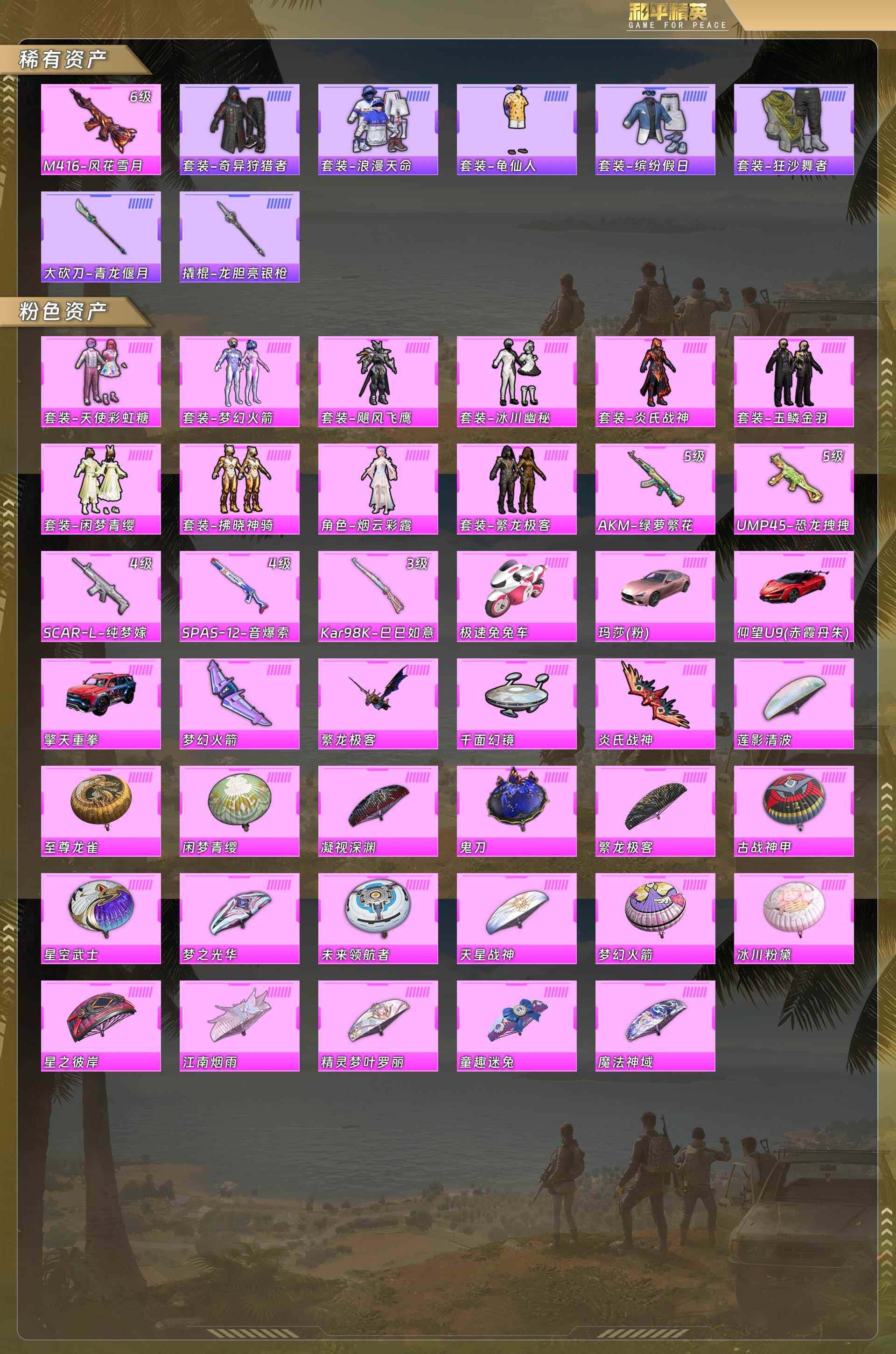 身法号-马上地铁满天赋-火箭少女/浪漫天命/奇异狩猎者/繁龙极客/缤纷假日/狂沙舞者/天使彩虹糖/飓风飞鹰/冰川幽秘/炎氏战神/玉鳞金羽/闲梦青缨/拂晓神骑/烟云彩露/m4风花雪月6级/akm绿萝繁花5级/ump45恐龙拽拽5级【载具】极速兔兔车/玛莎粉/仰望u9赤霞丹朱/擎天重拳 没战神框(10粉套6粉呛4载具)hp3831-4粉色飞行器-77091热力值-13王牌印记-179套装-233呛皮 【热门品类】:粉装-梦幻火箭,粉装-繁龙极客,套装-浪漫天命,套装-奇异狩猎者,角色-忠真马岱,角色-忠义严颜,套装-龟仙人,大砍刀-青龙偃月刀,撬棍-龙胆亮银呛 【粉色载具】:玛莎拉蒂ghibli(粉),仰望u9(赤霞丹朱),擎天重拳,极速兔兔车 【粉色套装】:粉装-天使彩虹糖,粉装-梦幻火箭,粉装-飓风飞鹰,粉装-冰川幽秘,粉装-玉鳞金羽,粉装-炎氏战神,粉装-拂晓神骑,粉装-闲梦青缨,粉装-繁龙极客,角色-烟云彩露 【粉色呛皮等级】:akm-绿萝繁花五级,scar-l-纯梦嫁纱四级,m416-风花雪月六级,ump45-恐龙拽拽五级,kar98k-巳巳如意三级,spas-12-音爆索尼克四级 【粉色呛皮】:akm-绿萝繁花,scar-l-纯梦嫁纱,m416-风花雪月,ump45-恐龙拽拽,kar98k-巳巳如意,spas-12-音爆索尼克 【粉色飞行器】:梦幻火箭飞行器,千面幻镜飞行器,繁龙极客飞行器 【粉色降落伞】:凝视深渊降落伞,至尊龙雀降落伞,梦幻火箭降落伞,童趣迷兔降落伞,星之彼岸降落伞,梦之光华降落伞,古战神甲降落伞,冰川粉黛降落伞,天星战神降落伞,闲梦青缨降落伞,莲影清波降落伞,繁龙极客降落伞,江南烟雨降落伞,星空武士降落伞,精灵梦叶罗丽降落伞,魔法神域降落伞,未来领航者降落伞,鬼刀降落伞 【稀有套装】:套装-龟仙人,套装-巳巳如意,套装-雏菊兔兔,套装-萝兰蝴蝶,套装-小熊娃娃,角色-达芬奇,套装-先驱飞行员,套装-糖糖葫芦,套装-青团波波 【稀有呛皮】:akm-2p战斗服款,akm-夜灯,akm-奇异狩猎者,akm-彩虹符号,akm-灼热熔岩,akm-环太平洋,akm-破晓战魂,akm-萌趣颜团子,akm-虎虎生威,akm-霓虹街区,akm-龙的传人,m16a4-幻世战舞者,m16a4-甜心亚梦,scar-l-夏日绵绵冰,scar-l-炫彩节奏,scar-l-玉兔迎春,scar-l-红色方程式,m416-夜灯,m416-糯团青竹,m416-红色方程式,m416-绯红前夜,m416-蓝色火焰,groza-异彩先驱,groza-彩虹符号,groza-懵萌河马,groza-治愈之星,groza-田园牧歌,groza-黑色刀锋,aug-冰川粉黛,aug-青春冒险家,q-彩虹符号,q-未来歌姬,q-电玩视界,q-飞驰魅影,m762-天星战神,m762-天降萌叽,m762-奇异狩猎者,m762-牛气冲天,m762-瑞龙福将,m762-第五大道,m762-风花雪月,mk47-妙红点点,mk47-炫光之旅,mk47-青春冒险家,g36c-懵萌河马,g36c-时空追击者,ac-val-天降萌叽,ac-val-快闪甜心,ac-val-甜心亚梦,ac-val-闲梦青缨,蜜獾-天降萌叽,蜜獾-娇憨猪猪,uzi-天降萌叽,uzi-娇憨猪猪,uzi-炫彩节奏,uzi-红色方程式,uzi-金玉无双,ump45-繁龙极客,ump45-仲夏莫吉托,ump45-时空追击者,ump45-涂山之恋,ump45-生命誓言,vect-焰鹰斗篷,vect-彩虹符号,vect-治愈之星,vect-生命誓言,vect-田园牧歌,汤姆逊-天降萌叽,汤姆逊-奇异狩猎者,汤姆逊-幻影战神,汤姆逊-异彩先驱,汤姆逊-暗夜鎏金,汤姆逊-炫彩节奏,汤姆逊-耀粉歌者,野牛-天星战神,野牛-青春冒险家,mp5k-异彩先驱,p90-快闪甜心,p90-飞驰魅影,kar98k-彩虹符号,kar98k-影袭,kar98k-梦幻火箭,kar98k-红色方程式,kar98k-飞驰魅影,m24-治愈之星,m24-炫彩节奏,m24-仲夏莫吉托,m24-奇异狩猎者,awm-焰鹰斗篷,awm-王牌四分卫,sks-心之恋语,sks-时空追击者,sks-未来歌姬,sks-炫彩节奏,vss-彩虹符号,vss-田园牧歌,mini14-异彩先驱,mini14-春暖花开,mini14-梦幻火箭,mini14-涂山之恋,mk14-治愈之星,mk14-童趣迷兔,mk14-绚金瑰梦,win94-瑞龙福将,slr-娇憨猪猪,slr-彩虹符号,qbu-青春冒险家,莫辛纳甘-懵萌河马,莫辛纳甘-炙焰牛王,amr-妙红点点,amr-暗夜行者,amr-鬼刀,m417-惊鸿侠骨,mk20-h-快闪甜心,m200-惊鸿侠骨,s686-奇异狩猎者,s686-彩虹符号,s686-生命誓言,s1897-暗夜鎏金,s1897-炫彩节奏,s1897-飞驰魅影,s12k-玩趣呆呆,s12k-瑞龙福将,s12k-破晓战魂,s12k-垂柳戏鸭,s12k-娇憨猪猪,s12k-幻世战舞者,dbs-焰鹰斗篷,dbs-彩虹甜喵,dbs-时空追击者,dbs-甜心亚梦,spas-12-田园牧歌,m249-妙红点点,m249-彩虹符号,m249-糯团青竹,m249-镭射皇者,dp-28-焰鹰斗篷,dp-28-古战神甲,dp-28-彩虹符号,dp-28-旋转彩虹,dp-28-甜心亚梦,mg3-妙红点点,mg3-幻世战舞者,mg3-惊鸿侠骨,mg3-暗夜行者,mg3-瑞龙福将,pkm-懵萌河马,p18c-黄金龙骨,沙墨之鹦-快闪甜心,沙墨之鹦-旋转彩虹,tmp-9-未来歌姬,战术弩-江南烟雨,爆炸猎弓-惊鸿侠骨,大砍刀-青龙偃月刀 【其他套装】:套装-ss14特训,套装-ss15特训,套装-ss16特训,套装-ss17特训,套装-ss18特训,套装-ss19特训,套装-ss20特训,套装-ss21特训,套装-ss22特训,套装-ss23特训,套装-ss24特训,套装-ss25特训,套装-ss26特训,套装-ss27特训,套装-ss28特训,套装-ss29特训,套装-光之冒险,套装-六六大吉,套装-军械专家,套装-冷焰舞者,套装-千禧之恋,套装-吉莉礼服,套装-夏日音浪,套装-幻世战舞者,套装-幻影武者,套装-怒火燎原,套装-战地督导,套装-探宝勇士,套装-春日漫步,套装-极速红龙,套装-柠萌假日,套装-格斗先锋,套装-沙漠兵团,套装-浪漫天命,套装-海上生明月,套装-涂山之恋,套装-深蓝色名流,套装-湖蓝色名流,套装-滨海假日,套装-灼焰舞者,套装-炫蓝之夏,套装-热血青春,套装-燃烧卡路里,套装-牛气冲天,套装-牛气满满,套装-特种颜团子,套装-特训学院,套装-狂沙舞者,套装-玉兔迎春,套装-王牌教练,套装-甜蜜熊情侣,套装-白色伏地魔