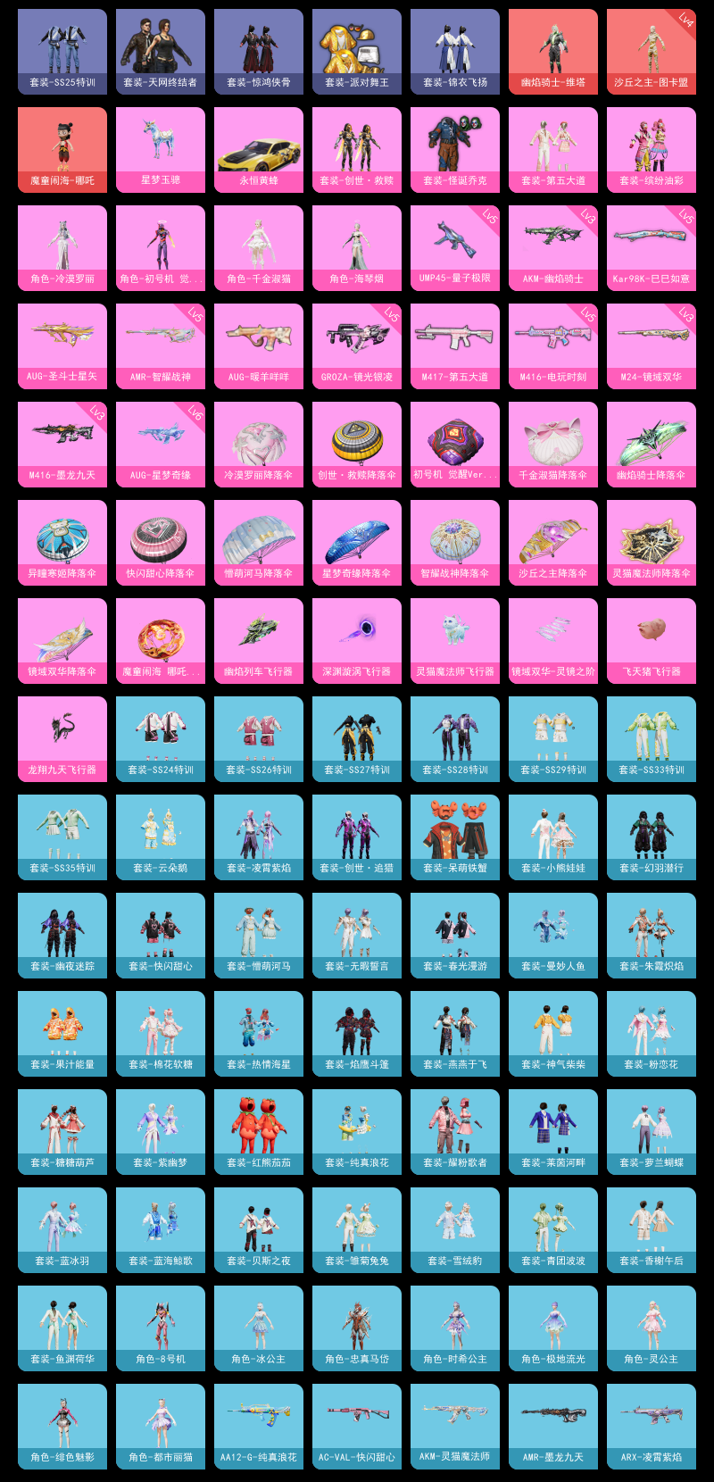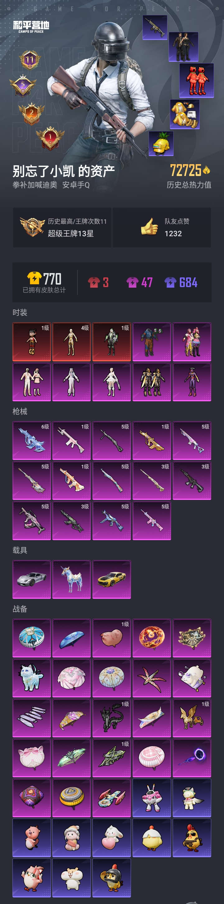 【和平精英】【lyhp17436】3红装7粉装14特效呛3载具【4级图卡盟/6级星梦aug】怪诞乔克 天网终结者 派对舞王 觉醒螳螂 第五大道 缤纷油彩 千金淑猫 红熊茄茄 幽焰ak 墨龙m4 星空马 保时捷 7粉装,14特效呛,3载具,历史最高段位:超级王牌13星 王牌印记11次 热力值:72725,135套装,203呛械,262装备,143战备;套装:沙丘之主-图卡盟,幽焰骑士-维塔,魔童闹海-哪吒,套装-怪诞乔克,套装-缤纷油彩,套装-第五大道,角色-初号机 觉醒ver.,套装-创世·救赎,角色-千金淑猫,角色-冷漠罗丽,套装-特训学院,套装-猎鹰,套装-青年教官,套装-橘黑制服,套装-红色运动,套装-黄色运动,套装-蓝色运动,套装-黄色伏地魔,套装-白色伏地魔,套装-黑色伏地魔,套装-竞技名士,套装-深蓝色名流,套装-酒红色名流,套装-湖蓝色名流,套装-黄色名流,套装-猛禽,套装-长空猛禽,套装-黎明保卫者,套装-海岛探路者,套装-旭日情侣,套装-冷焰舞者,套装-浪漫假日,套装-活力之心,套装-春日漫步,套装-燃烧卡路里,套装-蓝彩潮人,套装-魅力单车,套装-耀眼新星,套装-坚韧舞者,套装-竞技达人朋克,套装-超能勇士,套装-破晓战魂,套装-森林游猎者,套装-荣耀,套装-派对舞王,套装-呆萌铁蟹,套装-缤纷果语,套装-龙魂突击队,套装-天网终结者,套装-破蛋小黄鸡,套装-疯狂小兔子,套装-霓虹街区,套装-战术大师,套装-耀粉歌者,套装-曼妙人鱼,套装-热情海星,套装-纯真浪花,套装-红熊茄茄,套装-玉兔迎春,套装-光之冒险,套装-绯格组合,套装-莱茵河畔,套装-香榭午后,套装-神气柴柴,套装-懵萌河马,套装-青玉碎影,套装-ss24特训,套装-花园小羊咩,套装-龟仙人,套装-ss25特训,套装-惊鸿侠骨,套装-锦衣飞扬,套装-香桃花海,套装-果汁能量,套装-龙的传人,套装-冰河战士,套装-ss26特训,套装-快闪甜心,套装-春光漫游,套装-漫游都市,套装-空岛之星,套装-无暇誓言,套装-贝斯之夜,角色-忠真马岱,套装-焰鹰斗篷,套装-幽夜迷踪,套装-幻羽潜行,套装-ss27特训,套装-恋语绒绒,套装-老实芭蕉,套装-ss28特训,角色-极地流光,角色-冰公主,角色-8号机,套装-街头风暴,套装-海盐绵绵冰,套装-蝶变,套装-创世·追猎,套装-小熊娃娃,套装-ss29特训,套装-雏菊兔兔,套装-萝兰蝴蝶,角色-绯色魅影,套装-异域银装,角色-都市丽猫,套装-星途旅人,套装-ss30特训,套装-青团波波,套装-棉花软糖,套装-糖糖葫芦,套装-ss31特训,套装-鱼渊荷华,套装-燕燕于飞,套装-智谋强哥,角色-海琴烟,套装-紫幽梦,套装-粉恋花,套装-ss33特训,套装-云朵鹅,套装-巳巳如意,套装-ss32特训,套装-蓝冰羽,套装-顶瓜瓜,套装-雪绒豹,套装-大橘大利,角色-时希公主,角色-灵公主,套装-蓝海鲸歌,套装-元气之梦,套装-ss34特训,套装-朱霞炽焰,套装-凌霄紫焰,套装-薄荷星砂,套装-ss35特训,套装-萌鸡速递;呛皮:6级aug-星梦奇缘,1级aug-圣斗士星矢,1级aug-暖羊咩咩,aug-甜蜜菠萝,aug-终结者,aug-耀粉歌者,aug-天降萌叽,aug-异域银装,aug-紫晶流影,3级m416-墨龙九天,5级m416-电玩时刻,m416-蓝色火焰,m416-红色方程式,m416-糯团青竹,3级akm-幽焰骑士,akm-破晓战魂,akm-霓虹街区,akm-涂鸦街区,akm-彩虹符号,akm-虎虎生威,akm-龙的传人,akm-荧星灵猫,akm-灵猫魔法师,蜜獾-天降萌叽,蜜獾-精灵梦叶罗丽,蜜獾-糖糖葫芦,蜜獾-绯穹魔姬,蜜獾-乌木金纹,scar-l-黄金龙骨,scar-l-夜灯,scar-l-玉兔迎春,scar-l-星途旅人,scar-l-海盐豹豹,scar-l-冷漠罗丽,arx-凌霄紫焰,famas-墨龙九天,famas-镜域双华,famas-霓彩脉冲,famas-乌木金纹,m762-彩虹符号,m762-第五大道,m762-雏菊兔兔,m762-云朵鹅,m16a4-红色方程式,m16a4-冰河战士,m16a4-千金淑猫,ac-val-乌木金纹,ac-val-快闪甜心,5级groza-镜光银凌,groza-懵萌河马,groza-海盐豹豹,q-纯真浪花,g36c-懵萌河马,svd-冷漠罗丽,svd-云朵鹅,5级amr-智耀战神,amr-墨龙九天,amr-鸡智如我,amr-乌木金纹,awm-天降萌叽,awm-焰鹰斗篷,awm-纯真浪花,5级kar98k-巳巳如意,kar98k-彩虹符号,kar98k-顶峰精英,kar98k-乌木金纹,m200-惊鸿侠骨,m200-宇宙意志,m200-乌木金纹,win94-乌木金纹,3级m24-镜域双华,莫辛纳甘-懵萌河马,5级mk14-甜梦熊击,mk14-治愈之星,mk14-冰河战士,mk14-紫幽梦,mk14-薄荷星砂,1级m417-第五大道,m417-惊鸿侠骨,m417-玩趣呆呆,mk20-h-快闪甜心,mk20-h-星梦奇缘,mk20-h-星途旅人,mk20-h-糖糖葫芦,mk20-h-乌木金纹,mini14-香桃花海,mini14-雏菊兔兔,mini14-绯穹魔姬,mini14-鸡智如我,vss-彩虹符号,vss-香桃花海,slr-墨龙九天,slr-霓彩脉冲,sks-未来歌姬,vect-治愈之星,vect-焰鹰斗篷,vect-突变脉冲,vect-创世·救赎,vect-燕燕于飞,aks-74u-粉粉喵呜,aks-74u-鸡智如我,aks-74u-乌木金纹,汤姆逊-耀粉歌者,汤姆逊-炫彩节奏,汤姆逊-天降萌叽,汤姆逊-星梦奇缘,汤姆逊-纯真浪花,汤姆逊-幽焰骑士,汤姆逊-灵猫魔法师,uzi-红色方程式,uzi-天降萌叽,uzi-冰河战士,uzi-啾咪啾咪,5级ump45-量子极限,ump45-夜灯,ump45-蓝色火焰,ump45-生命誓言,ump45-诡娃娃,ump45-海盐豹豹,ump45-糖糖葫芦,ump45-绒宝小鹅,js9-凌霄紫焰,p90-快闪甜心,p90-玩趣呆呆,p90-巳巳如意,p90-乌木金纹,mp5k-乌木金纹,野牛-雏菊兔兔,野牛-燕燕于飞,dbs-第五大道,dbs-焰鹰斗篷,dbs-幽焰骑士,dbs-乌木金纹,aa12-g-纯真浪花,spas-12-燕燕于飞,spas-12-云朵鹅,spas-12-乌木金纹,s686-生命誓言,s686-终结者,s686-彩虹符号,s686-千金淑猫,s686-巳巳如意,s12k-夜灯,s12k-玩趣呆呆,s12k-智耀战神,s1897-紫幽梦,s1897-糯团青竹,mg-36-凌霄紫焰,m249-彩虹符号,m249-糯团青竹,m249-沙丘之主,m249-绯穹魔姬,mg3-幻世战舞者,mg3-第五大道,mg3-惊鸿侠骨,m