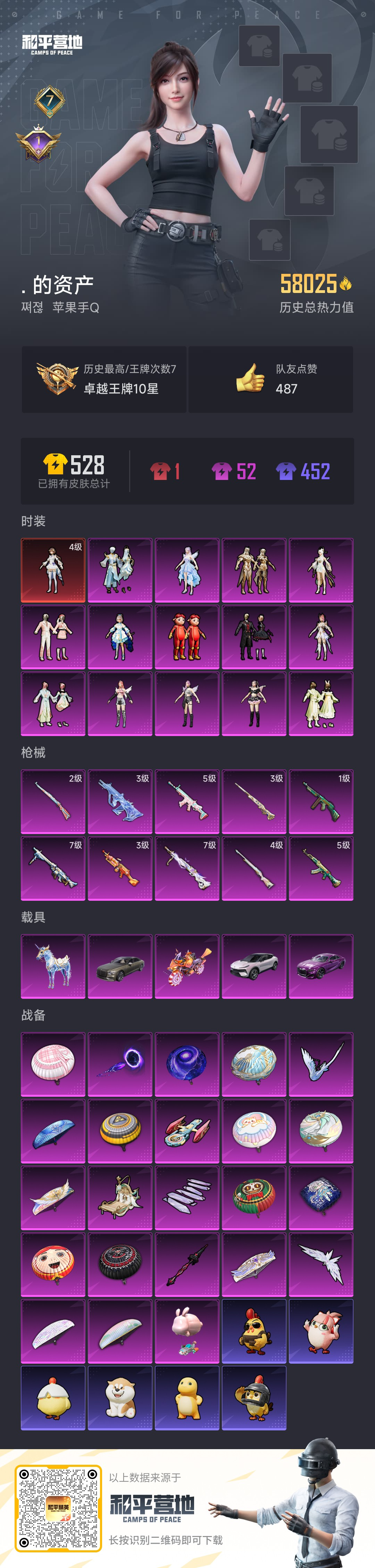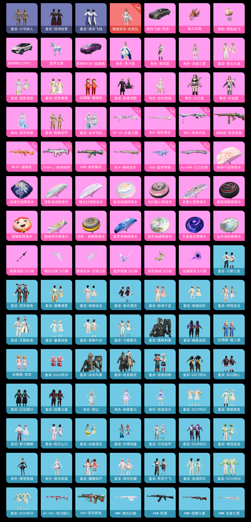 【和平精英】【txhp4583】14粉装,10特效呛,5载具,历史最高段位:卓越王牌10星 王牌印记7次 热力值:58025,88套装,134呛械,208装备,80战备;套装:镜域双华-欧若拉,角色-洛天依,套装-第五大道,套装-闲梦青缨,角色-白兰星,角色-茉莉星,角色-水仙星,套装-莲影清波,套装-夜幕颂歌,角色-圣堂之誓,玩偶服-猪猪侠,角色-绝色倾城,套装-辉耀战甲,角色-星梦奇缘,套装-金丰海韵,套装-白色伏地魔,套装-黑色伏地魔,套装-竞技名士,套装-长空猛禽,套装-甜蜜告白,套装-鹰眼刺客,套装-冰冻风暴,套装-缤纷果语,套装-龙魂突击队,套装-破蛋小黄鸡,套装-霓虹街区,套装-怪笑疯兔,套装-诡面顽熊,套装-战术大师,套装-热情海星,套装-纯真浪花,套装-天籁歌者,套装-电音精灵,套装-香榭午后,套装-恋恋初桃,套装-龟仙人,套装-惊鸿侠骨,套装-锦衣飞扬,套装-晨曦薄雾,套装-六号树人,套装-冰河战士,套装-ss26特训,套装-快闪甜心,套装-春光漫游,套装-粉锦千层,套装-空岛之星,套装-无暇誓言,套装-明鸳圣池,套装-童真绒兔,套装-萌趣绒叽,套装-湖泊玉兰,套装-贝斯之夜,玩偶服-菲菲,玩偶服-超人强,套装-焰鹰斗篷,套装-幽夜迷踪,套装-幻羽潜行,套装-月华战甲,套装-ss27特训,套装-老实芭蕉,套装-ss28特训,玩偶服-卖崽青蛙,角色-极地流光,角色-粉雾星云,角色-银尘,套装-璀璨流光,套装-街头风暴,套装-海盐绵绵冰,套装-蝶变,套装-粉日山川,套装-ss29特训,套装-雏菊兔兔,套装-萝兰蝴蝶,角色-摩登魅猫,角色-都市丽猫,套装-星途旅人,套装-ss30特训,套装-青团波波,套装-棉花软糖,套装-糖糖葫芦,套装-ss31特训,套装-鱼渊荷华,套装-燕燕于飞,套装-ss33特训,套装-巳巳如意,套装-ss32特训,套装-ss34特训,套装-ss35特训;呛皮:g36c-六号树人,g36c-镜域双华,mk47-洛神天依,groza-影袭,groza-绯红回忆,groza-海盐豹豹,groza-晶梦幻蝶,m762-雏菊兔兔,蜜獾-天降萌叽,蜜獾-精灵梦叶罗丽,蜜獾-糖糖葫芦,q-洛神天依,q-纯真浪花,5级scar-l-锦绣绵绵,scar-l-粉锦千层,scar-l-海盐豹豹,3级aug-星梦奇缘,aug-怪笑疯兔,aug-闲梦青缨,aug-辉耀战甲,famas-璀璨流光,famas-镜域双华,famas-乌木金纹,m16a4-莲影清波,m16a4-冰河战士,m16a4-千金淑猫,5级akm-绿萝繁花,akm-影袭,akm-霓虹街区,m416-糯团青竹,m416-璀璨流光,ac-val-快闪甜心,2级kar98k-巳巳如意,kar98k-彩虹符号,kar98k-洛神天依,kar98k-六号树人,kar98k-顶峰精英,4级m24-莲影清波,3级m24-镜域双华,m24-影袭,awm-圣堂之誓,awm-焰鹰斗篷,awm-纯真浪花,amr-镜光幻境,amr-乌木金纹,莫辛纳甘-蜜语绒猫,m200-惊鸿侠骨,m200-乌木金纹,win94-怪笑疯兔,mk20-h-莲影清波,mk20-h-快闪甜心,mk20-h-星梦奇缘,mk20-h-糖糖葫芦,mk20-h-乌木金纹,vss-香桃花海,slr-璀璨流光,slr-金丰海韵,m417-惊鸿侠骨,m417-猪猪侠,sks-夜幕颂歌,mini14-香桃花海,mini14-辉耀战甲,mini14-雏菊兔兔,mk14-冰河战士,mk14-猪猪侠,1级汤姆逊-怪笑疯兔,汤姆逊-星梦奇缘,汤姆逊-纯真浪花,ump45-猪猪侠,ump45-糖糖葫芦,p90-倾城蜜语,p90-快闪甜心,p90-玩趣呆呆,p90-巳巳如意,p90-乌木金纹,野牛-粉锦千层,野牛-雏菊兔兔,野牛-燕燕于飞,uzi-天降萌叽,uzi-冰河战士,uzi-绝色倾城,uzi-啾咪啾咪,mp5k-怪笑疯兔,mp5k-乌木金纹,aks-74u-乌木金纹,vect-焰鹰斗篷,vect-燕燕于飞,dbs-圣堂之誓,dbs-焰鹰斗篷,dbs-乌木金纹,s686-蜜语绒猫,s686-千金淑猫,s686-巳巳如意,s1897-精灵梦叶罗丽,spas-12-燕燕于飞,spas-12-乌木金纹,aa12-g-纯真浪花,s12k-夜幕颂歌,3级m249-猪猪侠,m249-彩虹符号,m249-莲影清波,7级mg3-洛神天依,mg3-第五大道,mg3-惊鸿侠骨,mg3-镜域双华,7级dp-28-圣堂之誓,dp-28-焰鹰斗篷,pkm-蜜语绒猫,pkm-明月桂语,蝎式手呛-金丰海韵,蝎式手呛-千金淑猫,蝎式手呛-燕燕于飞,r1895-六号树人,r1895-雏菊兔兔,p1911-粉锦千层,短管霰弹-宇宙意志,沙墨之鹦-快闪甜心,沙墨之鹦-绝色倾城,p18c-糖糖葫芦,平底锅-惊鸿侠骨,平底锅-酷泡奶龙,平底锅-快闪甜心,平底锅-空岛之星,平底锅-焰鹰斗篷,平底锅-精灵梦叶罗丽,平底锅-纯真浪花,平底锅-雏菊兔兔,平底锅-糖糖葫芦,撬棍-沙丘之主权杖,破片手留单-呆爆全场,破片手留单-巳巳如意,爆炸猎弓-惊鸿侠骨,十子怒-燕燕于飞,十子怒-异域银装;载具:星梦玉骢,路特斯eletre花绽灰,鬼马风驰,宾利飞驰布罗德盖棕双色,宾利batur极速紫;降落伞:镜光幻境飞行翼,夜幕颂歌飞行器,星梦奇缘飞行器,镜域双华-灵镜之阶,鸿潮鸣舰飞行器,绝色倾城飞行器,深渊漩涡飞行器,空岛之星尾迹,顶峰精英尾迹;滑翔尾迹:僚机-萌兔起飞; 详情看图7印记-5.8w热力-1红-14粉-10特-5车 4级欧若拉/第五大道/洛天依 星梦/镜域双华 水晶马/紫宾利