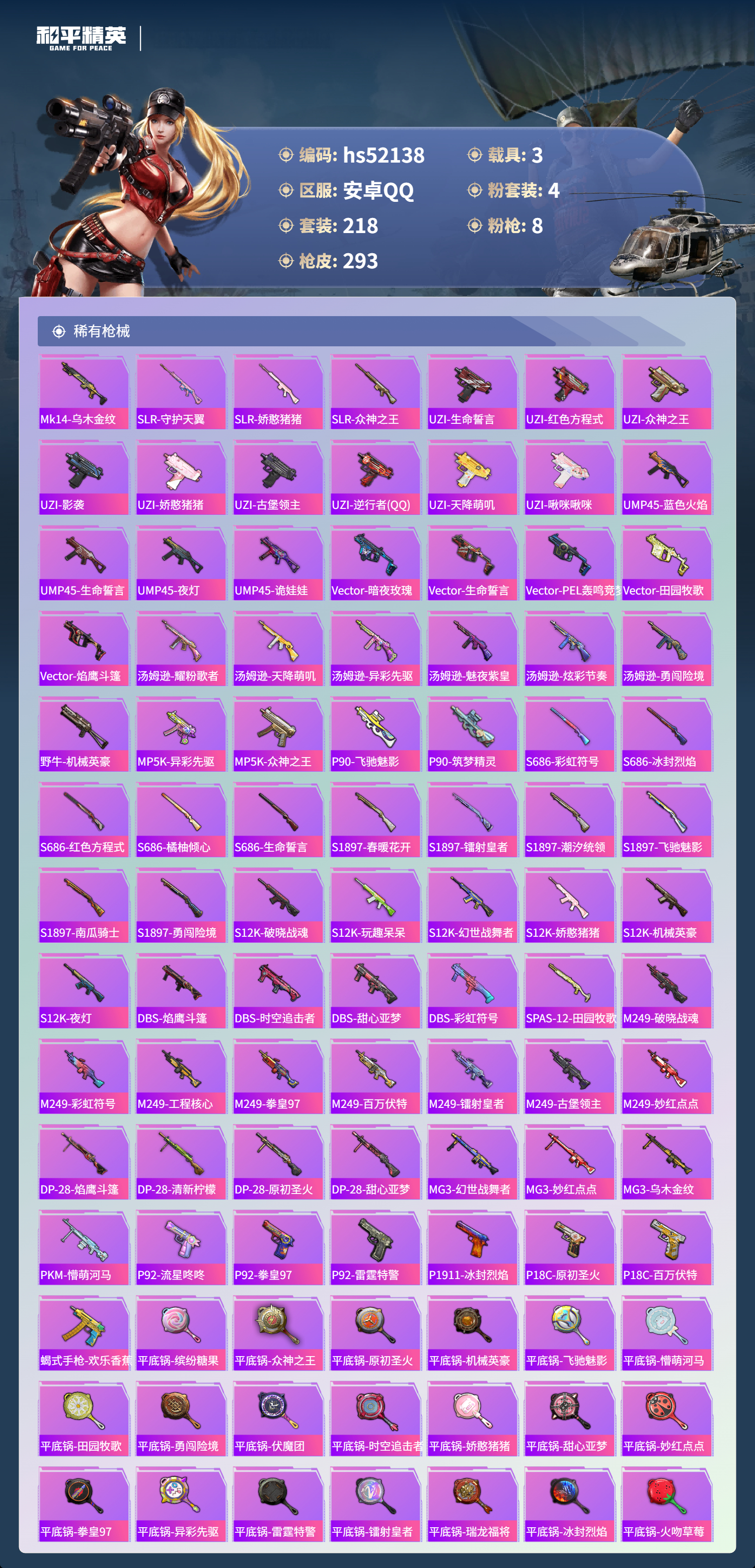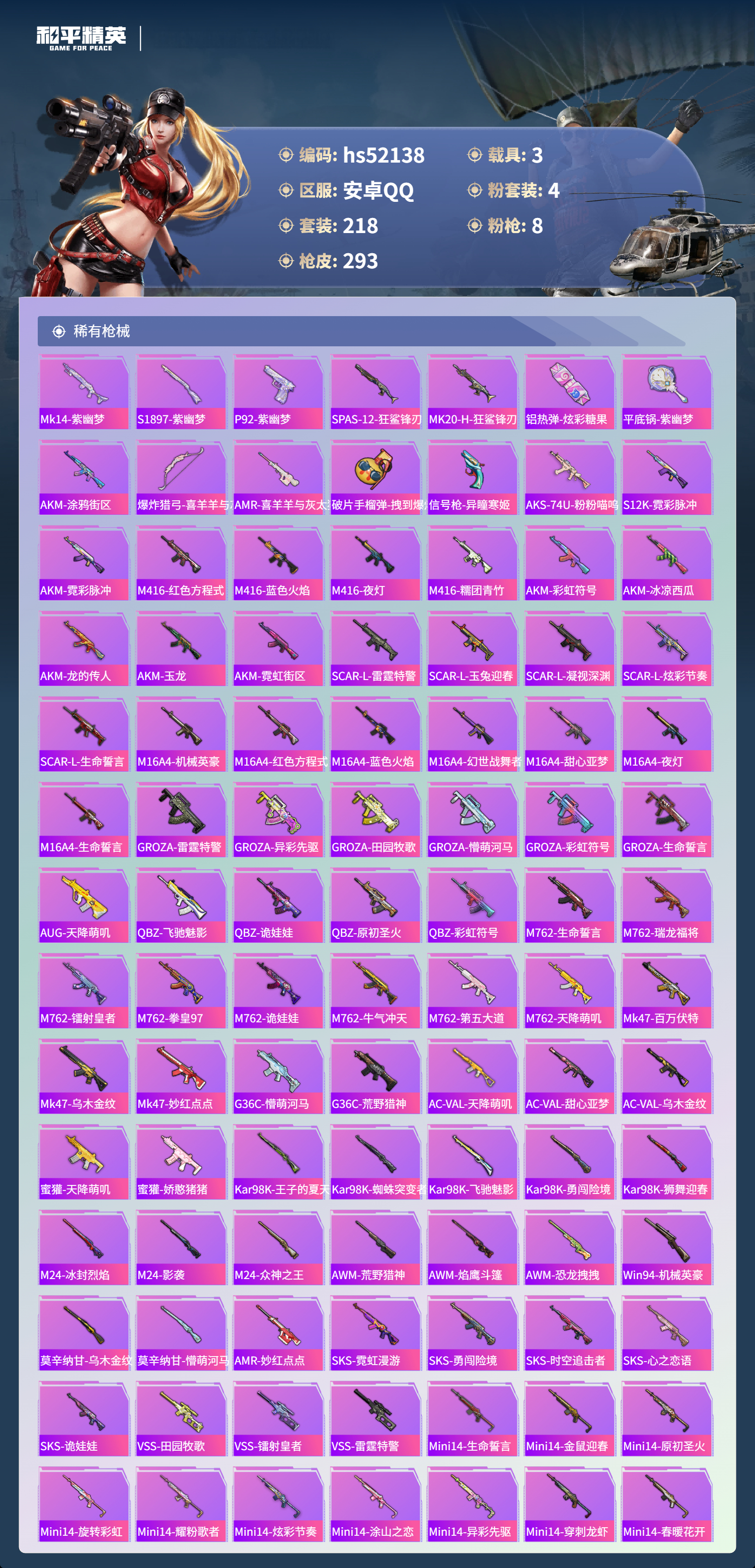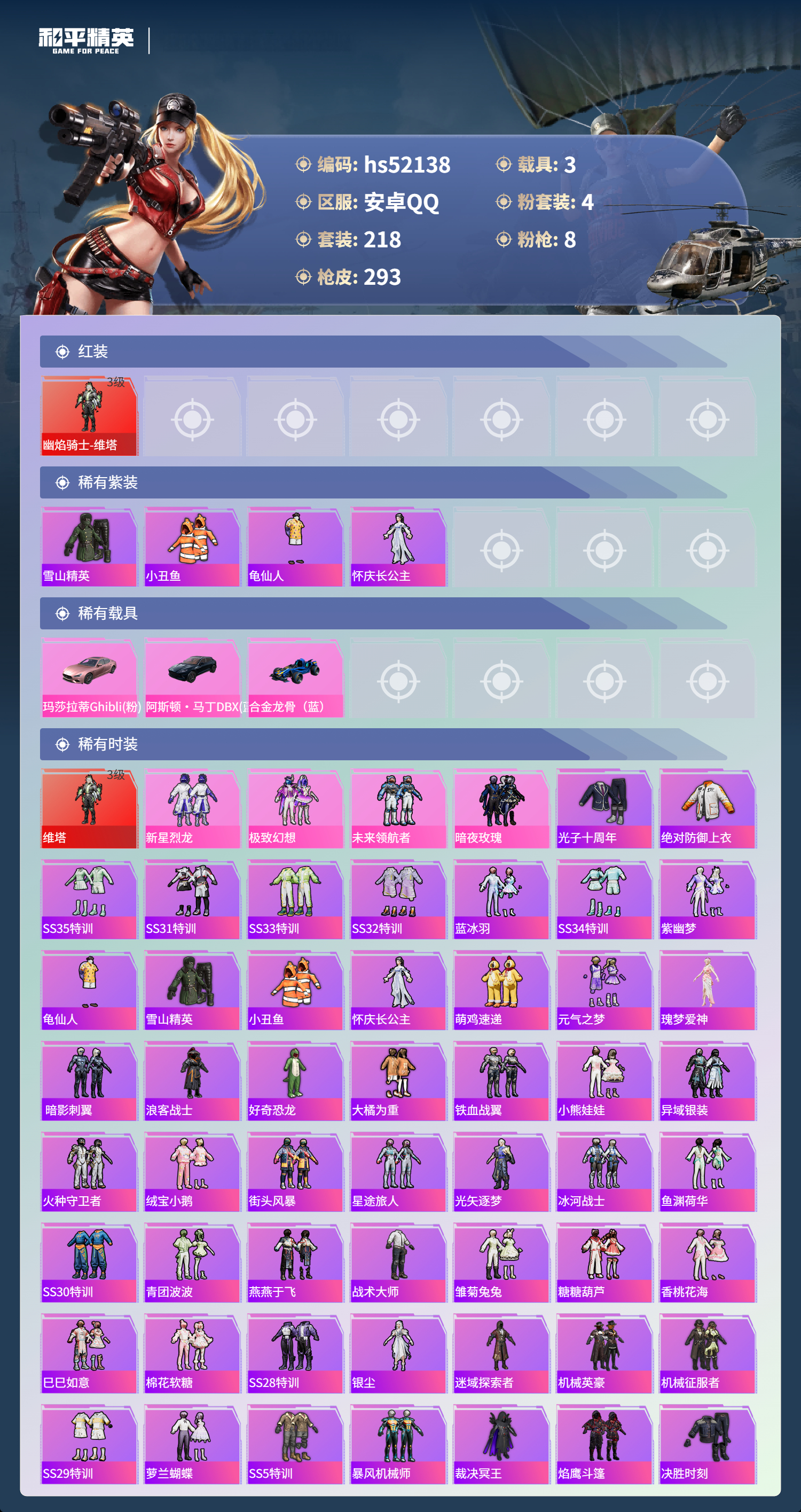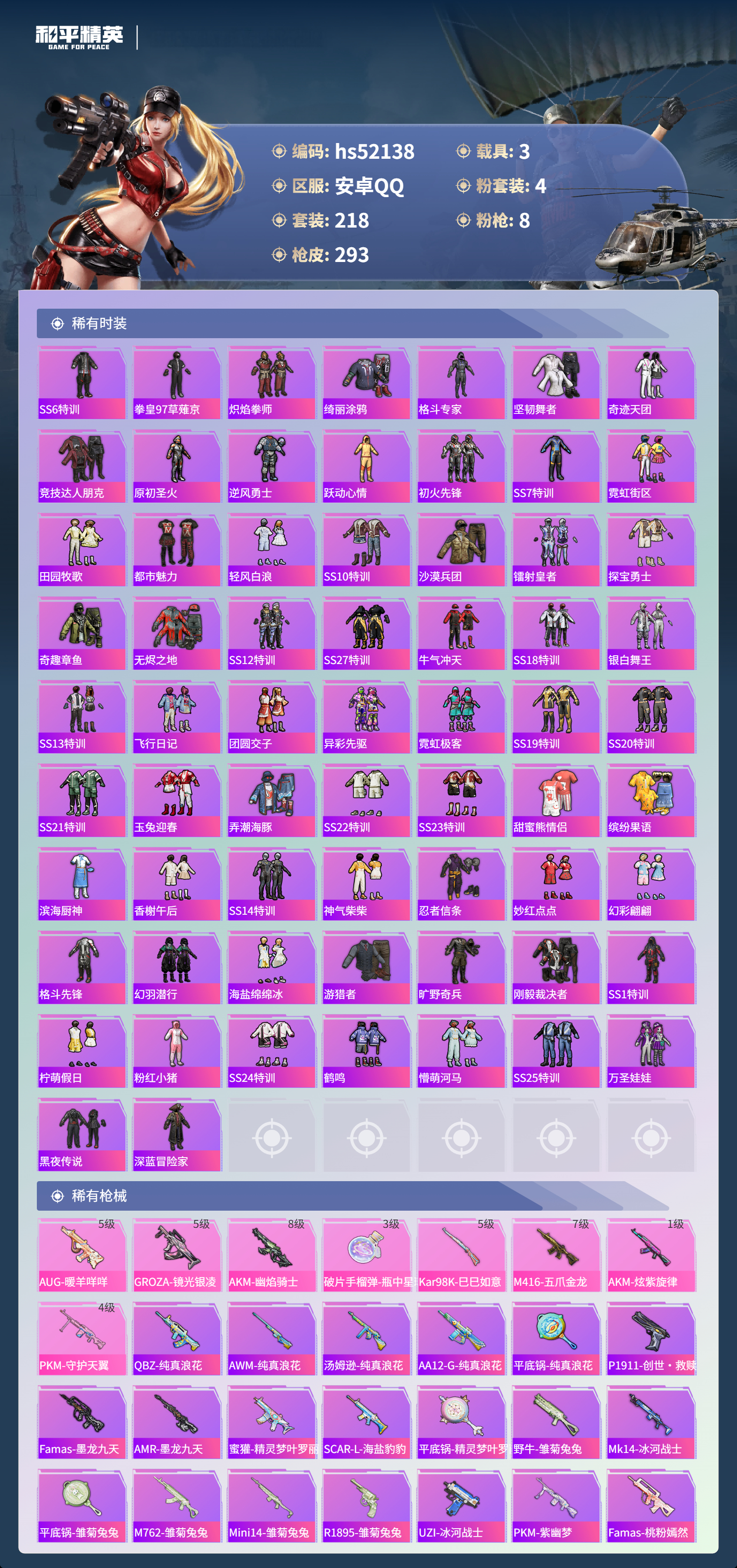 hs52138 安卓手q-14王牌印记-有战神框-1红装-4粉装-8特效呛-3载具-95883热力值-218套装-293呛皮-4卓越印记-2传奇印记【1红装】幽焰骑士-维塔/3级【4粉装】套装-极致幻想套装-新星烈龙套装-暗夜玫瑰套装-未来领航者【8特效呛】akm-炫紫旋律/1级aug-暖羊咩咩/5级pkm-守护天翼/4级kar98k-巳巳如意/5级akm-幽焰骑士/8级m4