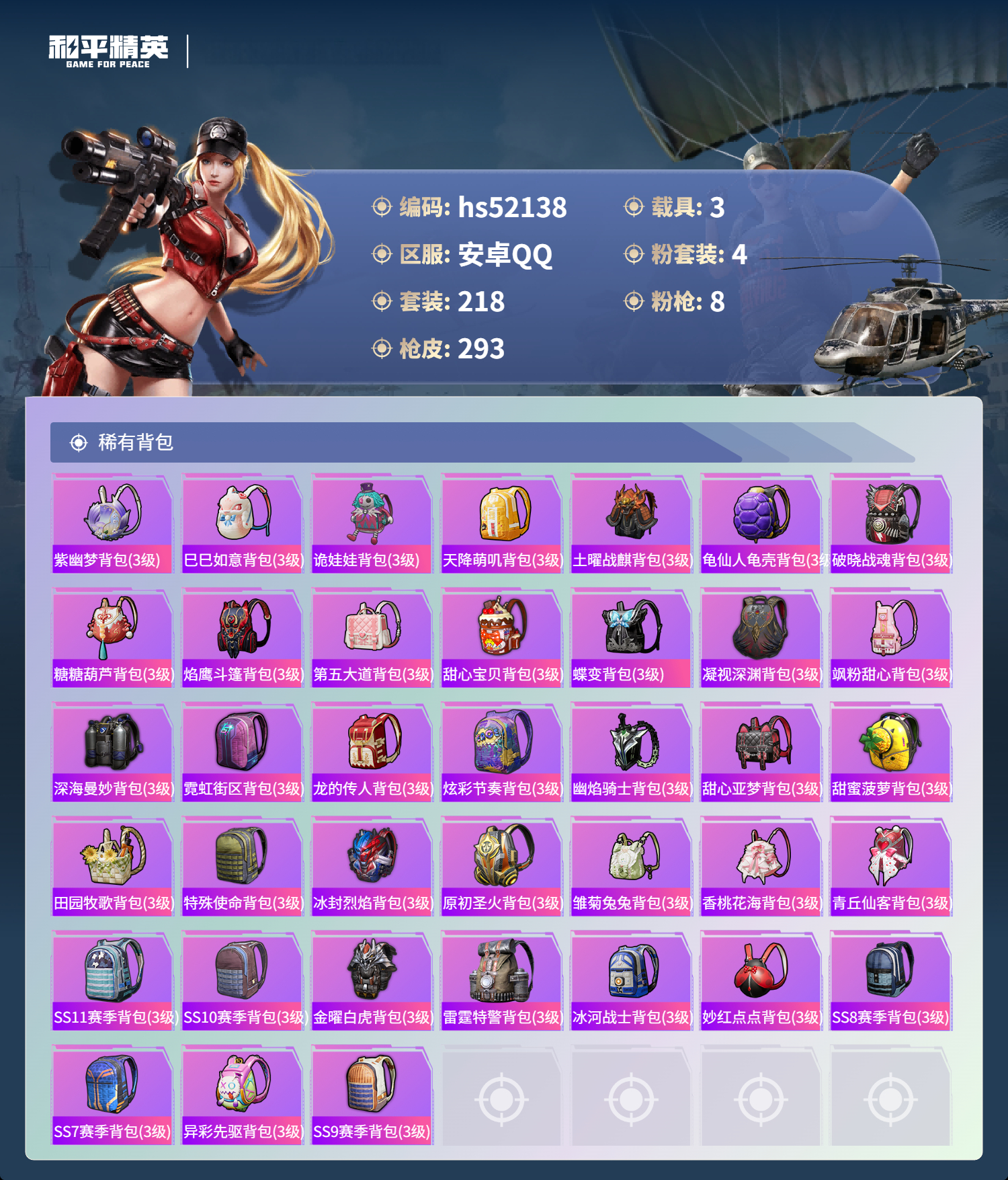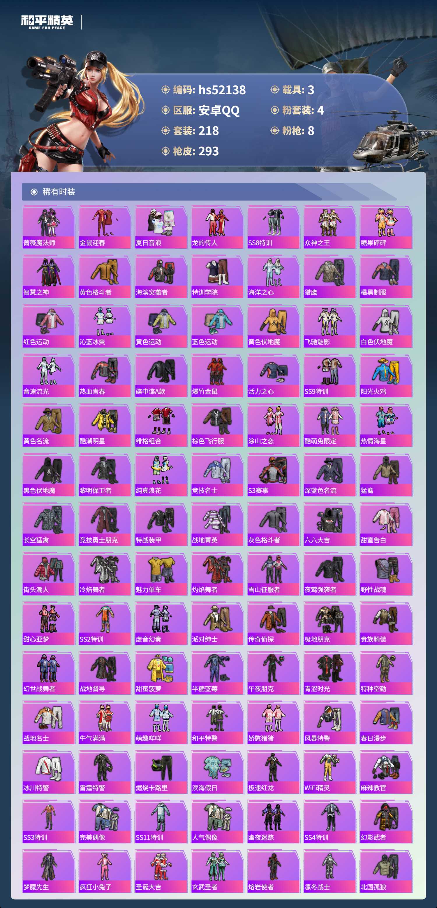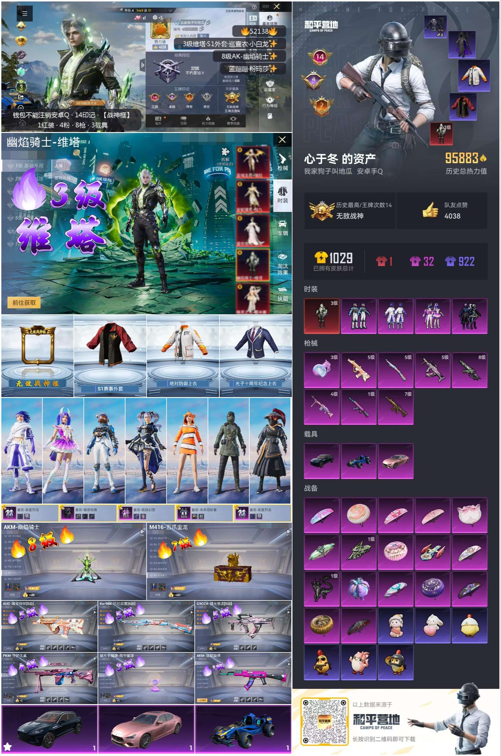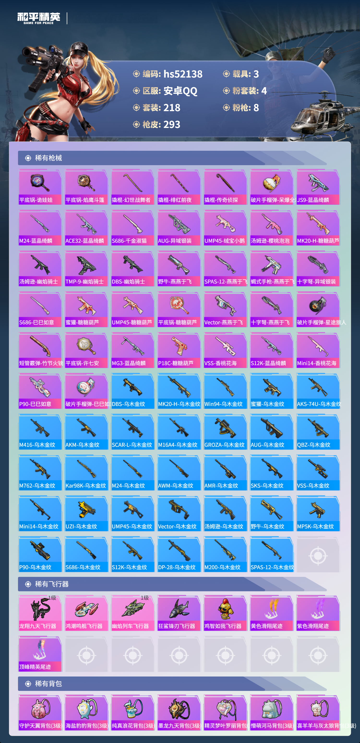 hs52138 安卓手q-14王牌印记-有战神框-1红装-4粉装-8特效呛-3载具-95883热力值-218套装-293呛皮-4卓越印记-2传奇印记【1红装】幽焰骑士-维塔/3级【4粉装】套装-极致幻想套装-新星烈龙套装-暗夜玫瑰套装-未来领航者【8特效呛】akm-炫紫旋律/1级aug-暖羊咩咩/5级pkm-守护天翼/4级kar98k-巳巳如意/5级akm-幽焰骑士/8级m4