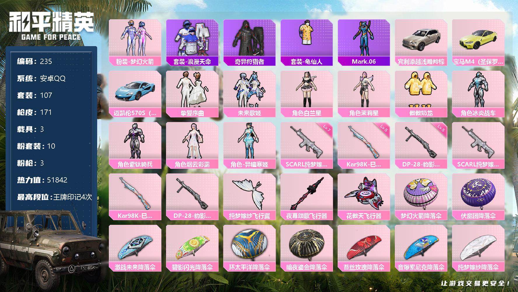 [14388874]【编号92811】【店长推荐捡漏!!!可秒换绑顶级极品号喜欢的宝宝速抢】安卓 手q-10粉装-3特效呛-3载具-3粉色飞行器-51842热力值-4王牌印记-107套装-171呛皮 【热门品类】:粉装-梦幻火箭,套装-浪漫天命,套装-奇异狩猎者,套装-龟仙人,角色-mark.06 【粉色载具】:宾利添越(浅瞪羚棕),宝马m4(圣保罗黄),迈凯伦570s(天际蓝) 【粉色套装】:粉装-梦幻火箭,粉装-挚爱序曲,粉装-未来歌姬,角色-白兰星,角色-茉莉星,粉装-傲傲奶龙,角色-冰炎战车,角色-紫钛骑兵,角色-烟云彩露,角色-异瞳寒姬 【粉色呛皮等级】:scar-l-纯梦嫁纱七级,kar98k-巳巳如意五级,dp-28-豹影疾电五级 【粉色呛皮】:scar-l-纯梦嫁纱,kar98k-巳巳如意,dp-28-豹影疾电 【粉色飞行器】:纯梦嫁纱飞行翼,夜幕颂歌飞行器,花傲天飞行器 【粉色降落伞】:梦幻火箭降落伞,伏魔团降落伞,激战未来降落伞,碧影闪光降落伞,环太平洋降落伞,暗夜鎏金降落伞,苔丝玫瑰降落伞,音爆索尼克降落伞,纯梦嫁纱降落伞,变形金刚降落伞,超新星降落伞,祥瑞锦鲤降落伞,金丰海韵降落伞,星穹咏叹调降落伞 【稀有套装】:套装-龟仙人,套装-巳巳如意,套装-雏菊兔兔,套装-萝兰蝴蝶,套装-小熊娃娃,套装-糖糖葫芦,套装-青团波波,套装-棉花软糖,套装-燕燕于飞,套装-鱼渊荷华,套装-紫幽梦,套装-蓝冰羽,套装-星影赞美诗 【稀有呛皮】:akm-奇异狩猎者,akm-彩虹符号,akm-破晓战魂,akm-龙的传人,m16a4-幻世战舞者,scar-l-玉兔迎春,m416-糯团青竹,m416-红色方程式,m416-绿野极光,groza-懵萌河马,groza-田园牧歌,groza-酷泡奶龙,aug-耀粉歌者,q-未来歌姬,q-飞驰魅影,m762-天降萌叽,m762-能量风暴,mk47-妙红点点,mk47-洛神天依,mk47-炫光之旅,g36c-懵萌河马,g36c-花间之火,g36c-桃粉嫣然,ac-val-彩虹甜喵,ac-val-快闪甜心,蜜獾-天降萌叽,蜜獾-娇憨猪猪,famas-墨龙九天,uzi-啾咪啾咪,uzi-娇憨猪猪,ump45-繁龙极客,ump45-生命誓言,ump45-蓝色火焰,vect-焰鹰斗篷,vect-生命誓言,vect-田园
