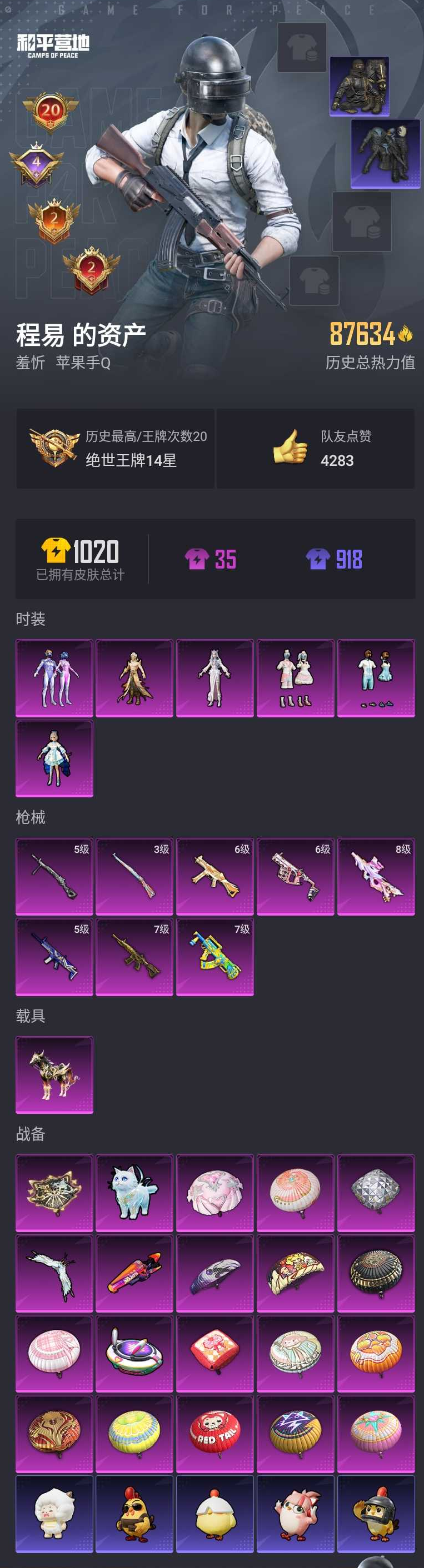 【和平精英】【lyhp17571】高印记 6粉装8特效呛1载具 梦幻火箭 洛天依 罗征 都市猎人 8级p90仙履奇缘 满级m4五爪金龙 满级狗杂香水柠檬 5级青春物语 黑耀夜骑 6粉装,8特效呛,1载具,历史最高段位:绝世王牌14星 王牌印记20次 热力值:87694,193套装,295呛械,321装备,173战备;套装:套装-梦幻火箭,角色-洛天依,套装-仲夏莫吉托,套装-蜜语绒猫,角色-罗征,角色-冷漠罗丽,套装-特训学院,套装-黄色运动,套装-蓝色运动,套装-白色伏地魔,套装-黑色伏地魔,套装-骑行爱好者,套装-竞技名士,套装-深蓝色名流,套装-黄色名流,套装-猛禽,套装-长空猛禽,套装-漫步者,套装-竞技勇士朋克,套装-雨林探路者,套装-旭日情侣,套装-破晓情侣,套装-冷焰舞者,套装-都市猎人,套装-水银刺客,套装-特战装甲,套装-战地菁英,套装-灰色格斗者,套装-春日漫步,套装-燃烧卡路里,套装-滨海假日,套装-鹰眼刺客,套装-冰冻风暴,套装-冷酷挑战者,套装-幻影武者,套装-海滨突袭者,套装-摇滚战魂,套装-千禧之恋,套装-怒火燎原,套装-决胜时刻,套装-魅力单车,套装-绮丽涂鸦,套装-坚韧舞者,套装-竞技达人朋克,套装-夜莺强袭者,套装-野性战心,套装-金羽特工,套装-荣耀,套装-沙漠兵团,套装-ss2特训,套装-雪山精英,套装-极地朋克,套装-幻世战舞者,套装-甜蜜菠萝,套装-半糖蓝莓,套装-金耀舞者,套装-弄潮海豚,套装-迅捷狂鲨,套装-呆萌铁蟹,套装-恒星战甲,套装-甜蜜熊情侣,套装-青涩时光,套装-缤纷果语,套装-滨海厨神,套装-特种空勤,套装-和平特警,套装-风暴特警,套装-冰川特警,套装-幻影公爵,套装-海上生明月,套装-麻辣教官,套装-ss3特训,套装-蜘蛛突变者,套装-梦魇先生,套装-万圣娃娃,套装-黑夜传说,套装-粉红小猪,套装-疯狂小兔子,套装-机械英豪,套装-机械征服者,套装-军械专家,套装-北国孤狼,套装-ss6特训,套装-鹤鸣,套装-ss10特训,套装-萌黄之夏,套装-超能拳王,套装-夏日音浪,套装-安第斯皇冠,套装-探宝勇士,套装-牛气满满,套装-ss11特训,套装-青春冒险家,套装-潮流游乐家,套装-原初圣火,套装-逆风勇士,套装-萌趣颜团子,套装-特种颜团子,套装-ss12特训,套装-牛气冲天,套装-ss18特训,套装-耀粉歌者,套装-迅捷之星,套装-治愈之星,套装-科技之星,套装-ss13特训,套装-热情海星,套装-纯真浪花,套装-双棍侠客,套装-ss14特训,套装-吉莉礼服,套装-ss15特训,套装-ss16特训,套装-暴风机械师,套装-时空追击者,套装-暗夜傀儡,套装-ss17特训,套装-瑞龙福将,套装-团圆交子,套装-炫光向阳,套装-福星高照,套装-虎虎生威吉莉,套装-空投萌叽,套装-ss19特训,套装-ss20特训,套装-甜心亚梦,套装-虚音幻奏,套装-ss21特训,套装-萌趣咩咩,套装-娇憨猪猪,套装-荷畔雨呱,套装-灵动马戏师,套装-酸甜橘柚,套装-玉兔迎春,套装-ss22特训,套装-和煦暖阳,套装-田园牧歌,套装-轻风白浪,套装-紫芒星,套装-光之冒险,套装-绯格组合,套装-ss23特训,套装-莱茵河畔,套装-龙舌兰冰茶,套装-甜梦熊熊,套装-神气柴柴,套装-懵萌河马,套装-灵蜜圈圈,套装-妙红点点,套装-幻彩翩翩,套装-王牌教练,套装-柠萌假日,套装-青玉碎影,套装-ss24特训,套装-华灯初上,套装-龟仙人,套装-涂山之恋,套装-ss25特训,套装-惊鸿侠骨,套装-锦衣飞扬,套装-龙的传人,套装-冰河战士,套装-ss26特训,套装-快闪甜心,套装-春光漫游,套装-漫游都市,套装-焰鹰斗篷,套装-幽夜迷踪,套装-幻羽潜行,套装-ss27特训,套装-恋语绒绒,套装-ss28特训,角色-蝶吟花词,角色-冰公主,套装-白辉玉蕊,套装-海盐绵绵冰,套装-ss29特训,角色-绯色魅影,套装-ss31特训,套装-ss33特训,套装-云朵鹅,套装-ss32特训,套装-彩虹兔,套装-雪绒豹,角色-时希公主,角色-灵公主,玩偶服-美羊羊,套装-元气之梦,套装-ss34特训,套装-朱霞炽焰,套装-凌霄紫焰,套装-薄荷星砂,套装-ss35特训;呛皮:7级groza-香水柠檬,groza-影袭,groza-生命誓言,groza-雷霆特警,groza-治愈之星,groza-彩虹符号,groza-田园牧歌,groza-懵萌河马,aug-青春冒险家,aug-幻梦音符,aug-纯梦嫁纱,aug-天降萌叽,aug-异域银装,aug-乌木金纹,mk47-百万伏特,mk47-青春冒险家,mk47-乌木金纹,mk47-妙红点点,akm-灼热熔岩,akm-生命誓言,akm-影袭,akm-玉龙,akm-缤纷海域,akm-百万伏特,akm-霓虹街区,akm-夜灯,akm-彩虹符号,akm-萌趣颜团子,akm-虎虎生威,akm-环太平洋,akm-龙的传人,akm-江南烟雨,akm-灵猫魔法师,akm-乌木金纹,5级scar-l-青春物语,scar-l-生命誓言,scar-l-黄金龙骨,scar-l-雷霆特警,scar-l-炫彩节奏,scar-l-暗夜玫瑰,scar-l-玉兔迎春,scar-l-海盐豹豹,scar-l-冷漠罗丽,scar-l-乌木金纹,7级m416-五爪金龙,m416-蓝色火焰,m416-绯红前夜,m416-诡夜天鹅,m416-糯团青竹,m416-乌木金纹,q-原初圣火,q-彩虹符号,q-萌萌彩虹球,q-纯真浪花,q-乌木金纹,m16a4-蓝色火焰,m16a4-生命誓言,m16a4-红色方程式,m16a4-机械英豪,m16a4-甜心亚梦,m16a4-幻世战舞者,ac-val-甜心亚梦,ac-val-乌木金纹,ac-val-灵感创作师,ac-val-彩虹甜喵,ac-val-天降萌叽,ac-val-快闪甜心,ac-val-梦海之灵,g36c-时空追击者,g36c-暗夜玫瑰,g36c-懵萌河马,g36c-乌木金纹,蜜獾-娇憨猪猪,蜜獾-天降萌叽,蜜獾-乌木金纹,m762-绯红前夜,m762-快乐主宰,m762-牛气冲天,m762-瑞龙福将,m762-彩虹甜喵,m762-天降萌叽,m762-云朵鹅,m762-乌木金纹,famas-乌木金纹,arx-凌霄紫焰,awm-不夜海上花,awm-炙焰牛王,awm-垂柳戏鸭,awm-鎏金朋克,awm-焰鹰斗篷,awm-纯真浪花,awm-乌木金纹,m200-惊鸿侠骨,m200-乌木金纹,3级kar98k-巳巳如意,kar98k-王子的夏天,kar98k-影袭,kar98k-梦幻