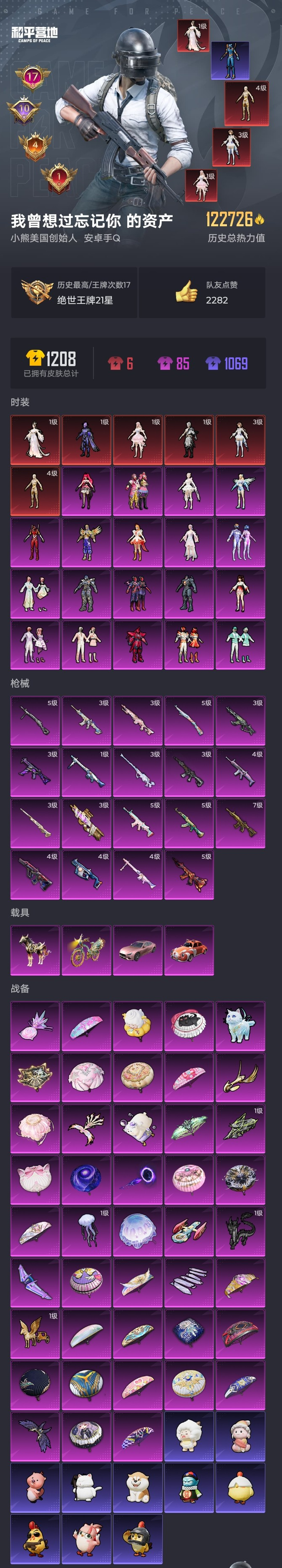 【和平精英】【lyhp17515】【17印记】6红19粉19特4载 4级图卡盟 3级欧若拉 猪妹 红螳螂 梦幻火箭 多呛型3级猫灵魔法师墨龙九天 19粉装,19特效呛,4载具,历史最高段位:绝世王牌21星 王牌印记17次 热力值:122726,230套装,304呛械,450装备,190战备;套装:沙丘之主-图卡盟,墨龙九天-敖渊,镜域双华-欧若拉,梦海之灵-妮芮妲,宇宙意志-塞卢姆,盛世惊鸿-云鸾,套装-梦幻火箭,套装-缤纷油彩,套装-星之彼岸,套装-炙焰赤龙,角色-2号机款机体服,角色-复仇流浪者,套装-薄荷物语,套装-霞光圣骑,角色-小可学妹,套装-第五大道,套装-瑰丽时代,角色-幻影,套装-莲影清波,角色-烟云彩露,角色-超弦星,角色-光极星,角色-小蓝,角色-千金淑猫,角色-绯穹魔姬,套装-黄色伏地魔,套装-白色伏地魔,套装-黑色伏地魔,套装-冰川格斗者,套装-竞技名士,套装-深蓝色名流,套装-酒红色名流,套装-湖蓝色名流,套装-黄色名流,套装-猛禽,套装-长空猛禽,套装-海岛探路者,套装-雨林探路者,套装-旭日情侣,套装-冷焰舞者,套装-灼焰舞者,套装-特战装甲,套装-战地督导,套装-青春校园,套装-春日漫步,套装-龙腾端午,套装-人气偶像,套装-街头潮人,套装-蓝彩潮人,套装-千禧之恋,套装-神秘领域,套装-魅力单车,套装-野性战心,套装-都市魅力,套装-荣耀,套装-潮流炫酷,套装-沙漠兵团,套装-雪山精英,套装-烈火街头,套装-幻世战舞者,套装-冰凉西瓜,套装-青涩时光,套装-缤纷果语,套装-alan walker,套装-龙魂突击队,套装-胖达圆圆,套装-格斗先锋,套装-麻辣教官,套装-万圣娃娃,套装-破蛋小黄鸡,套装-凛冬战士,套装-北国孤狼,套装-鹤鸣,套装-霓虹街区,套装-纯白誓言,套装-白熊同盟,套装-萌黄之夏,套装-夏日音浪,套装-风华少年志,套装-顽皮玉兔,套装-探宝勇士,套装-本愿之火,套装-白糯汤圆,套装-诡面顽熊,套装-青春冒险家,套装-潮流游乐家,套装-萌趣颜团子,套装-特种颜团子,套装-战术大师,套装-牛气冲天,套装-ss18特训,套装-耀粉歌者,套装-治愈之星,套装-科技之星,套装-飞行日记,套装-曼妙人鱼,套装-热情海星,套装-纯真浪花,套装-ss14特训,套装-天籁歌者,套装-电音精灵,套装-吉莉礼服,角色-明日香款战斗服,角色-真嗣款战斗服,套装-快乐星愿,套装-星梦畅游,套装-ss15特训,套装-ss16特训,角色-英勇保护者,套装-ss17特训,套装-福星高照,角色-军刀雅典娜,套装-ss19特训,套装-沁蓝冰爽,套装-飞驰魅影,套装-音速流光,套装-炫蓝之夏,套装-ss20特训,套装-浑天鲲鹏,套装-猎梦纪元,套装-甜心亚梦,套装-虚音幻奏,套装-ss21特训,套装-玉兔迎春,套装-ss22特训,套装-光之冒险,套装-绯格组合,套装-ss23特训,角色-孙悟空,角色-贝吉塔,套装-香榭午后,套装-甜梦熊熊,套装-神气柴柴,套装-懵萌河马,套装-灵蜜圈圈,套装-妙红点点,套装-幻彩翩翩,套装-王牌教练,套装-柠萌假日,套装-青玉碎影,套装-ss24特训,套装-绚紫流光,套装-荧惑魅影,套装-银松藏云,角色-短笛,角色-究极悟饭,套装-龟仙人,套装-涂山之恋,套装-ss25特训,套装-惊鸿侠骨,套装-锦衣飞扬,套装-香桃花海,套装-深海梦境,套装-龙的传人,套装-冰河战士,套装-ss26特训,套装-快闪甜心,套装-春光漫游,套装-漫游都市,套装-空岛之星,套装-童真绒兔,套装-云魄琉璃,套装-贝斯之夜,角色-忠真马岱,角色-忠猛周仓,角色-忠义严颜,套装-焰鹰斗篷,套装-幽夜迷踪,套装-幻羽潜行,套装-ss27特训,套装-幽幻花璃,套装-恋语绒绒,套装-老实芭蕉,套装-ss28特训,角色-蝶吟花词,角色-湖雨初晴,套装-alan walker电音教主,玩偶服-卖崽青蛙,角色-冰公主,角色-mark.06,套装-街头风暴,套装-海盐绵绵冰,套装-蝶变,套装-创世·幻影,套装-小熊娃娃,套装-ss29特训,套装-雏菊兔兔,套装-萝兰蝴蝶,角色-绯色魅影,套装-异域银装,套装-星途旅人,角色-临安公主,套装-ss30特训,套装-青团波波,套装-棉花软糖,角色-夜瞳黯灵,角色-绛羽幽主,套装-糖糖葫芦,玩偶服-酷勇熊大,玩偶服-憨乐熊二,套装-ss31特训,套装-鱼渊荷华,套装-石蕴玉辉,套装-燕燕于飞,套装-智谋强哥,角色-海琴烟,套装-ss33特训,套装-巳巳如意,套装-ss32特训,套装-熊抱抱,套装-风舞幻音,套装-顶瓜瓜,套装-大橘大利,套装-炫彩糖果,套装-绯夜呢喃,套装-暮色狼梦,套装-元气之梦,套装-ss34特训,套装-擎苍青焰,套装-朱霞炽焰,套装-游乐,套装-凌霄紫焰,套装-薄荷星砂,套装-ss35特训,套装-午间小调,套装-秘语星愿,套装-风迹短诗,套装-粉黛兰香,套装-ss36特训,套装-萌鸡速递;呛皮:4级scar-l-梦幻火箭,5级scar-l-锦绣绵绵,scar-l-红色方程式,scar-l-王牌四分卫,scar-l-炫彩节奏,scar-l-彩虹符号,scar-l-玉兔迎春,scar-l-星途旅人,scar-l-海盐豹豹,5级akm-绿萝繁花,3级akm-幽焰骑士,akm-灼热熔岩,akm-影袭,akm-破晓战魂,akm-霓虹街区,akm-夜灯,akm-涂鸦街区,akm-星之彼岸,akm-彩虹符号,akm-萌趣颜团子,akm-环太平洋,akm-筑梦精灵,akm-龙的传人,akm-灵猫魔法师,akm-霓彩脉冲,m16a4-蓝色火焰,m16a4-夜灯,m16a4-甜心亚梦,m16a4-幻世战舞者,m16a4-冰河战士,m16a4-千金淑猫,mk47-青春冒险家,mk47-洛神天依,mk47-乌木金纹,mk47-妙红点点,mk47-炫光之旅,mk47-风迹短诗,蜜獾-天降萌叽,蜜獾-精灵梦叶罗丽,蜜獾-糖糖葫芦,蜜獾-绯穹魔姬,蜜獾-风迹短诗,蜜獾-乌木金纹,groza-生命誓言,groza-治愈之星,groza-彩虹符号,groza-异彩先驱,groza-青春物语,groza-懵萌河马,groza-绯红回忆,groza-海盐豹豹,7级m416-五爪金龙,5级m416-风花雪月,3级m416-墨龙九天,3级m416-灵猫魔法师,m416-绯红前夜,m416-红色