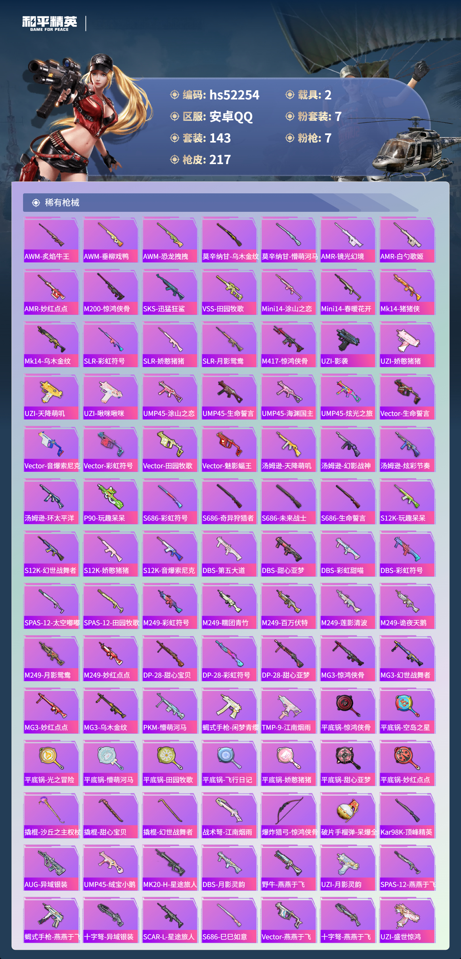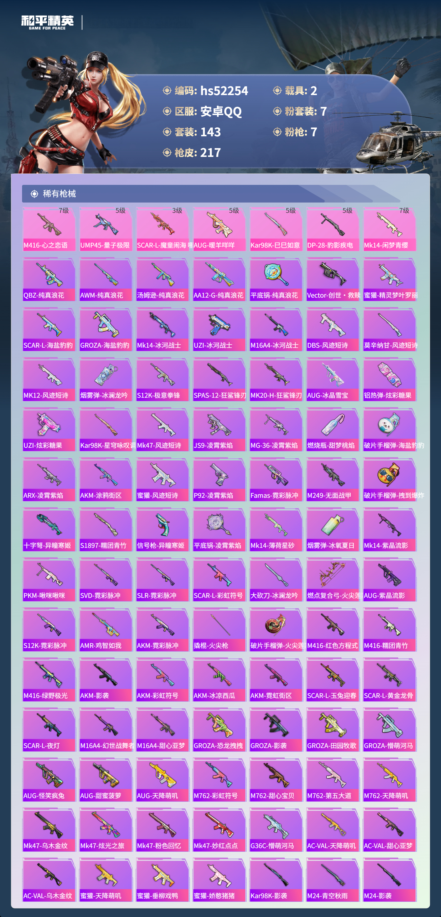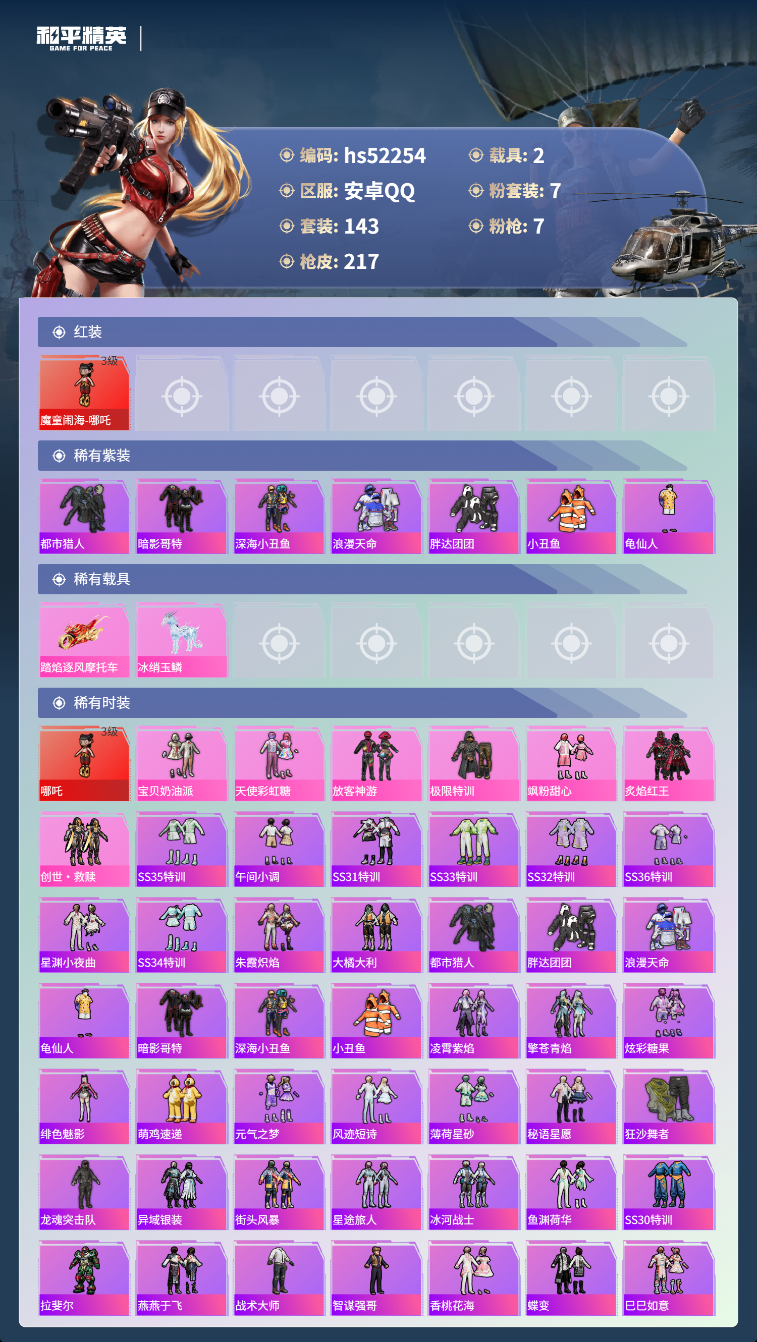 hs52254 安卓手q-12王牌印记-有战神框-1红装-7粉装-7特效呛-2载具-69478热力值-143套装-217呛皮-3卓越印记【1红装】魔童闹海-哪吒/3级【7粉装】套装-放客神游套装-炙焰红王套装-创世·救赎套装-飒粉甜心套装-宝贝奶油派套装-天使彩虹糖套装-极限特训【7特效呛】kar98k-巳巳如意/5级dp-28-豹影疾电/5级aug-暖羊咩咩/5级sca
