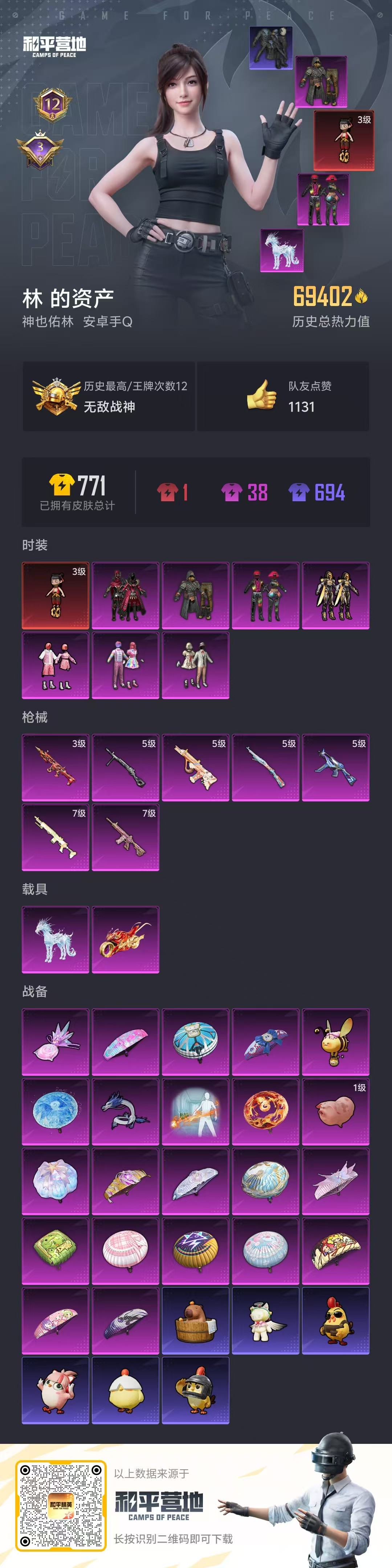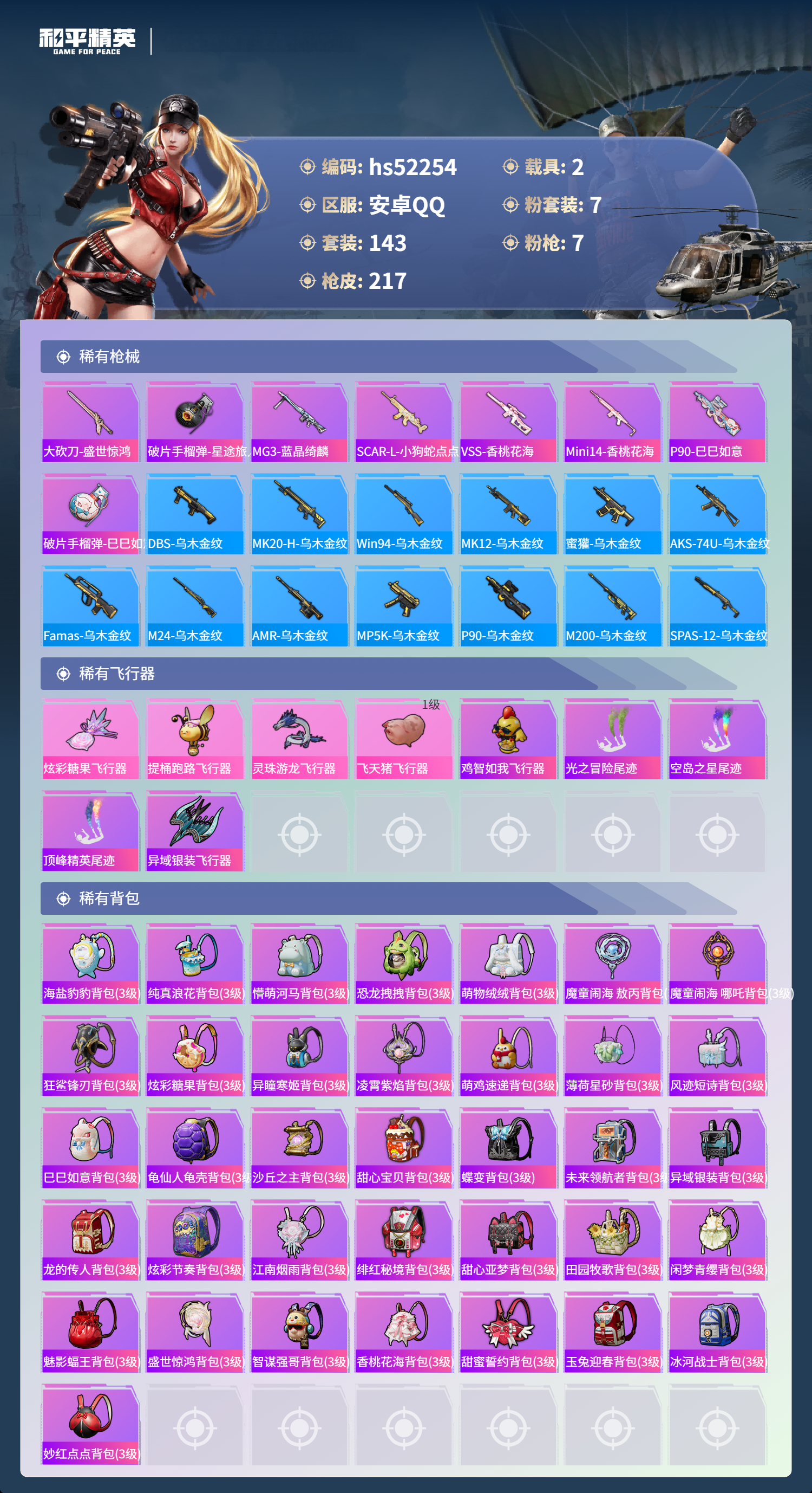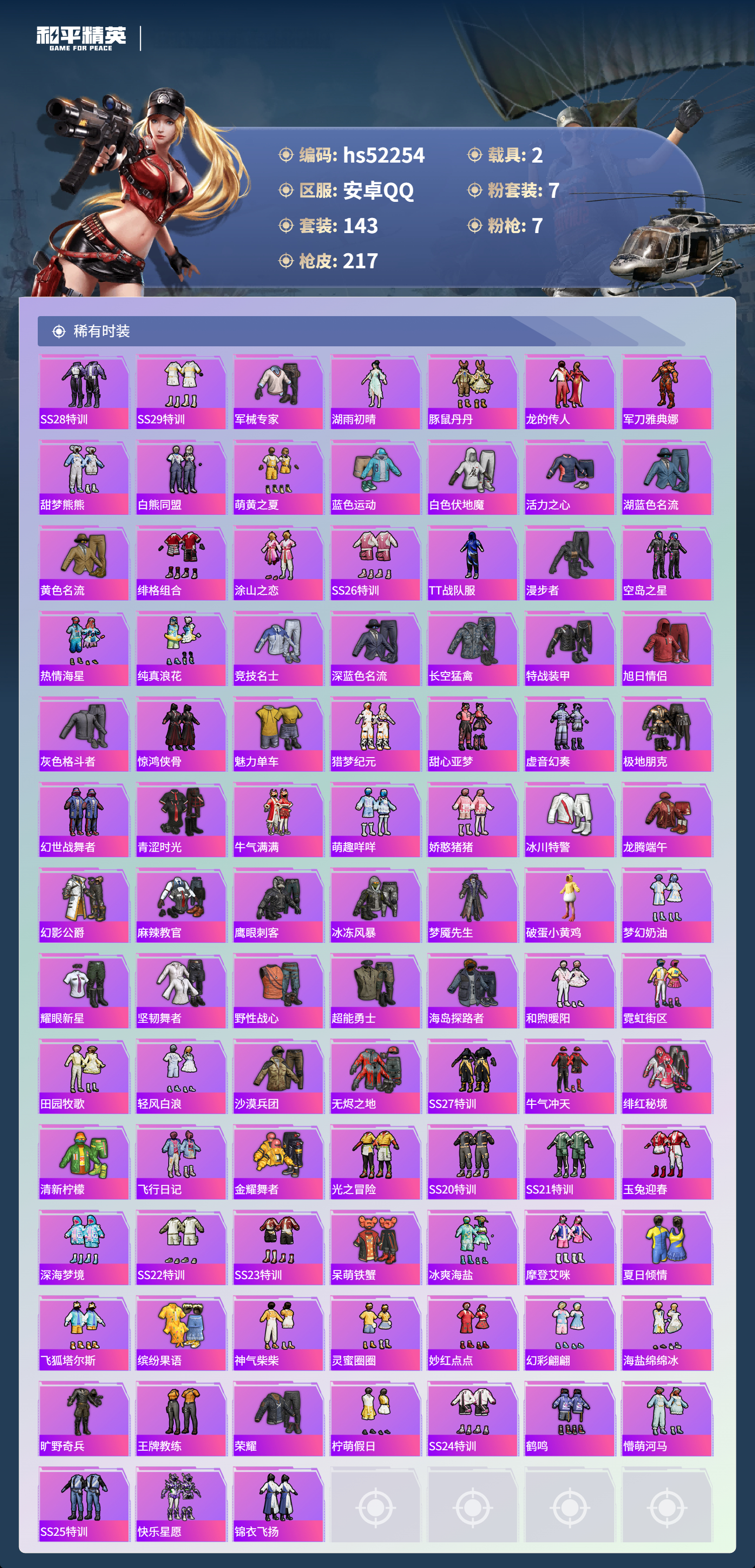 hs52254 安卓手q-12王牌印记-有战神框-1红装-7粉装-7特效呛-2载具-69478热力值-143套装-217呛皮-3卓越印记【1红装】魔童闹海-哪吒/3级【7粉装】套装-放客神游套装-炙焰红王套装-创世·救赎套装-飒粉甜心套装-宝贝奶油派套装-天使彩虹糖套装-极限特训【7特效呛】kar98k-巳巳如意/5级dp-28-豹影疾电/5级aug-暖羊咩咩/5级sca