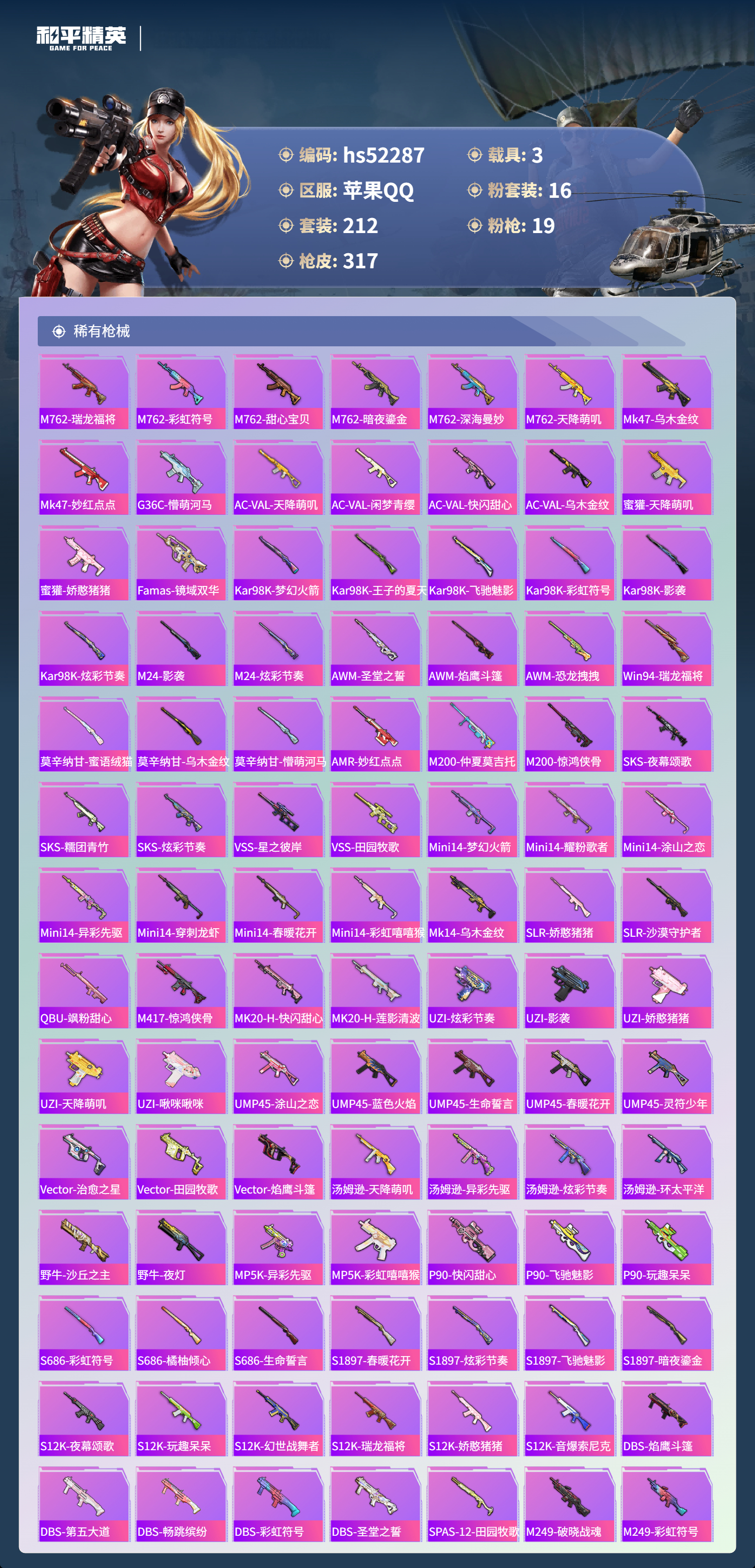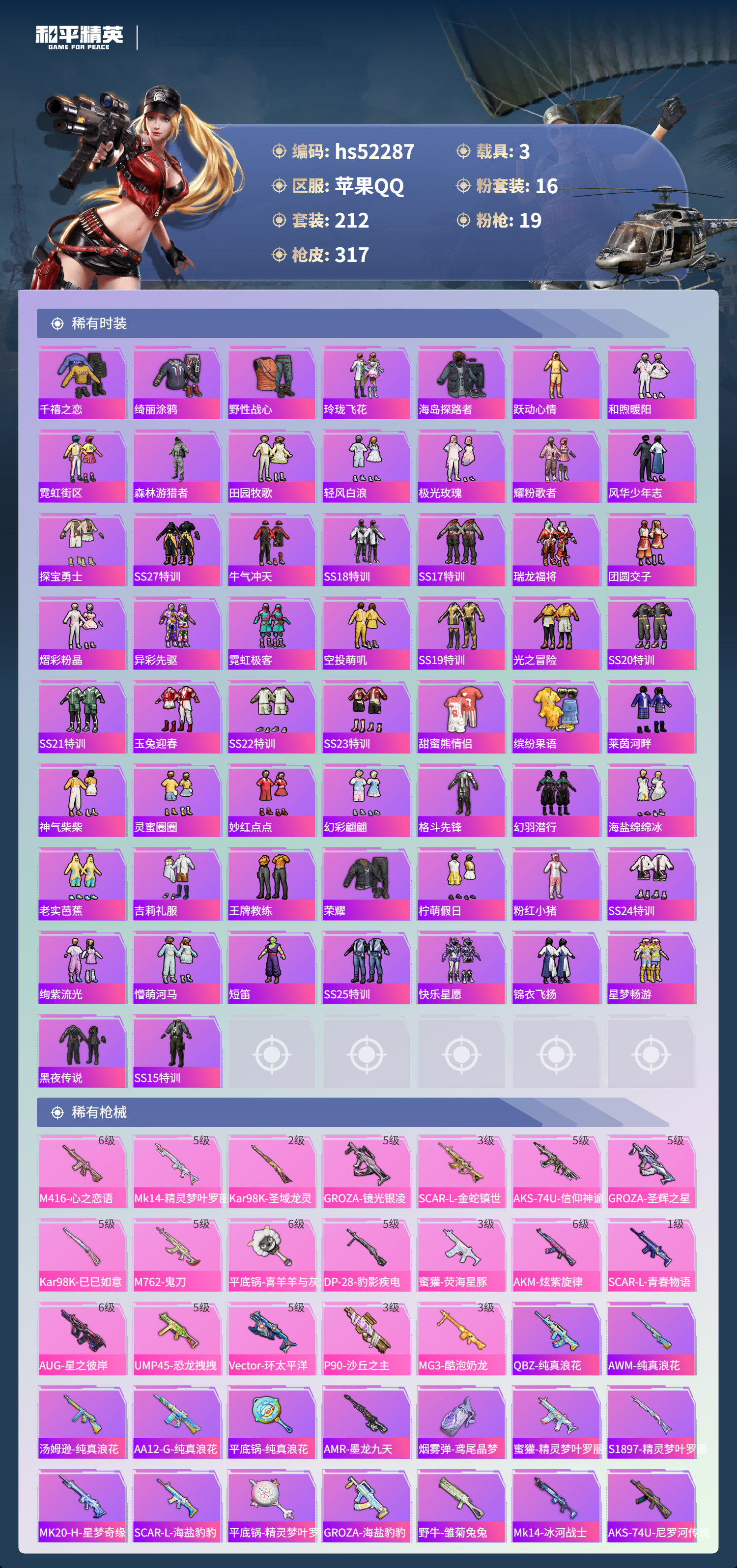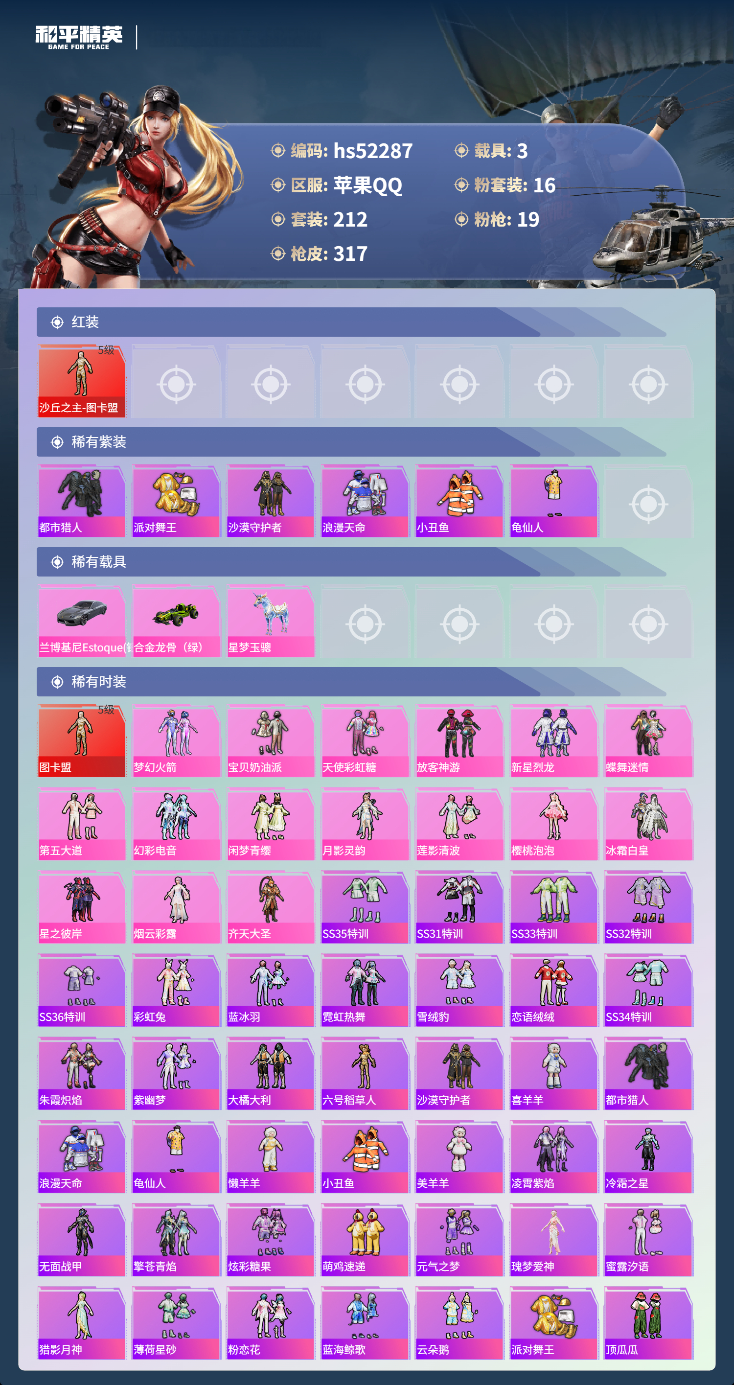 hs52287 苹果手q-18王牌印记-1红装-16粉装-19特效呛-3载具-热力值-212套装-317呛皮-4卓越印记-4传奇印记【1红装】沙丘之主-图卡盟/5级【16粉装】套装-冰霜白皇套装-齐天大圣套装-放客神游套装-梦幻火箭角色-樱桃泡泡套装-天使彩虹糖套装-星之彼岸角色-烟云彩露套装-莲影清波套装-蝶舞迷情套装-闲梦青缨角色-月影灵韵套装-宝贝奶