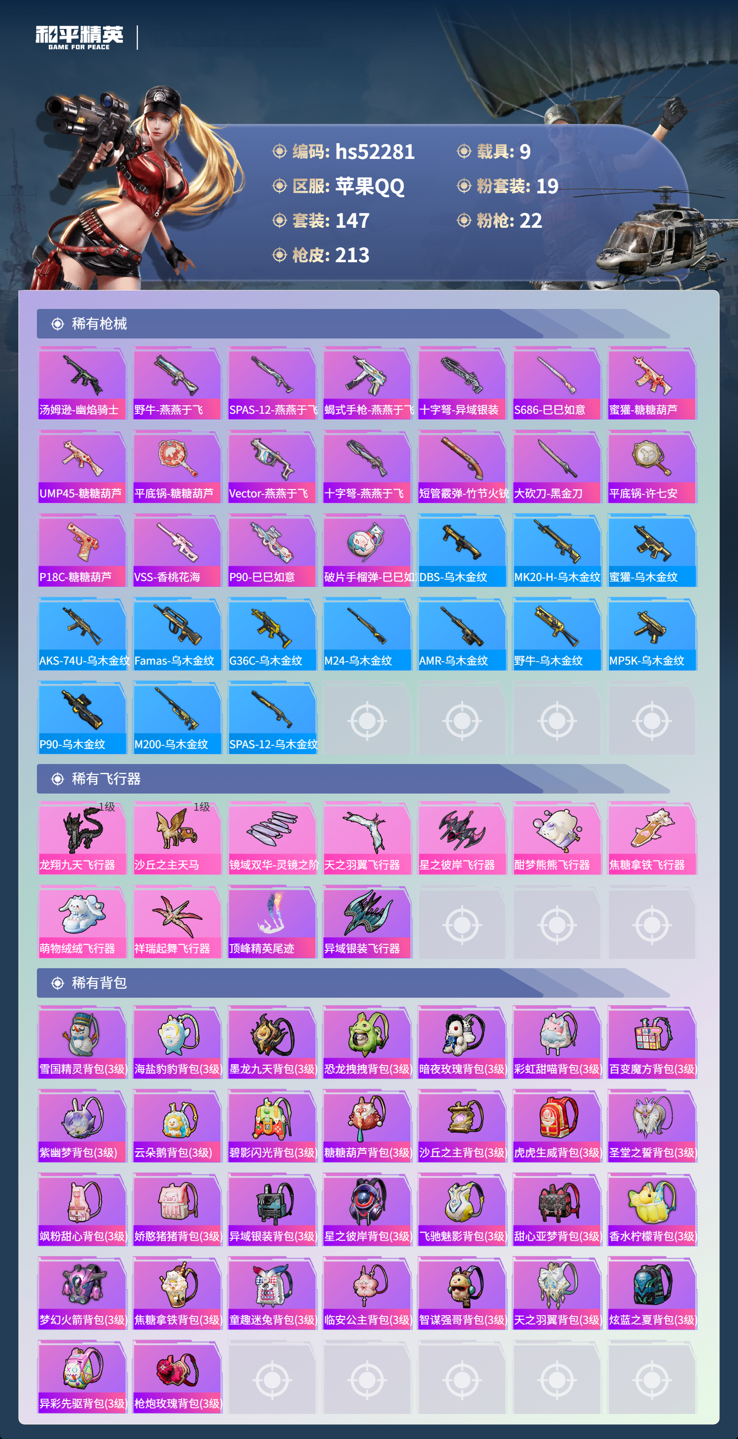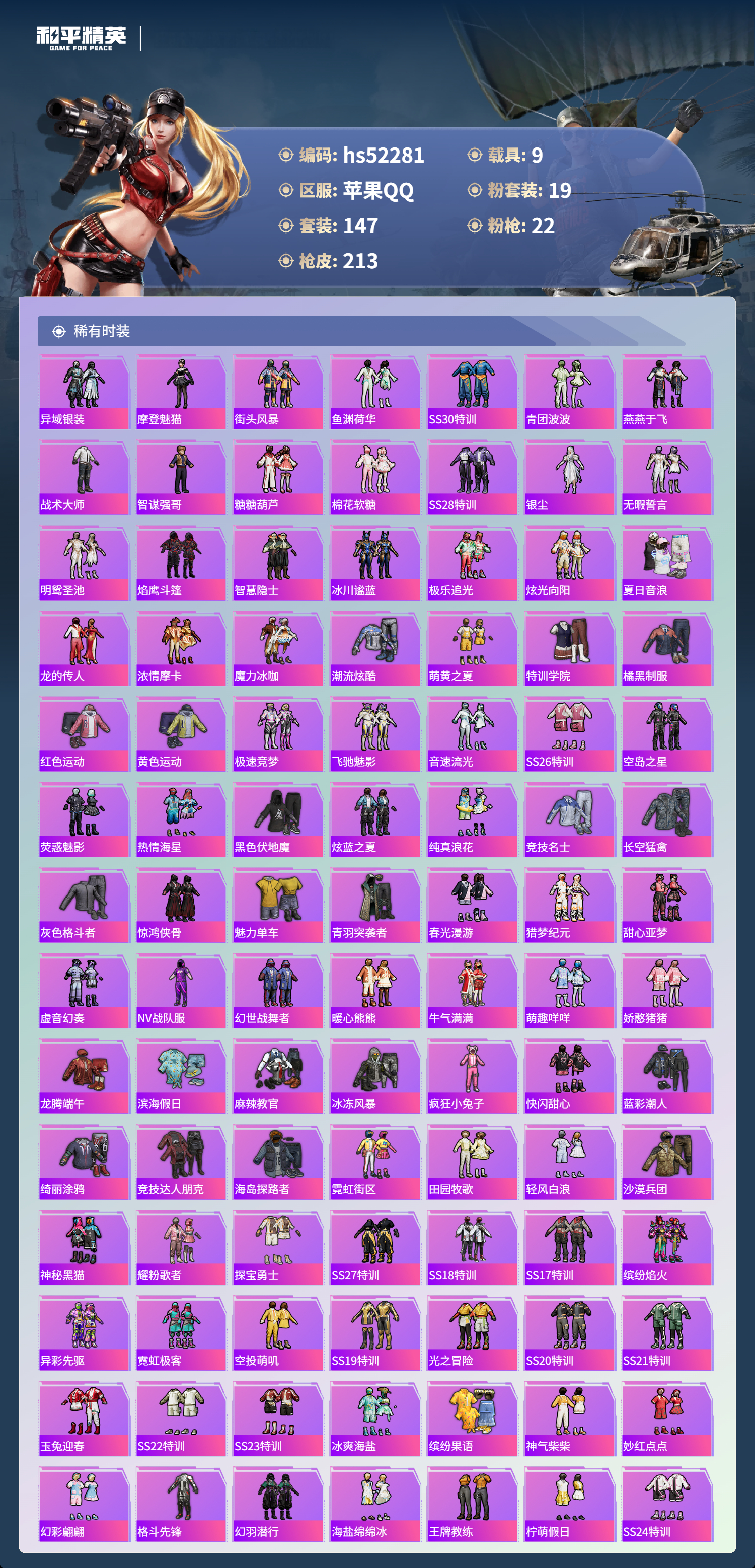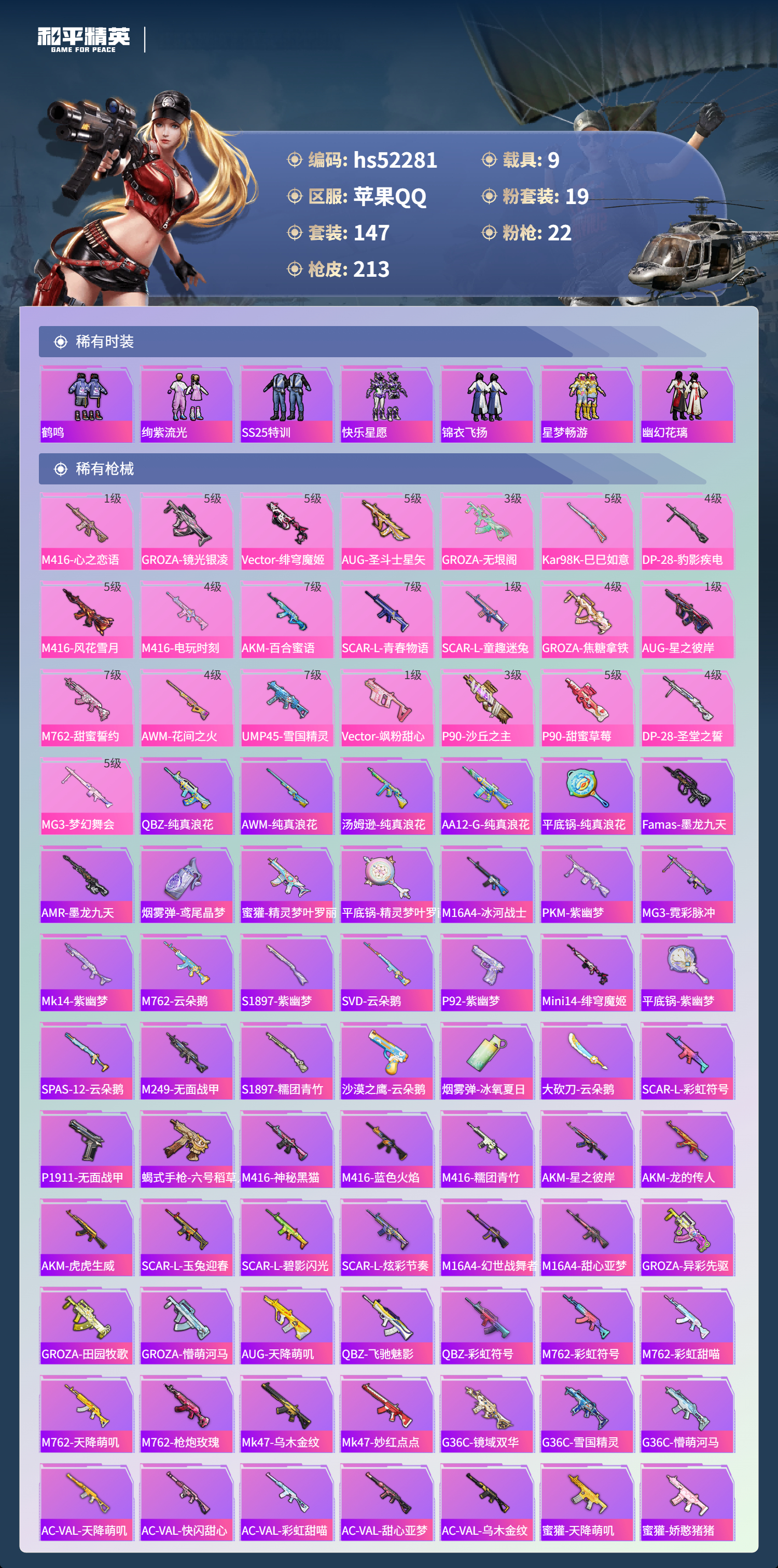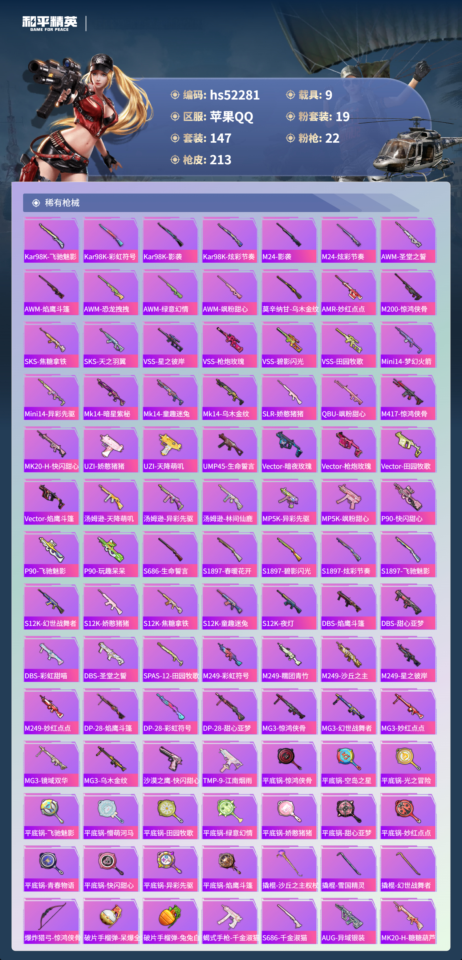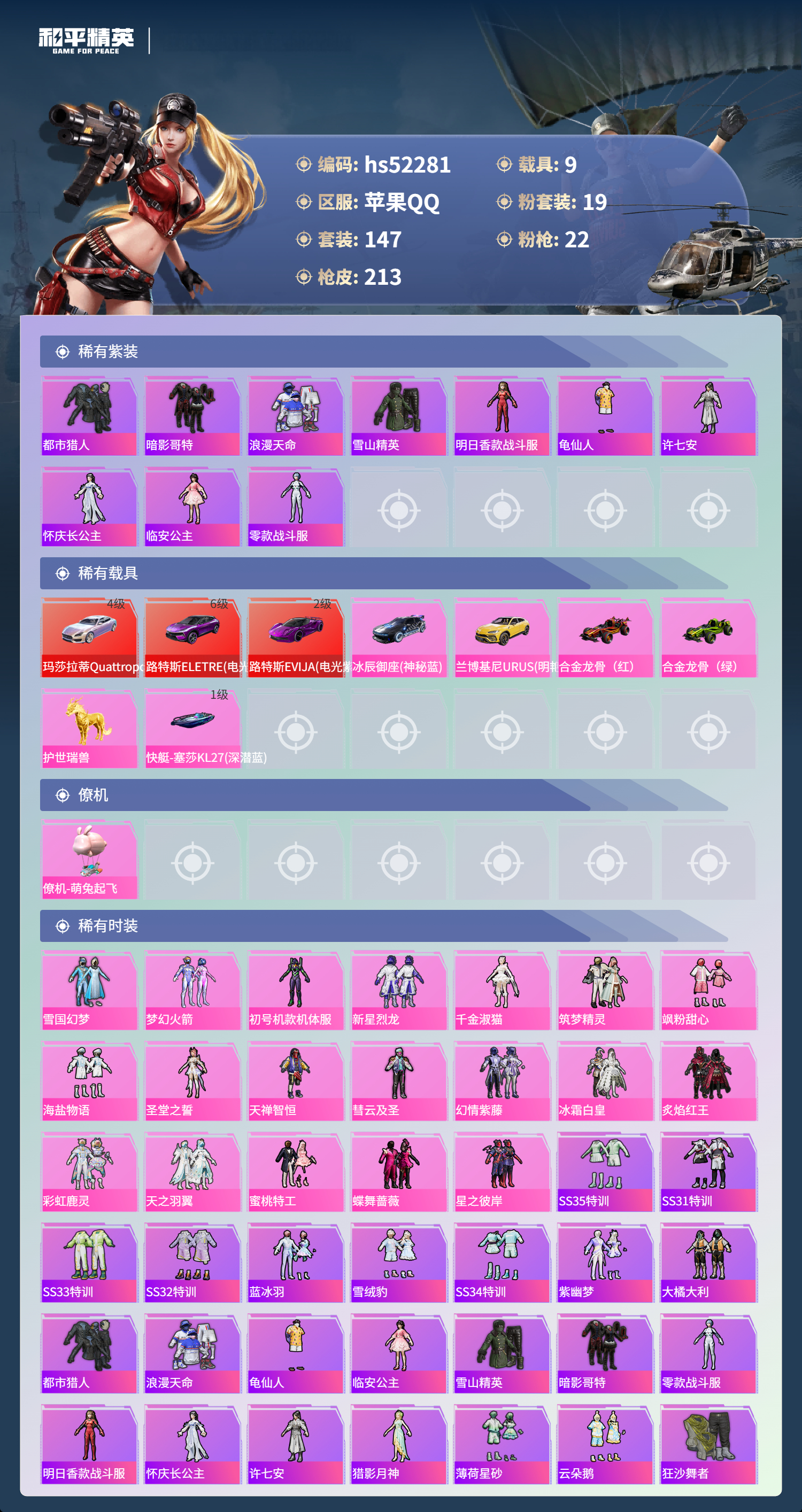 hs52281 苹果手q-11王牌印记-19粉装-22特效呛-9载具-热力值-147套装-213呛皮-3卓越印记-2传奇印记【19粉装】套装-幻情紫藤套装-天之羽翼套装-新星烈龙套装-天禅智恒角色-圣堂之誓套装-蝶舞蔷薇套装-蜜桃特工套装-雪国幻梦套装-彩虹鹿灵套装-冰霜白皇角色-初号机款机体服套装-海盐物语套装-彗云及圣套装-筑梦精灵角色-千金淑猫套