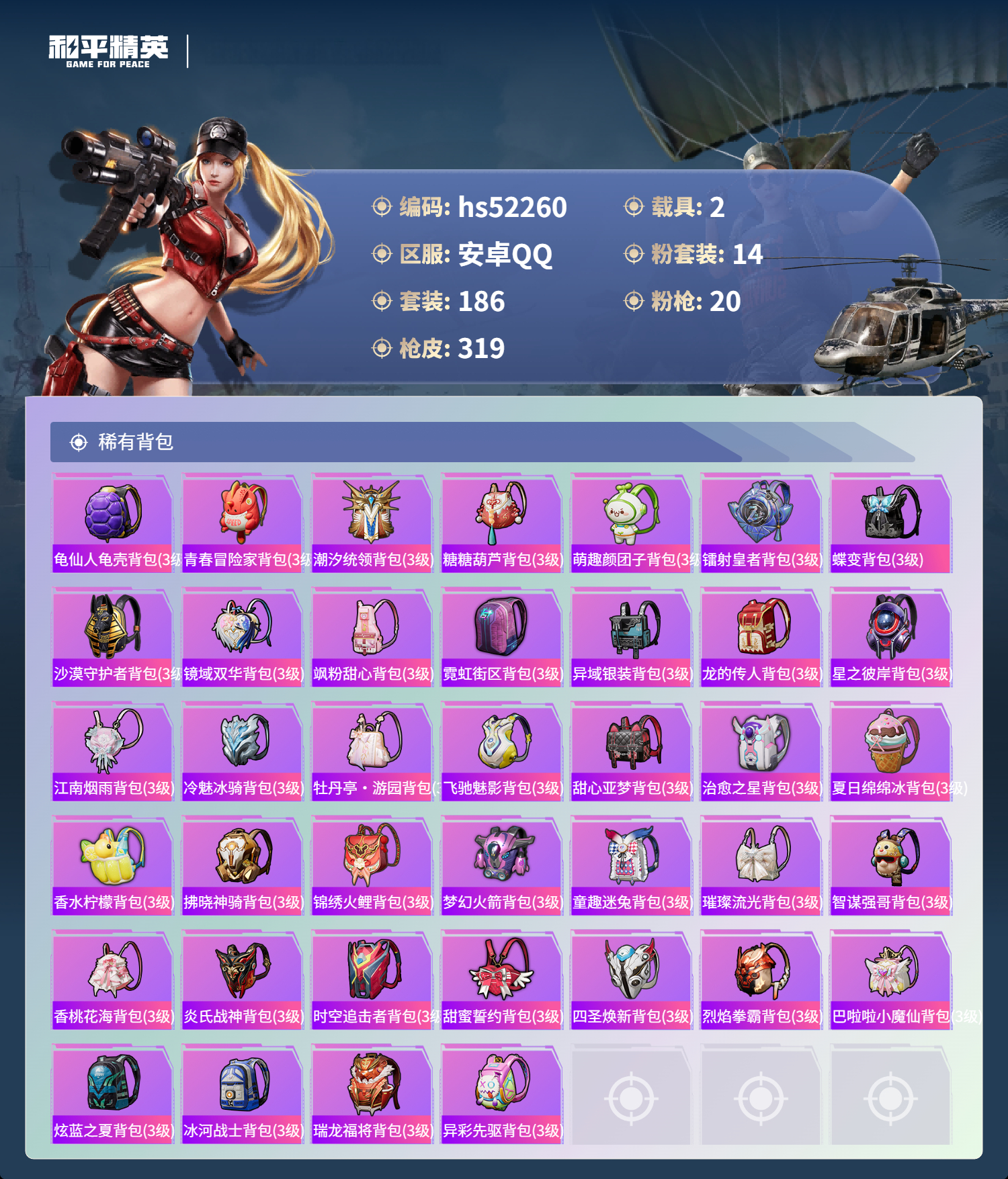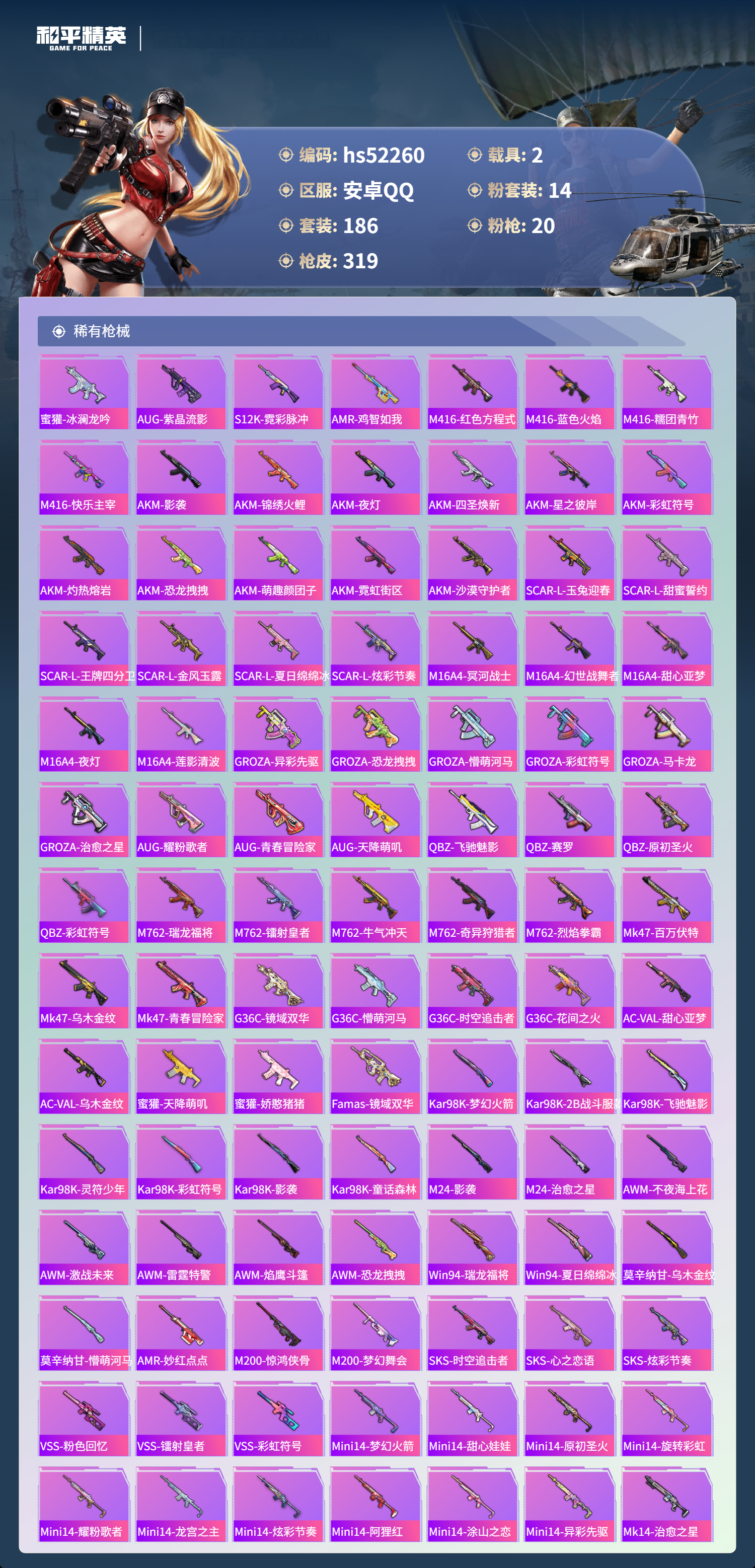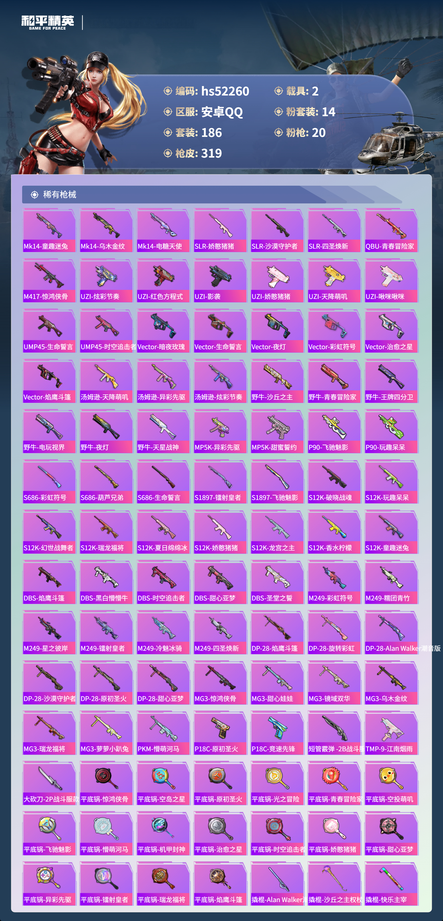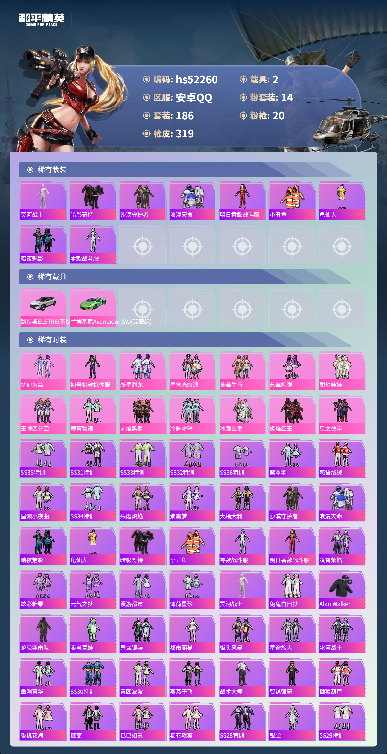 hs52260 安卓手q-11王牌印记-14粉装-20特效呛-2载具-热力值-186套装-319呛皮【14粉装】套装-蓝莓炮弹套装-冷魅冰骑套装-星穹咏叹调套装-酣梦娃娃套装-炙焰红王套装-新星烈龙套装-薄荷物语套装-赤焰黑爵套装-星之彼岸套装-梦幻火箭角色-初号机款机体服套装-草莓生巧套装-冰霜白皇套装-王牌四分卫【20特效呛】uzi-绮梦青鸾/5级