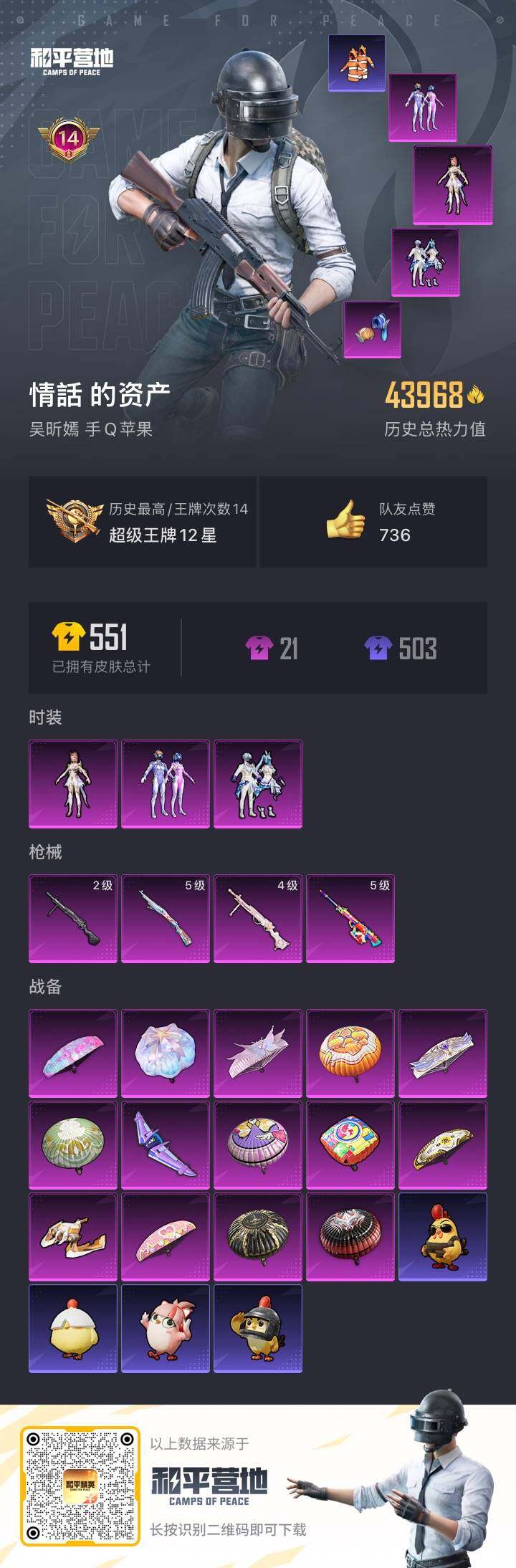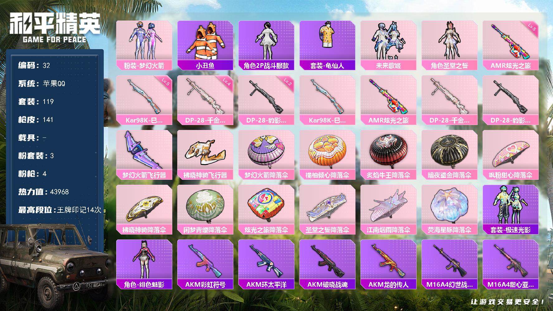 [14407277]苹果 手q-3粉装-4特效呛-0载具-2粉色飞行器-43968热力值-14王牌印记-119套装-141呛皮 【热门品类】:粉装-梦幻火箭,套装-小丑鱼,角色-2p战斗服款,套装-龟仙人 【粉色套装】:粉装-梦幻火箭,粉装-未来歌姬,角色-圣堂之誓 【粉色呛皮等级】:kar98k-巳巳如意五级,amr-炫光之旅五级,dp-28-千金淑猫四级,dp-28-豹影疾电二级 【粉色呛皮】:kar98k-巳巳如意,amr-炫光之旅,dp-28-千金淑猫,dp-28-豹影疾电 【粉色飞行器】:梦幻火箭飞行器,拂晓神骑飞行器 【粉色降落伞】:梦幻火箭降落伞,橘柚倾心降落伞,炙焰牛王降落伞,暗夜鎏金降落伞,飒粉甜心降落伞,拂晓神骑降落伞,闲梦青缨降落伞,炫光之旅降落伞,圣堂之誓降落伞,江南烟雨降落伞,荧海星豚降落伞 【稀有套装】:套装-龟仙人,套装-极速光影,角色-绯色魅影 【稀有呛皮】:akm-彩虹符号,akm-环太平洋,akm-破晓战魂,akm-龙的传人,m16a4-幻世战舞者,m16a4-甜心亚梦,m16a4-红色方程式,m16a4-蓝色火焰,scar-l-炫彩节奏,scar-l-玉兔迎春,scar-l-甜蜜旋律,scar-l-粉锦千层,scar-l-红色方程式,m416-摩登王国,m416-糯团青竹,m416-红色方程式,m416-蓝色火焰,groza-影袭,groza-恐龙拽拽,groza-懵萌河马,groza-田园牧歌,aug-耀粉歌者,q-彩虹符号,q-飞驰魅影,m762-天降萌叽,m762-彩虹符号,m762-瑞龙福将,m762-萌物绒绒,mk47-炫光之旅,g36c-懵萌河马,g36c-青丘仙客,ac-val-天降萌叽,ac-val-快闪甜心,ac-val-甜心亚梦,ac-val-闲梦青缨,蜜獾-娇憨猪猪,uzi-啾咪啾咪,uzi-天降萌叽,uzi-娇憨猪猪,uzi-影袭,uzi-红色方程式,ump45-快乐主宰,ump45-涂山之恋,ump45-炫光之旅,ump45-蓝色火焰,vect-田园牧歌,汤姆逊-天降萌叽,汤姆逊-炫彩节奏,汤姆逊-耀粉歌者,mp5k-甜蜜誓约,mp5k-飒粉甜心,p90-快闪甜心,p90-筑梦精灵,p90-闪光银龙,kar98k-影袭,kar98k-梦幻火箭,kar98k-王子的夏天,kar98k-红色方程式