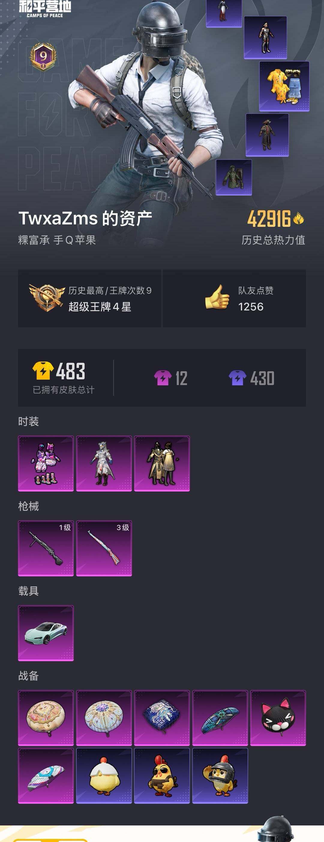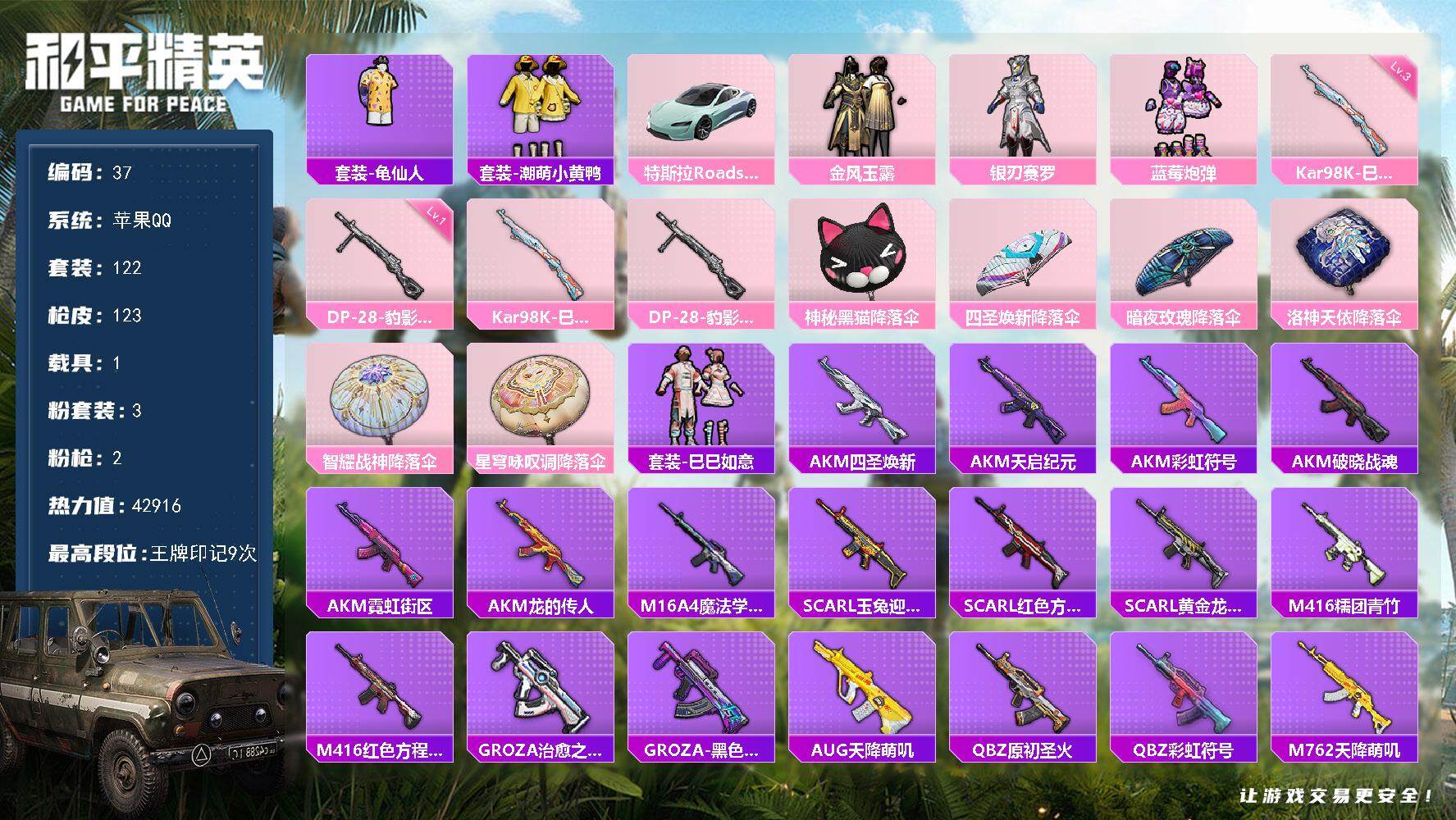 [14409157]【编号64190 可秒换绑】【新手号!直接上手!】苹果 手q-3粉装-2特效呛-1载具-0粉色飞行器-42916热力值-9王牌印记-122套装-123呛皮 【热门品类】:套装-龟仙人,套装-潮萌小黄鸭 【粉色载具】:特斯拉roadster(水滴蓝) 【粉色套装】:粉装-金风玉露,粉装-银刃赛罗,粉装-蓝莓炮弹 【粉色呛皮等级】:kar98k-巳巳如意三级,dp-28-豹影疾电一级 【粉色呛皮】:kar98k-巳巳如意,dp-28-豹影疾电 【粉色降落伞】:神秘黑猫降落伞,四圣焕新降落伞,暗夜玫瑰降落伞,洛神天依降落伞,智耀战神降落伞,星穹咏叹调降落伞 【稀有套装】:套装-龟仙人,套装-巳巳如意 【稀有呛皮】:akm-四圣焕新,akm-天启纪元,akm-彩虹符号,akm-破晓战魂,akm-霓虹街区,akm-龙的传人,m16a4-魔法学院,scar-l-玉兔迎春,scar-l-红色方程式,scar-l-黄金龙骨,m416-糯团青竹,m416-红色方程式,groza-治愈之星,groza-黑色刀锋,aug-天降萌叽,q-原初圣火,q-彩虹符号,m762-天降萌叽,m762-奇异狩猎者,m762-拳皇97,m762-牛气冲天,m762-瑞龙福将,m762-镭射皇者,g36c-金风玉露,ac-val-天降萌叽,蜜獾-天降萌叽,uzi-天降萌叽,uzi-影袭,uzi-炫彩节奏,uzi-红色方程式,ump45-天启纪元,ump45-生命誓言,vect-暗夜玫瑰,vect-治愈之星,vect-生命誓言,vect-黑色刀锋,汤姆逊-勇闯险境,mp5k-众神之王,p90-巳巳如意,kar98k-勇闯险境,kar98k-彩虹符号,m24-影袭,m24-治愈之星,m24-冰封烈焰,sks-勇闯险境,sks-夜灯,vss-华贵君王,vss-碧影闪光,vss-镭射皇者,vss-黑色刀锋,mini14-原初圣火,mini14-金鼠迎春,mini14-阿狸红,mk14-治愈之星,win94-瑞龙福将,slr-彩虹符号,s686-冰封烈焰,s686-生命誓言,s686-巳巳如意,s1897-勇闯险境,s1897-镭射皇者,s12k-玩趣呆呆,s12k-瑞龙福将,s12k-垂柳戏鸭,m249-拳皇97,dp-28-原初圣火,dp-28-紫翼圣骑,dp-28-锦绣火鲤,