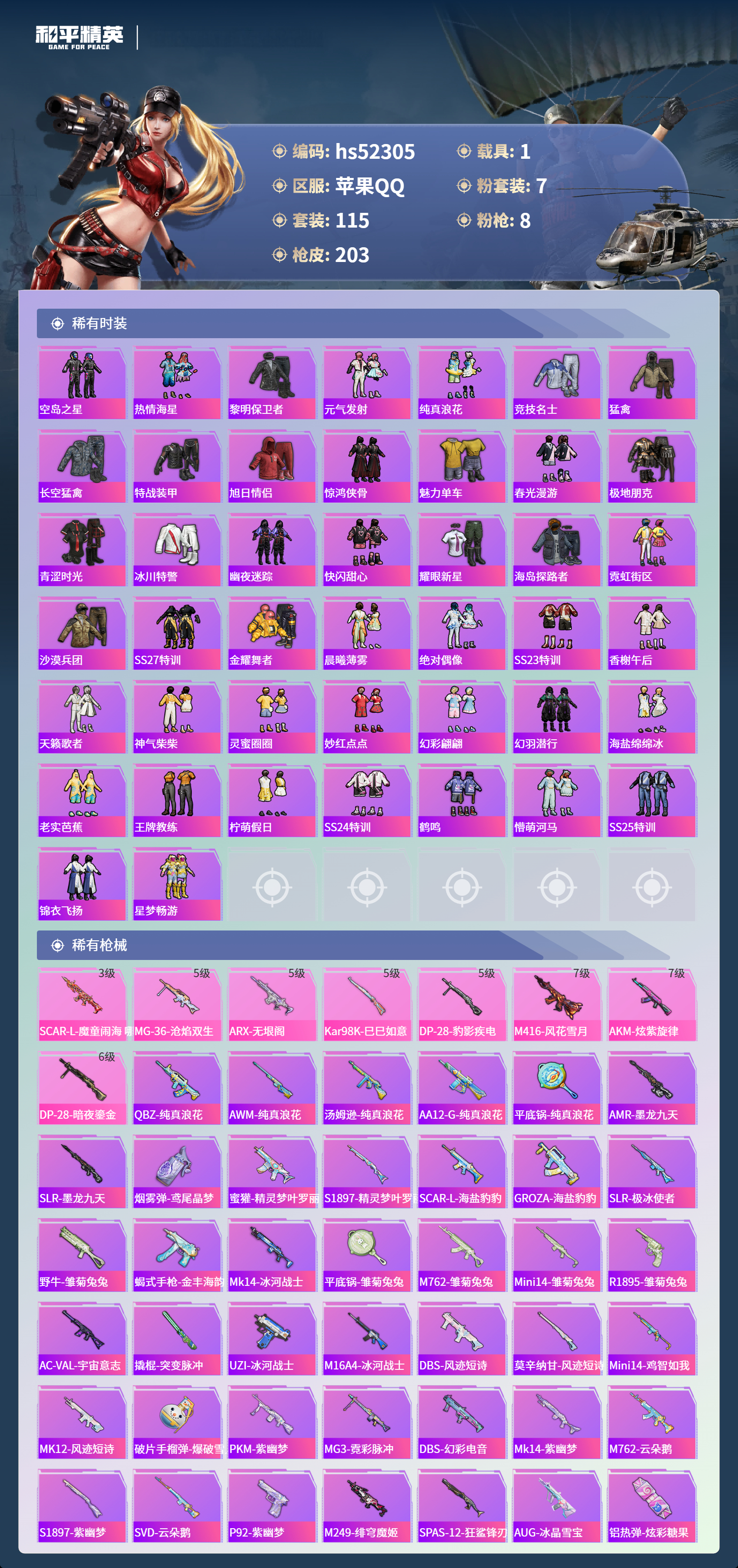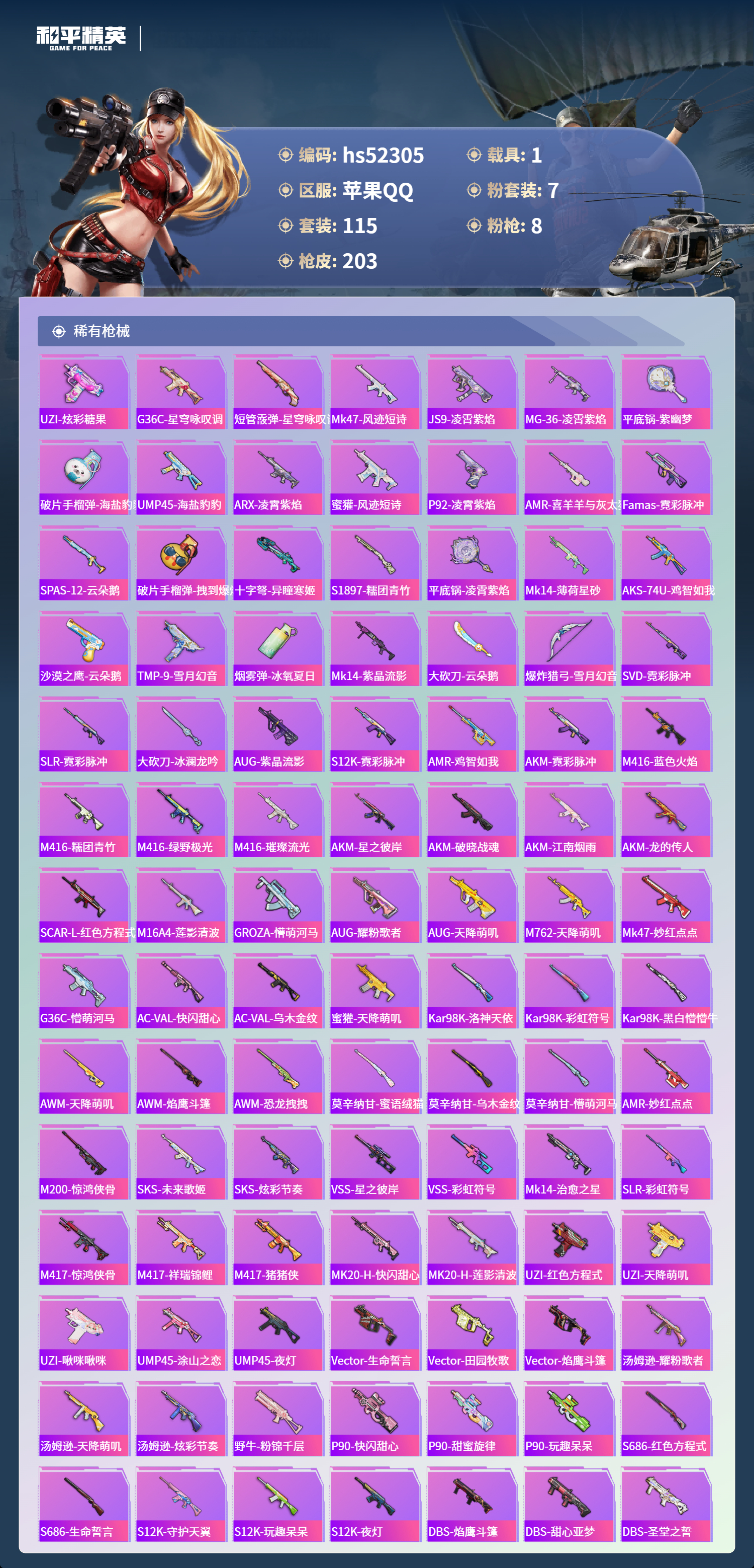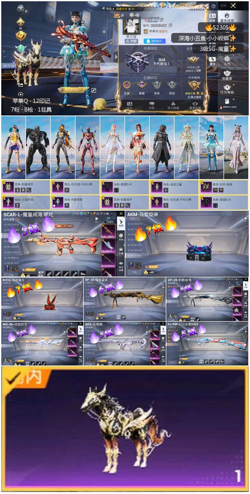 hs52305 苹果手q-12王牌印记-7粉装-8特效呛-1载具-62001热力值-115套装-203呛皮-4卓越印记【7粉装】角色-狂花道·不知火舞角色-猩猩队长角色-冷漠罗丽角色-圣堂之誓套装-创世·救赎套装-射星猎手角色-异瞳寒姬【8特效呛】akm-炫紫旋律/7级scar-l-魔童闹海 哪吒/3级dp-28-暗夜鎏金/6级dp-28-豹影疾电/5级m416-风花雪月/