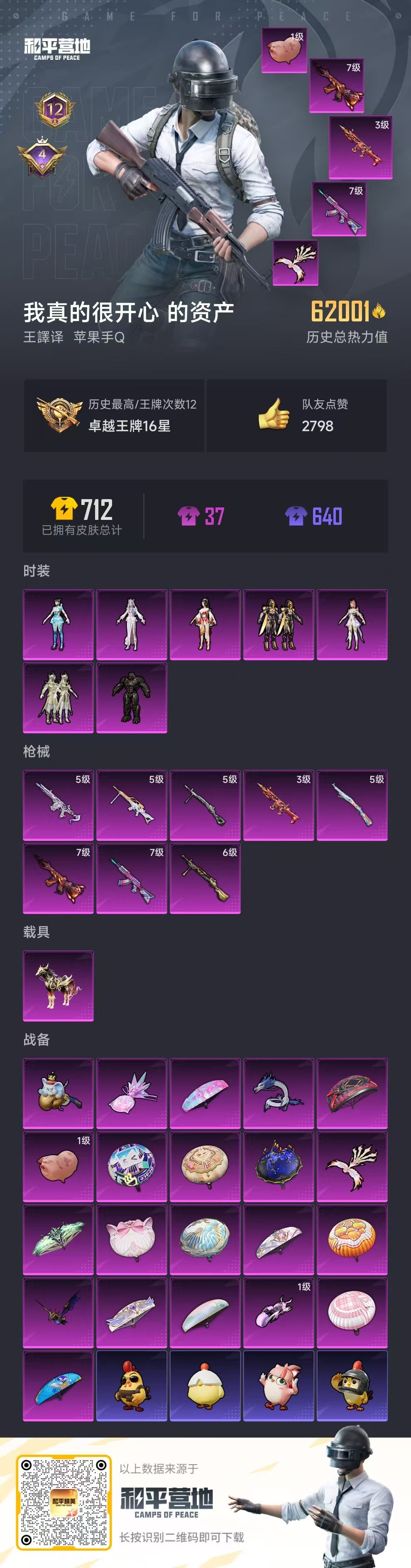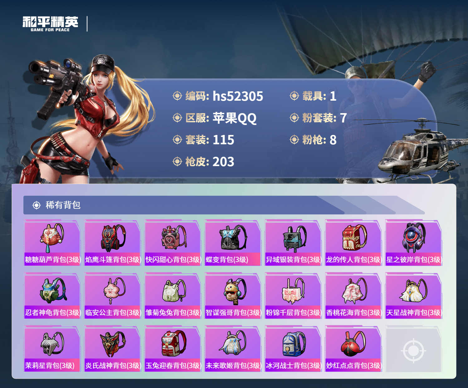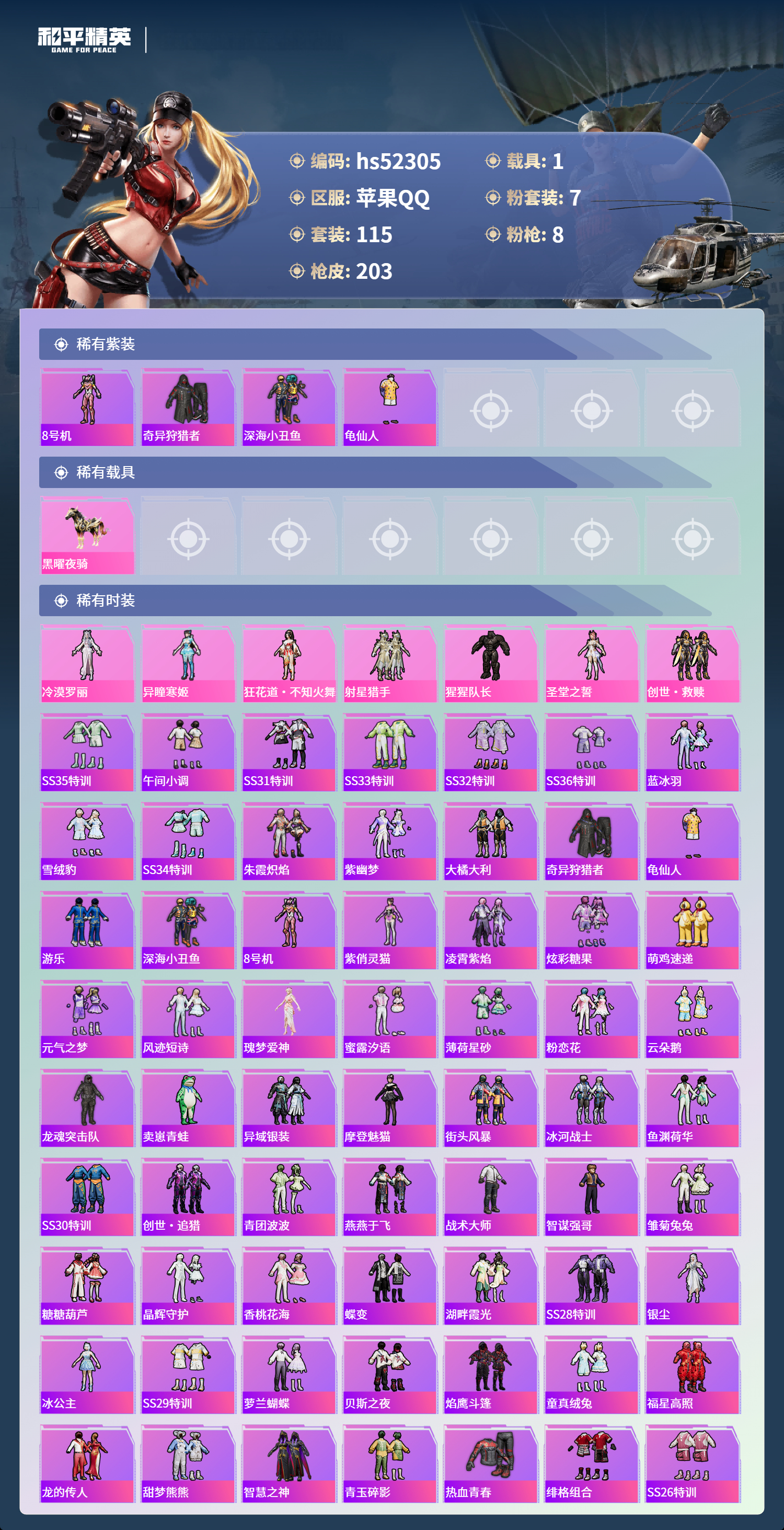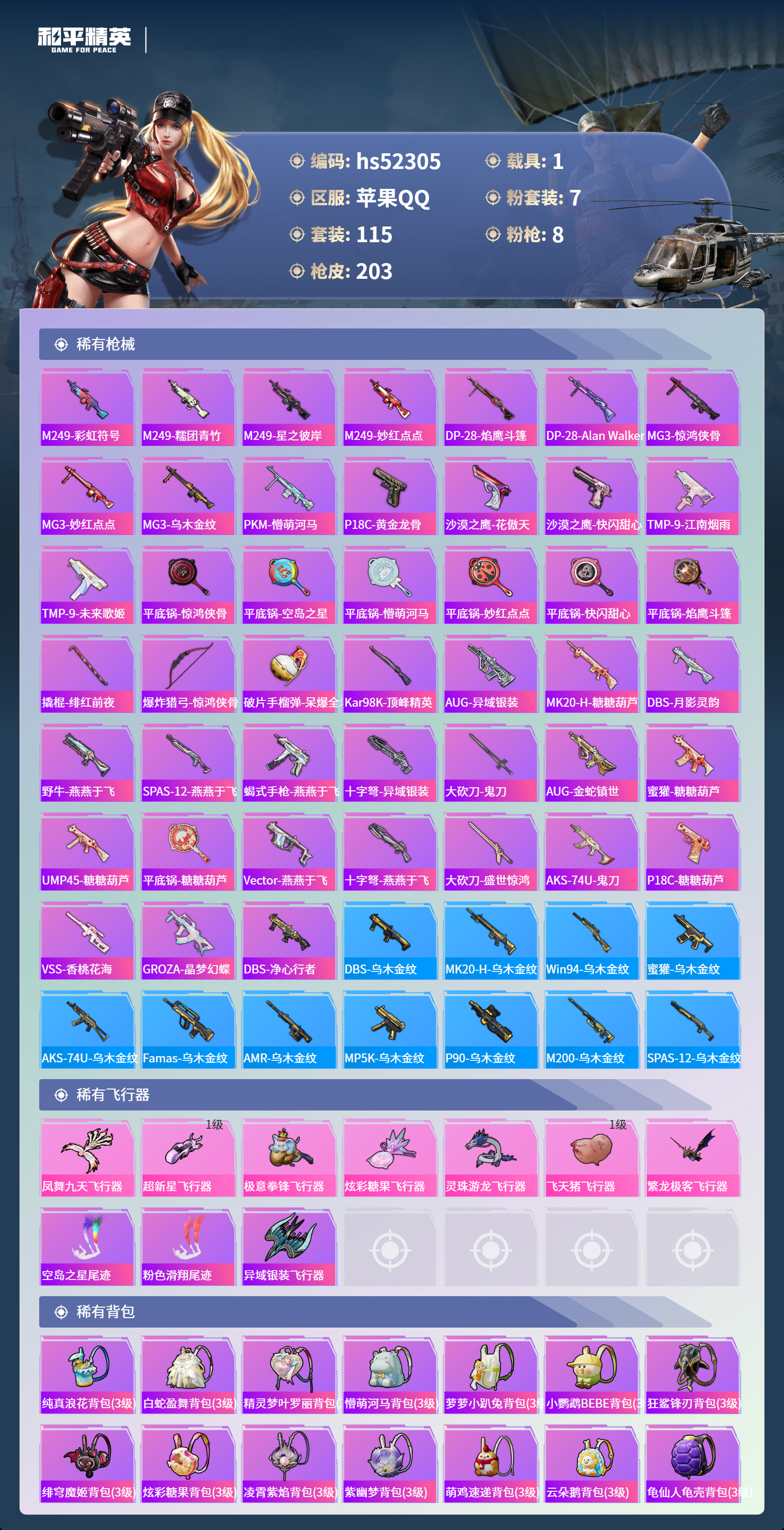 hs52305 苹果手q-12王牌印记-7粉装-8特效呛-1载具-62001热力值-115套装-203呛皮-4卓越印记【7粉装】角色-狂花道·不知火舞角色-猩猩队长角色-冷漠罗丽角色-圣堂之誓套装-创世·救赎套装-射星猎手角色-异瞳寒姬【8特效呛】akm-炫紫旋律/7级scar-l-魔童闹海 哪吒/3级dp-28-暗夜鎏金/6级dp-28-豹影疾电/5级m416-风花雪月/