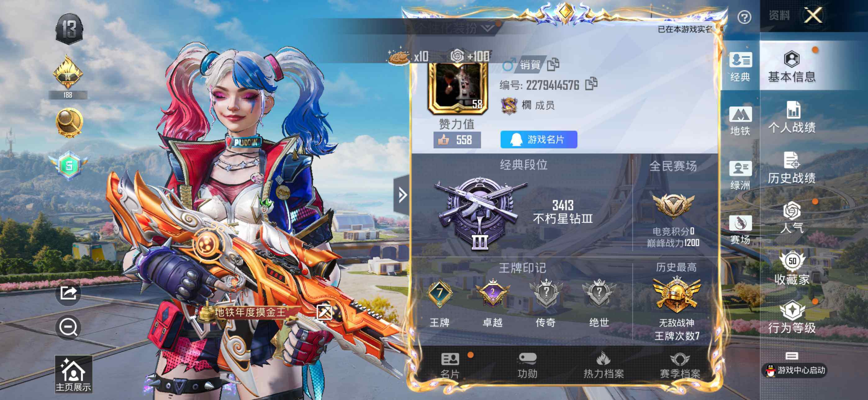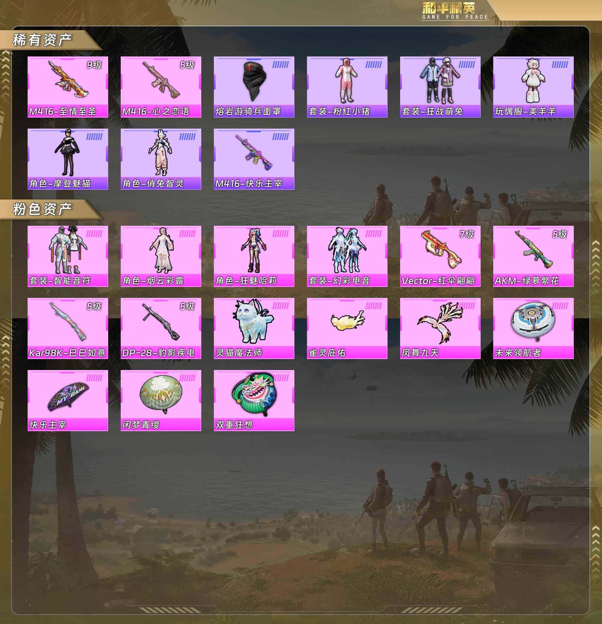 身法号-地铁满天赋/m416-至情至圣[9级]/m416-心之恋语[5级]/熔岩游骑兵面罩/狂战萌兔/摩登魅猫/m416-快乐主宰/智能音符/烟云彩露/狂魅哈莉/幻彩电音/维克托-红伞翩翩[7级]/akm-绿萝繁花[5级]/kar98k-巳巳如意[5级]/dp-28-豹影疾电[5级]/没战神框 hp3855 【热门品类】:套装-ss1特训,套装-粉红小猪,熔岩游骑兵面罩,熔岩游骑兵连帽夹克 【粉色套装】:粉装-智能音符,角色-烟云彩露,粉装-幻彩电音,角色-狂魅哈莉 【粉色呛皮等级】:akm-绿萝繁花五级,m416-心之恋语五级,m416-至情至圣九级,vect-红伞翩翩七级,kar98k-巳巳如意五级,dp-28-豹影疾电五级 【粉色呛皮】:akm-绿萝繁花,m416-心之恋语,m416-至情至圣,vect-红伞翩翩,kar98k-巳巳如意,dp-28-豹影疾电 【粉色飞行器】:凤舞九天飞行器,雀灵庇佑飞行器,灵猫魔法师飞行器 【粉色降落伞】:快乐主宰降落伞,闲梦青缨降落伞,未来领航者降落伞,双重狂想降落伞 【稀有套装】:套装-巳巳如意,套装-糖糖葫芦,套装-青团波波,角色-摩登魅猫,角色-俏兔智灵,套装-燕燕于飞,套装-鱼渊荷华,角色-糖霜甜心,角色-蜜桃派对,套装-粉恋花,套装-紫幽梦,套装-蓝冰羽,套装-霓虹热舞,套装-云朵鹅,套装-雪绒豹,套装-混沌火种,套装-朱霞炽焰,套装-凌霄紫焰,玩偶服-美羊羊 【稀有呛皮】:akm-生命誓言,akm-龙的传人,m16a4-幻世战舞者,m16a4-快乐主宰,scar-l-炫彩节奏,scar-l-生命誓言,scar-l-小狗蛇点点,m416-快乐主宰,m416-糯团青竹,m416-红色方程式,aug-天降萌叽,q-彩虹符号,q-未来歌姬,m762-天降萌叽,m762-快乐主宰,m762-云朵鹅,ac-val-闲梦青缨,arx-凌霄紫焰,uzi-啾咪啾咪,uzi-天降萌叽,ump45-快乐主宰,vect-焰鹰斗篷,汤姆逊-天降萌叽,aks-74u-辉羽雀灵,js9-凌霄紫焰,p90-巳巳如意,kar98k-2b战斗服款,awm-焰鹰斗篷,mini14-生命誓言,m417-惊鸿侠骨,m200-惊鸿侠骨,m200-爆裂游戏,svd-云朵鹅,s686-生命誓言,s1897-荧海星豚,s12k-玩趣呆呆,dbs-焰鹰斗篷,dbs-幻彩电音,spas-12-田园牧歌,spas-12-苔丝玫瑰,spas-12-云朵鹅,m249-彩虹符号,dp-28-焰鹰斗篷,dp-28-御兔特攻,mg3-幻世战舞者,mg3-惊鸿侠骨,mg3-智耀战神,mg-36-凌霄紫焰,p92-凌霄紫焰,沙墨之鹦-云朵鹅,战术弩-江南烟雨,爆炸猎弓-惊鸿侠骨,大砍刀-云朵鹅,撬棍-双重狂想,平底锅-凌霄紫焰,平底锅-辉羽雀灵,破片手留单-巳巳如意 【其他套装】:套装-ss25特训,套装-ss26特训,套装-ss27特训,套装-北国孤狼,套装-夏日倾情,套装-好奇恐龙,套装-旭日情侣,套装-暗金炫舞,套装-燃烧卡路里,套装-狂战萌兔,套装-白色伏地魔,套装-空岛之星,套装-竞技名士,套装-粉红小猪,套装-绯格组合,套装-缤纷果语,套装-超能勇士,套装-霓虹街区,套装-青春校园,套装-青涩时光,套装-青玉碎影,套装-龙的传人,套装-刚毅裁决者,套装-机械哨兵,套装-装甲骑士,套装-街舞之王,套装-街舞达人,套装-圣诞大吉,套装-艾菲玫瑰,套装-惊鸿侠骨,套装-锦衣飞扬,套装-焰鹰斗篷,套装-幽夜迷踪,套装-幻羽潜行,角色-蝶吟花词 【营地id】:951675241
