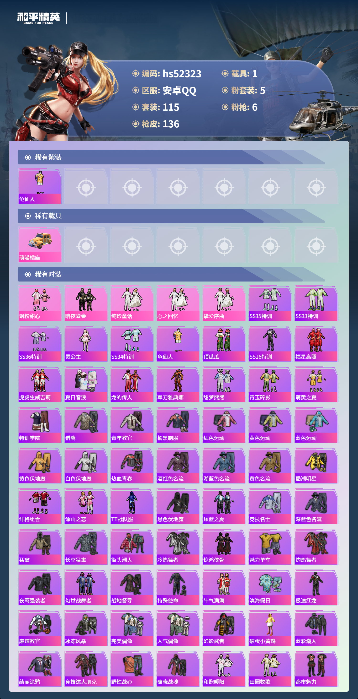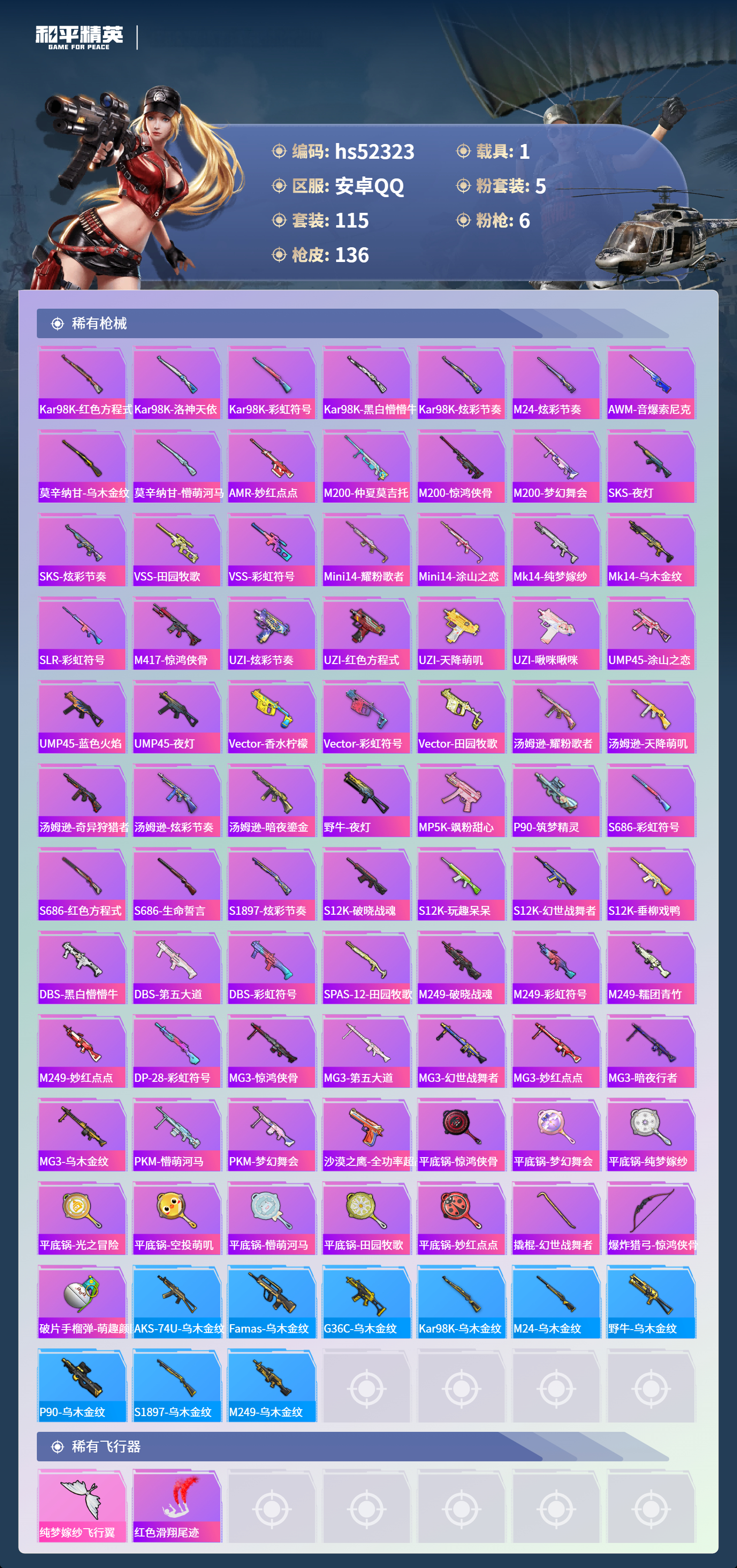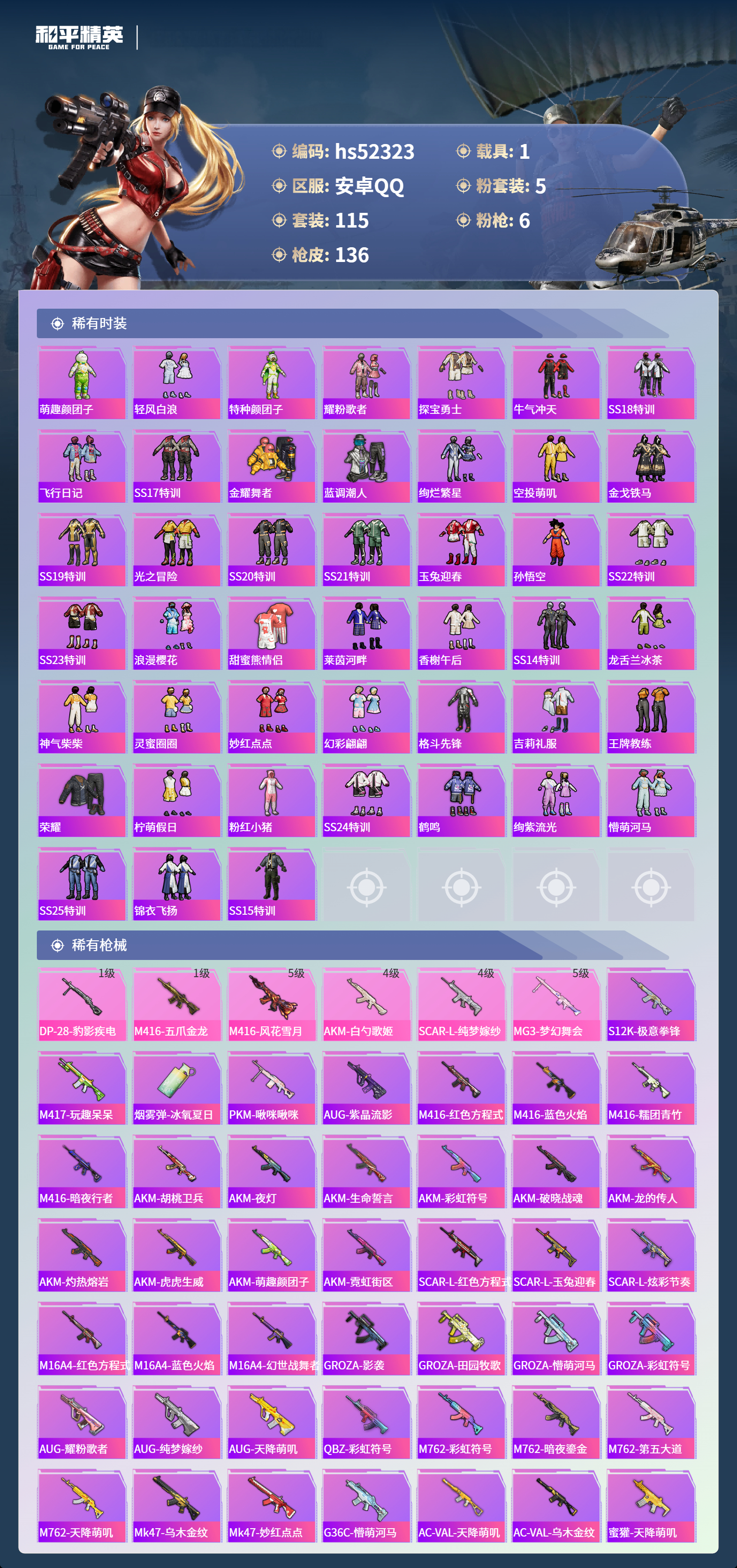 hs52323 安卓手q-8王牌印记-有战神框-5粉装-6特效呛-1载具-44820热力值-115套装-136呛皮-2卓越印记-1传奇印记【5粉装】套装-挚爱序曲套装-心之回忆套装-暗夜鎏金套装-纯珍童话套装-飒粉甜心【6特效呛】scar-l-纯梦嫁纱/4级akm-白勺歌姬/4级m416-五爪金龙/1级dp-28-豹影疾电/1级m416-风花雪月/5级mg3-梦幻舞会/5级