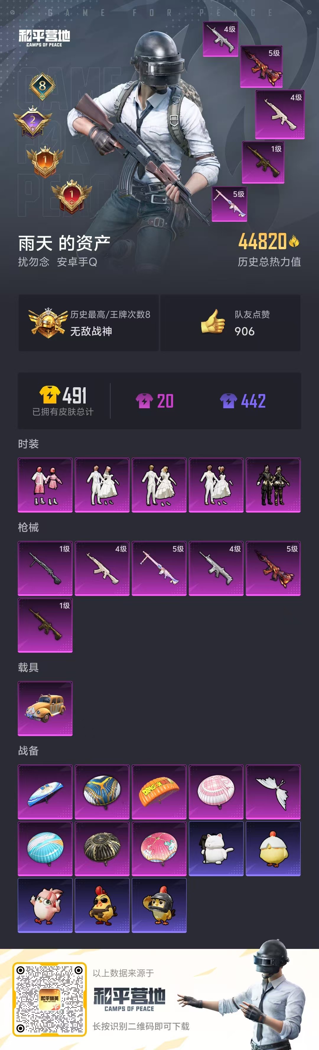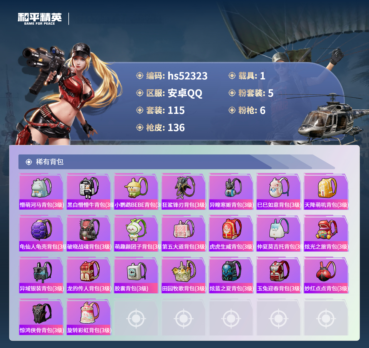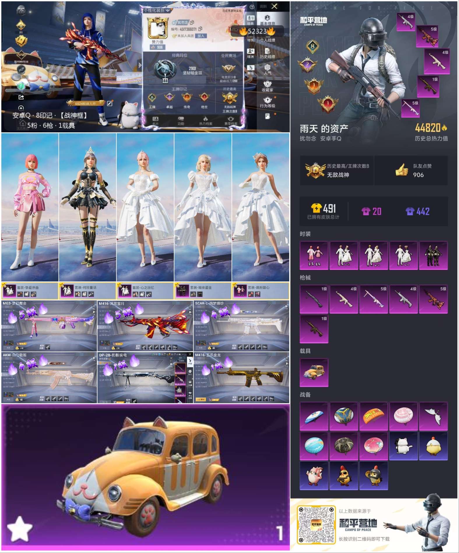 hs52323 安卓手q-8王牌印记-有战神框-5粉装-6特效呛-1载具-44820热力值-115套装-136呛皮-2卓越印记-1传奇印记【5粉装】套装-挚爱序曲套装-心之回忆套装-暗夜鎏金套装-纯珍童话套装-飒粉甜心【6特效呛】scar-l-纯梦嫁纱/4级akm-白勺歌姬/4级m416-五爪金龙/1级dp-28-豹影疾电/1级m416-风花雪月/5级mg3-梦幻舞会/5级