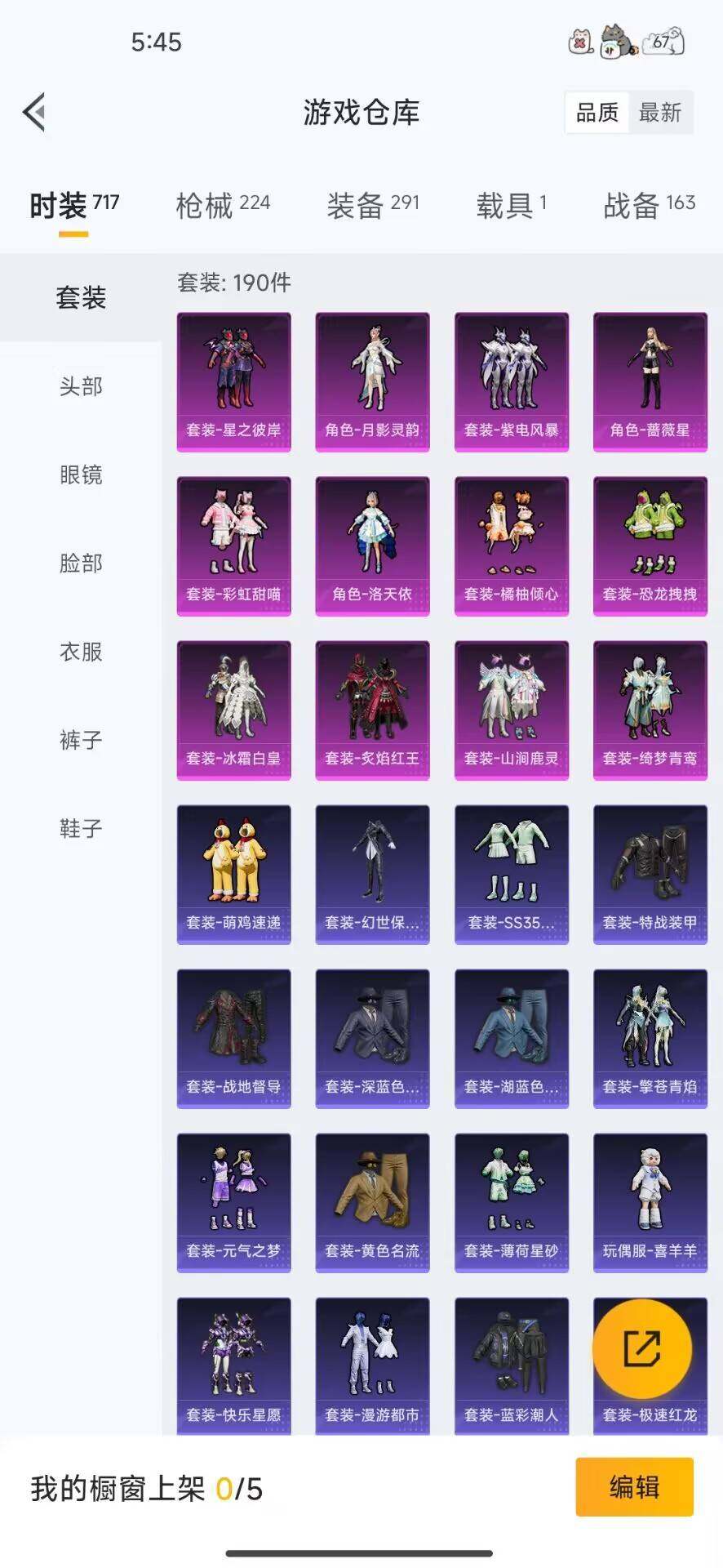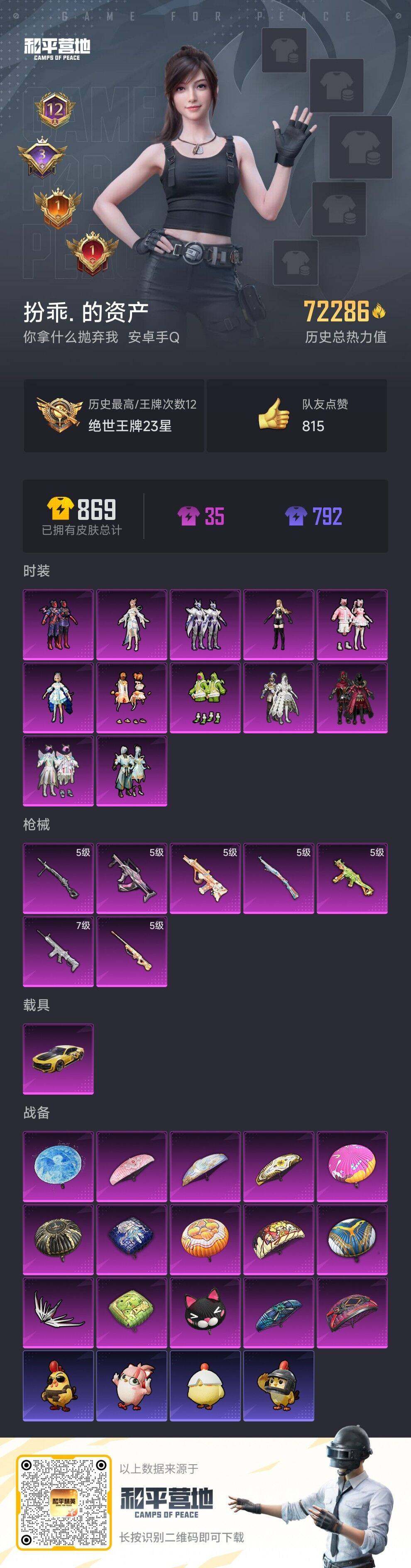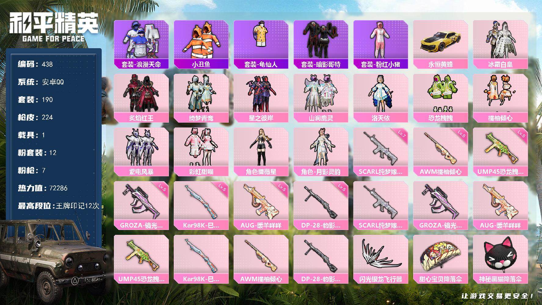 [14410185]安卓 手q-12粉装-7特效呛-1载具-1粉色飞行器-72286热力值-12王牌印记-190套装-224呛皮 【热门品类】:套装-浪漫天命,套装-小丑鱼,套装-龟仙人,套装-暗影哥特,套装-粉红小猪 【粉色载具】:永恒黄蜂 【粉色套装】:粉装-冰霜白皇,粉装-炙焰红王,粉装-绮梦青鸾,粉装-星之彼岸,粉装-山涧鹿灵,角色-洛天依,粉装-恐龙拽拽,粉装-橘柚倾心,粉装-紫电风暴,粉装-彩虹甜喵,角色-蔷薇星,角色-月影灵韵 【粉色呛皮等级】:scar-l-纯梦嫁纱七级,groza-镜光银凌五级,aug-暖羊咩咩五级,ump45-恐龙拽拽五级,kar98k-巳巳如意五级,awm-橘柚倾心五级,dp-28-豹影疾电五级 【粉色呛皮】:scar-l-纯梦嫁纱,groza-镜光银凌,aug-暖羊咩咩,ump45-恐龙拽拽,kar98k-巳巳如意,awm-橘柚倾心,dp-28-豹影疾电 【粉色飞行器】:闪光银龙飞行器 【粉色降落伞】:甜心宝贝降落伞,神秘黑猫降落伞,星之彼岸降落伞,暗夜玫瑰降落伞,洛神天依降落伞,蓝莓炮弹降落伞,恐龙拽拽降落伞,橘柚倾心降落伞,环太平洋降落伞,暗夜鎏金降落伞,拂晓神骑降落伞,临安公主降落伞,月影灵韵降落伞,魔童闹海 敖丙降落伞 【稀有套装】:套装-龟仙人,套装-巳巳如意,套装-糖糖葫芦,套装-青团波波,套装-棉花软糖,角色-许七安,角色-怀庆长公主,角色-光矢逐梦,套装-燕燕于飞,套装-鱼渊荷华,套装-粉恋花,套装-紫幽梦,套装-蓝冰羽,套装-朱霞炽焰,套装-凌霄紫焰,套装-擎苍青焰,玩偶服-喜羊羊 【稀有呛皮】:akm-彩虹符号,akm-影袭,akm-恐龙拽拽,akm-星之彼岸,akm-灼热熔岩,akm-环太平洋,akm-破晓战魂,akm-缤纷海域,akm-萌趣颜团子,akm-虎虎生威,akm-龙的传人,m16a4-甜心亚梦,m16a4-红色方程式,scar-l-暗夜玫瑰,scar-l-炫彩节奏,scar-l-玉兔迎春,scar-l-碧影闪光,m416-神秘黑猫,m416-蓝色火焰,groza-异彩先驱,groza-彩虹符号,groza-恐龙拽拽,groza-懵萌河马,groza-田园牧歌,aug-天降萌叽,aug-耀粉歌者,aug-青春冒险家,q-未来歌姬,q-洛神天依,q-飞驰魅影,m762-天降萌
